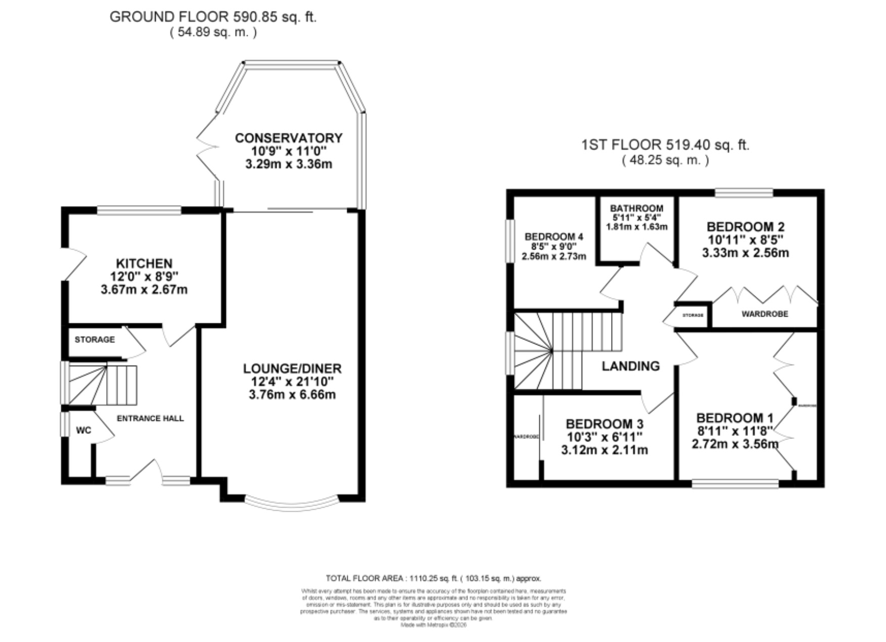 - Four generous bedrooms upstairs, three with fitted wardrobes, plus a modern bathroom with full tiling, bath/shower combo, vanity sink and W/C.