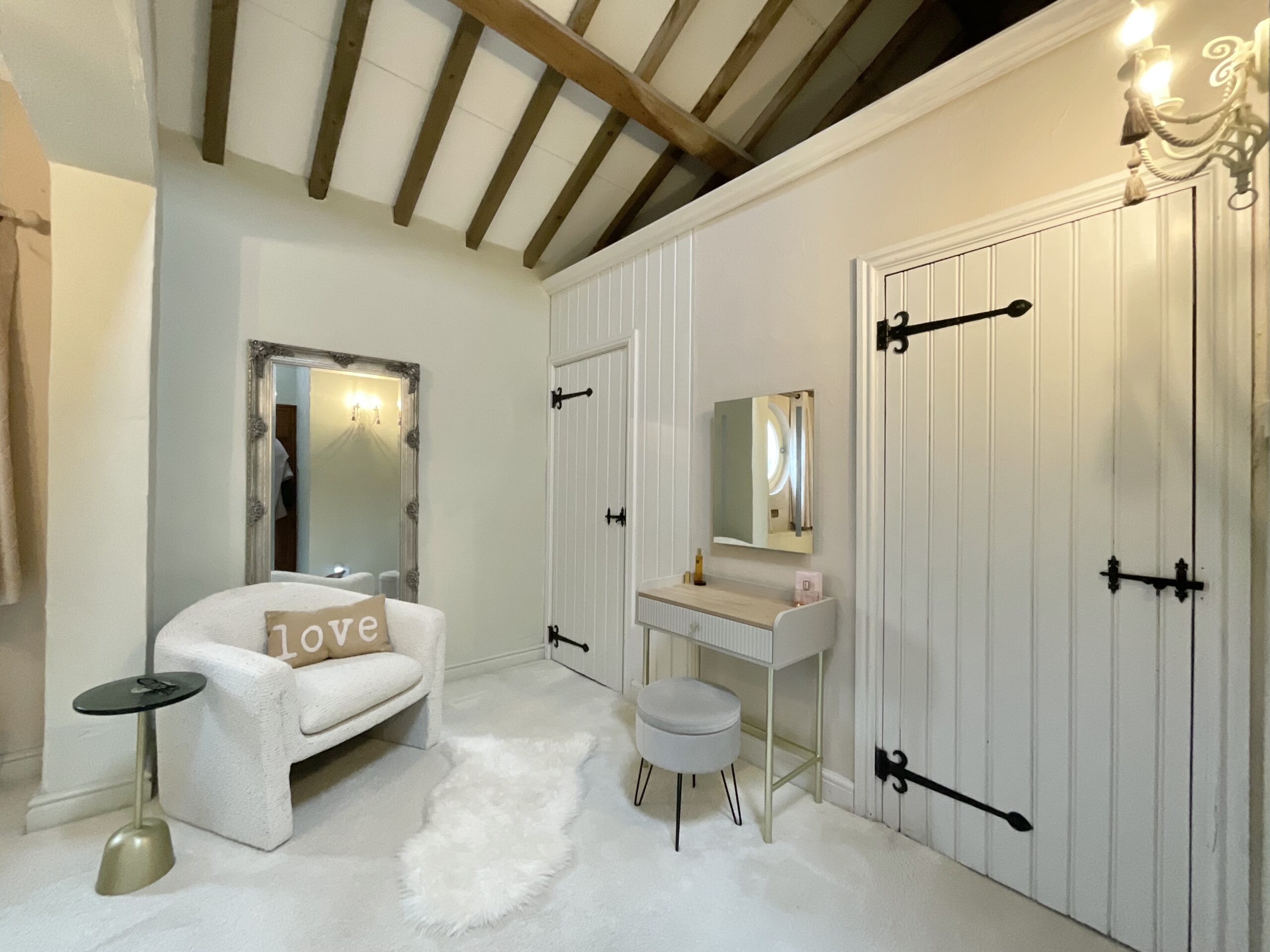 Ascending the staircase to the first floor, a light-filled galleried landing awaits, complete with vaulted ceilings, exposed beams, and a balcony overlooking the dining area. The four double bedrooms boast further vaulted ceilings, exposed trusses, and Velux windows throughout, enhancing the accommodation and character of the property. The master bedroom benefits with the added luxury of a dressing room, walk-in wardrobe and a contemporary en-suite wet room incorporating an overhead shower, corner fitted panel bath, vanity wall mounted wash basin and WC. Further features include a lovely mezzanine level in the second bedroom. The first floor is topped off with a high specification main family bathroom that exudes opulence with twin sinks, a panel bath with an overhead shower, WC and attractive slate tiled flooring and walls. Every corner of this property exudes luxury and attention to detail, offering a harmonious blend of modern fittings and timeless charm.