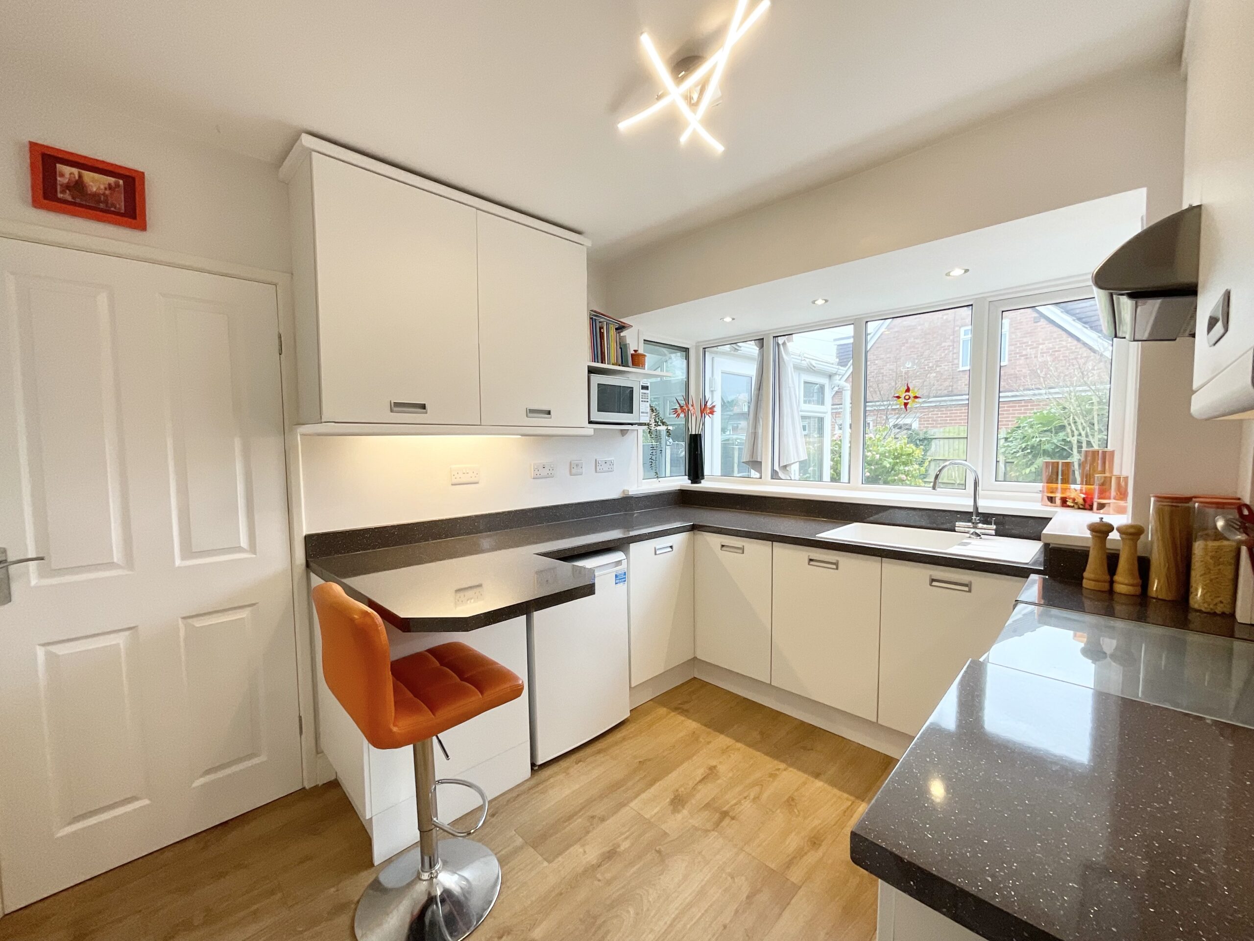 First stop on the line… the main carriage of the home. Step inside and you’ll arrive at a spacious open-plan living and dining room, the heart of the home and the perfect place to settle in. At the centre of the room sits a traditional fireplace surround housing a cosy gas stove, creating a warm and welcoming focal point for those relaxing evenings when the day winds down. To the front, a beautiful bay window stands proud, while to the rear glazed French doors lead you through to the conservatory. Bright and airy, this lovely space hosts another set of glazed French doors opening out to the garden, bringing the outdoors in. As the journey continues down the track, the next stop is the kitchen, where style and practicality travel side by side. Here you’re greeted by sleek modern white cabinets paired with contrasting worktops, offering plenty of storage and generous space to prepare your favourite meals. There’s even a handy breakfast bar, the perfect little platform for a quick coffee before the day leaves the station. The kitchen is well equipped too, featuring an integrated oven and four-burner gas hob with cooker hood above, an integrated dishwasher, and a ceramic sink with drainer, along with space for additional appliances.Just off the kitchen you’ll find a very handy utility room, a practical little carriage along the route designed to keep everyday life running smoothly. Fitted with additional cabinets for extra storage and space for further appliances, it’s the perfect place to keep household tasks neatly tucked away, keeping the rest of the home running like a well-timed train service.