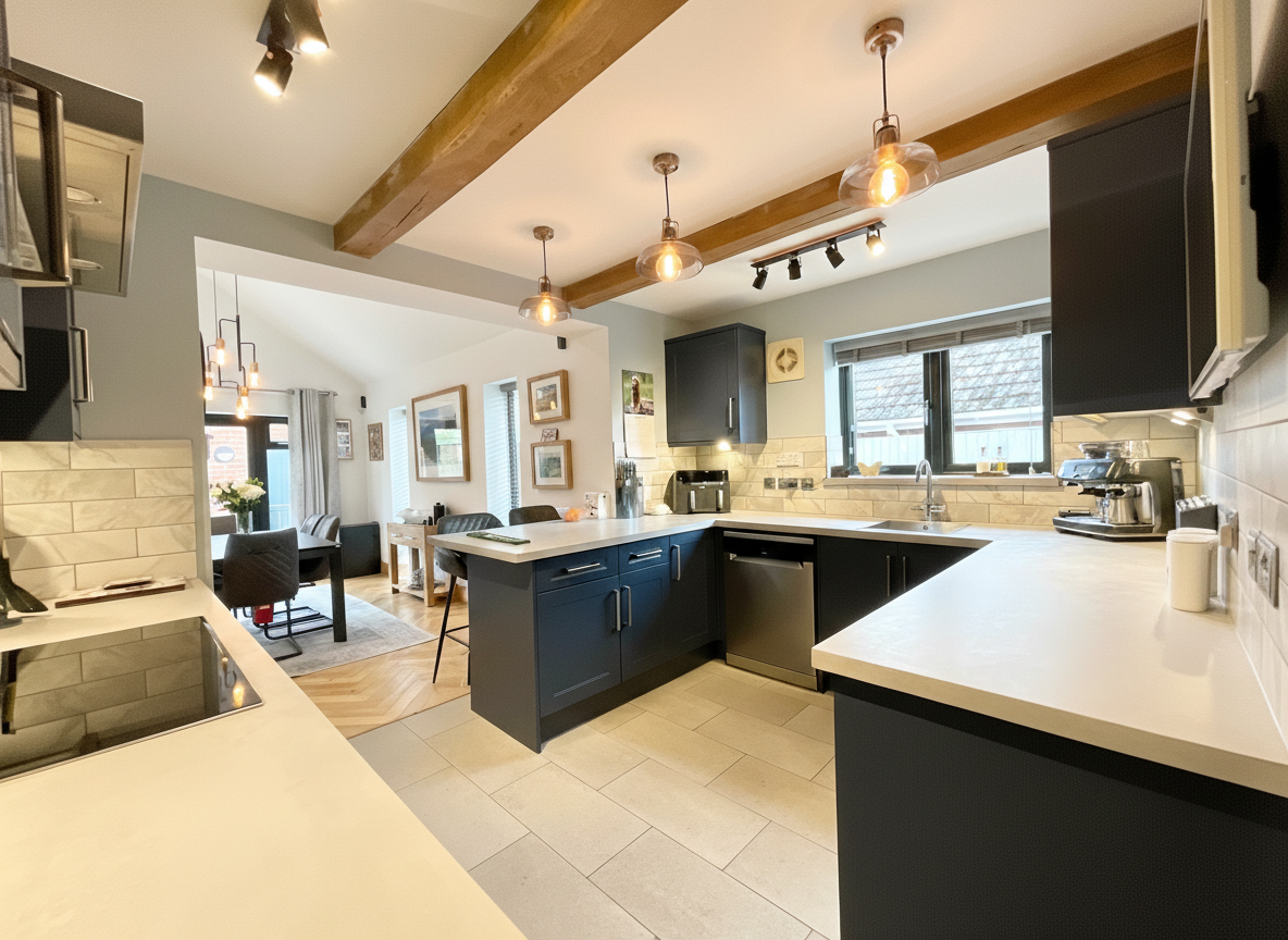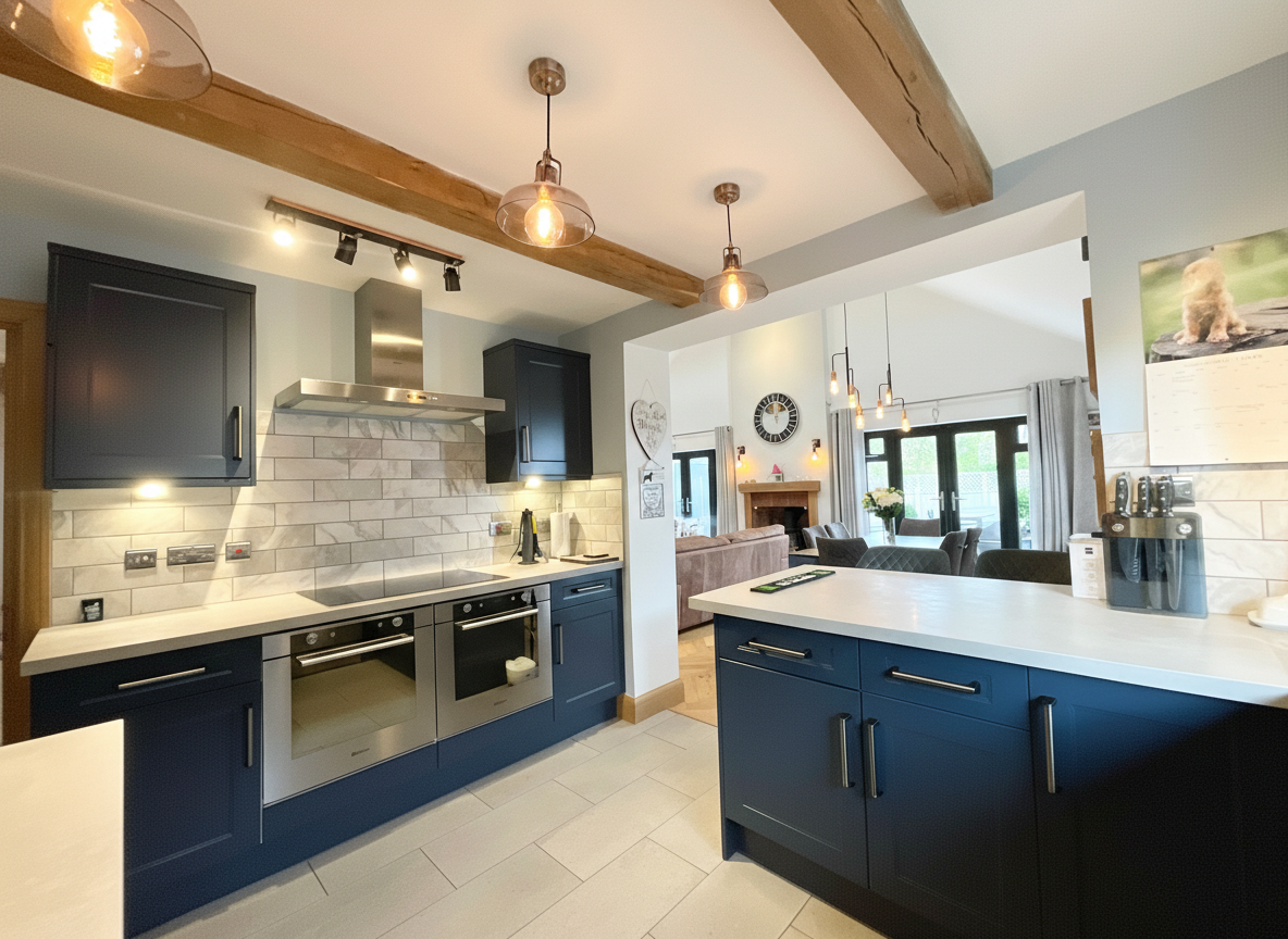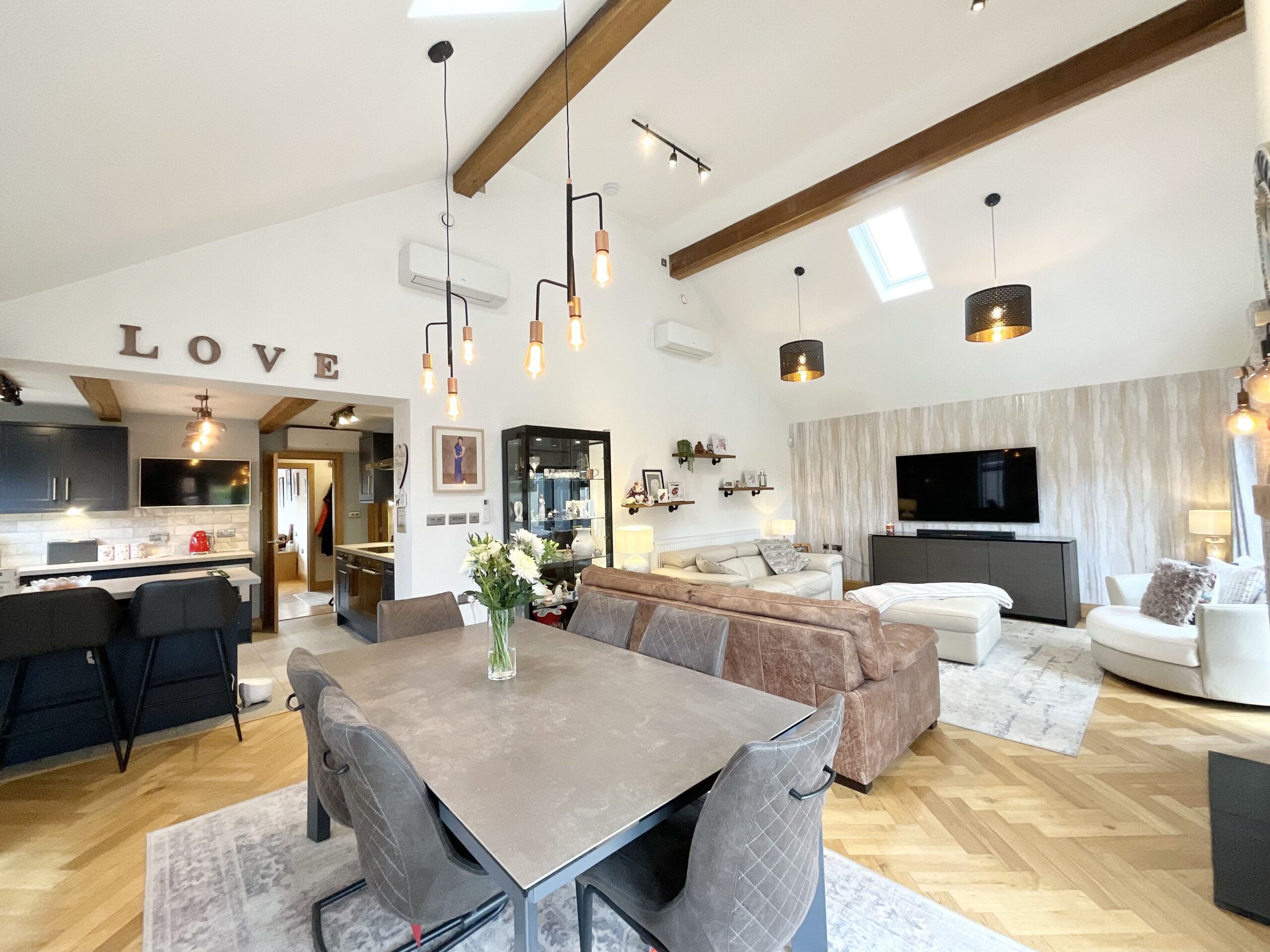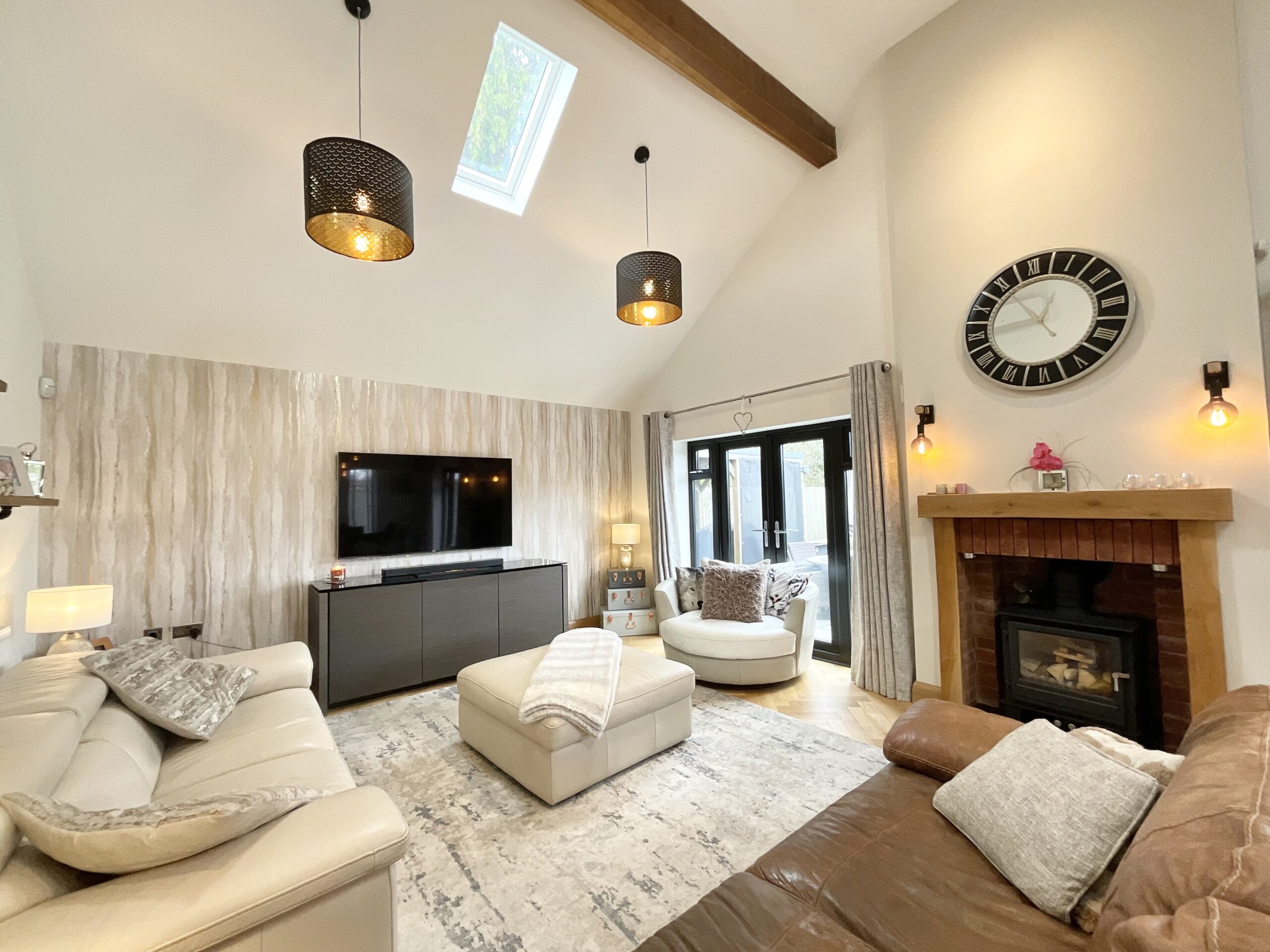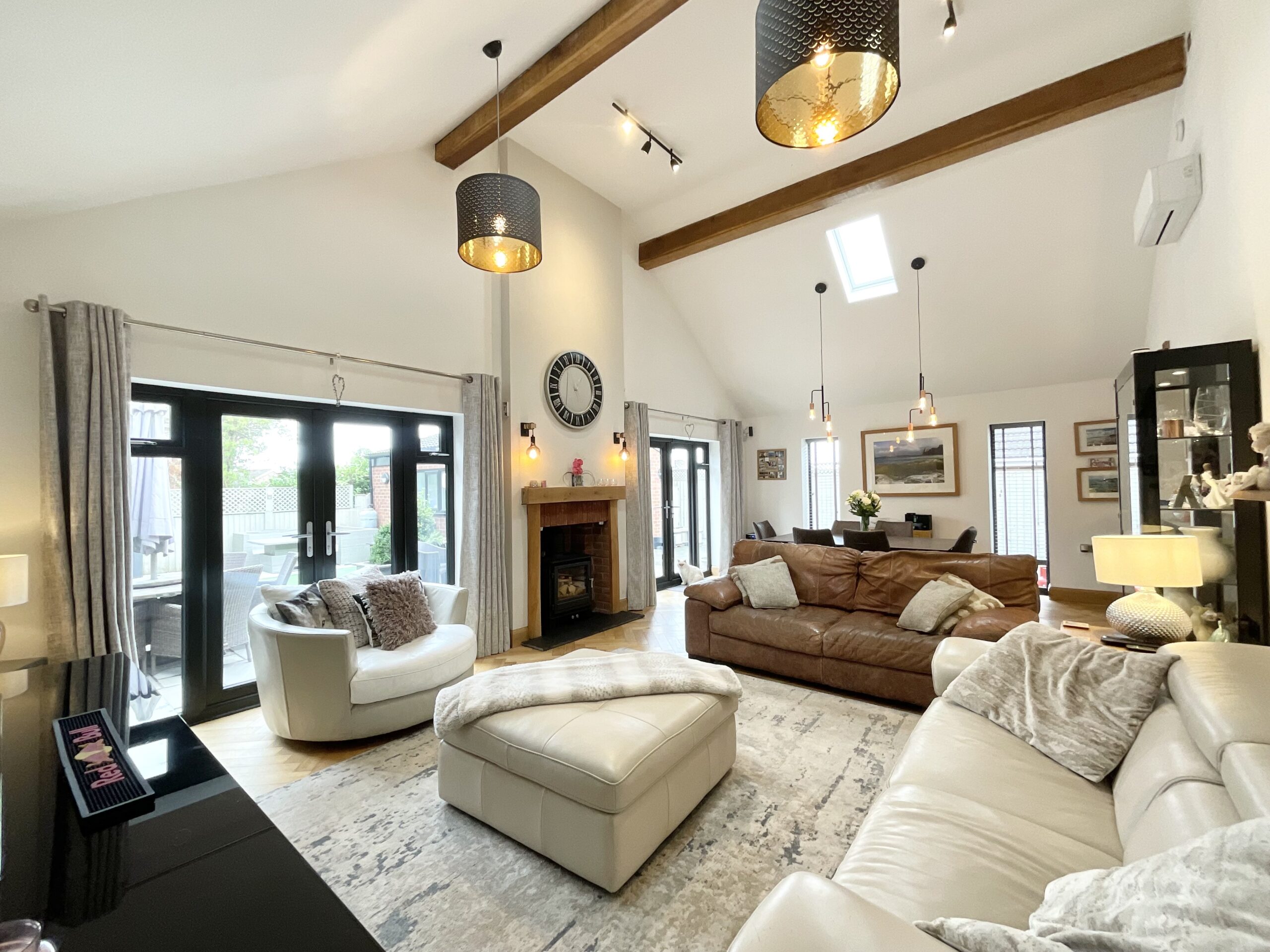 - Expansive open-plan living/dining room with log burner, French doors, modern kitchen with navy cabinetry and integrated appliances, utility with fridge freezer and room for more!