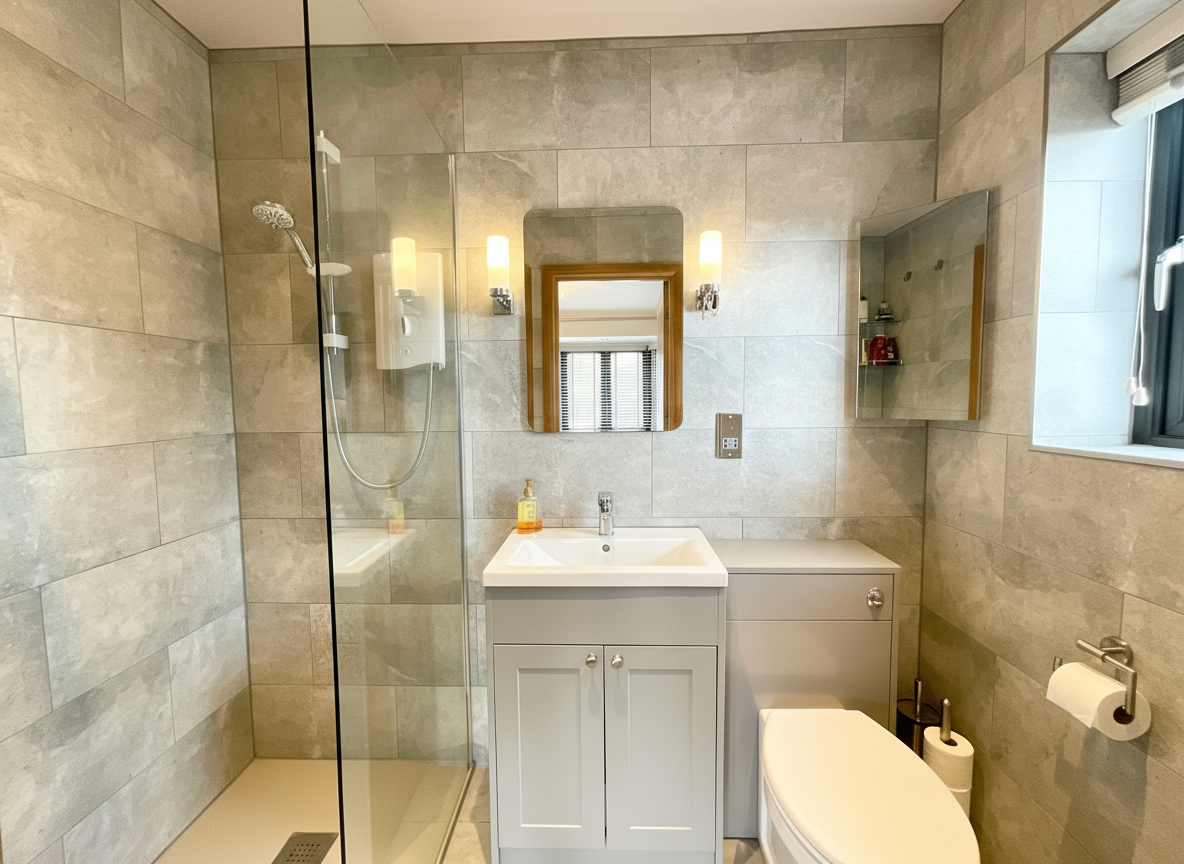 All three generously sized bedrooms come with fitted wardrobes, ready to host restful retreats after a day of exploring your new home. One bedroom boasts a luxurious ensuite shower room with electric walk-in shower, vanity wash hand basin, WC, and modern tiling, whilst the other bathroom offers a panelled bath, sleek shower, WC, and vanity basin, combining style with practicality.