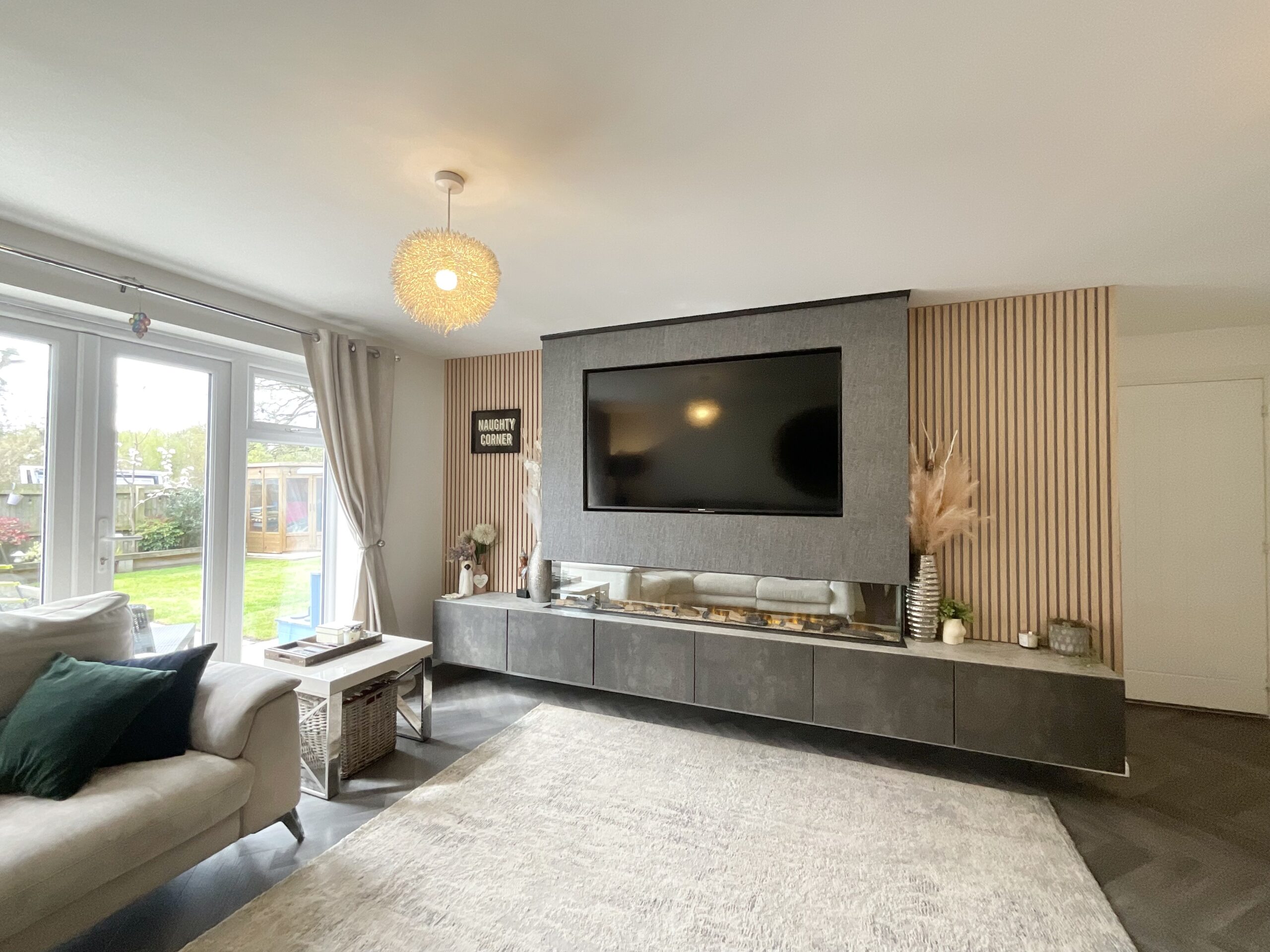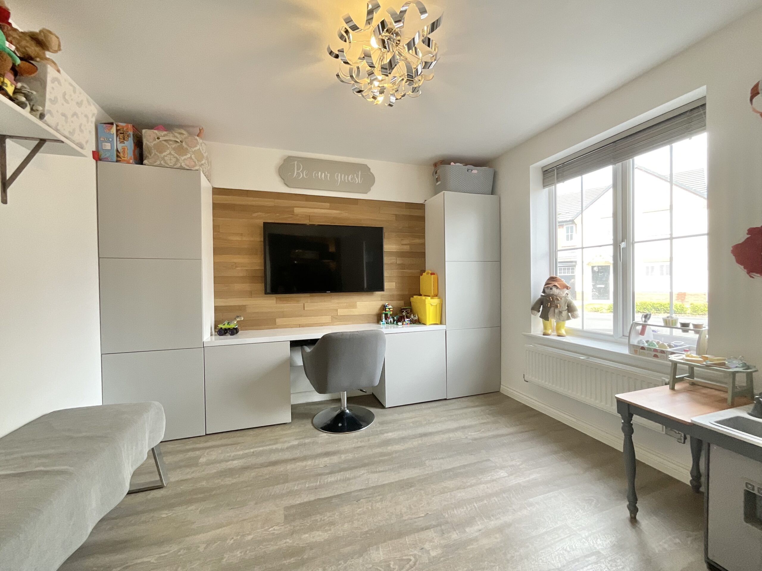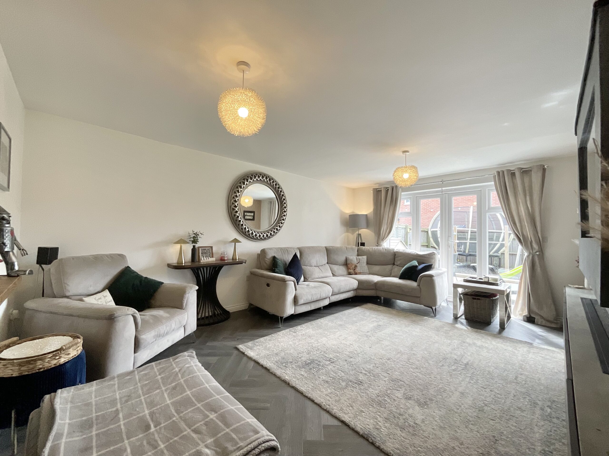 Upon entering, you are welcomed by a generous entrance hall that provides access to the principal ground floor rooms. The living room is an impressive and spacious area, ideal for both everyday relaxation and entertaining, with ample room for a variety of furniture layouts. To the rear, the kitchen/diner forms the heart of the home, offering a sociable and practical space for family life. The kitchen is contemporarily designed with sleek cabinetry and a range of integrated appliances, including a double oven, dishwasher, fridge, freezer, and a four-ring gas hob. There is plenty of worktop space alongside a dedicated dining area, making it perfect for both casual meals and hosting.
