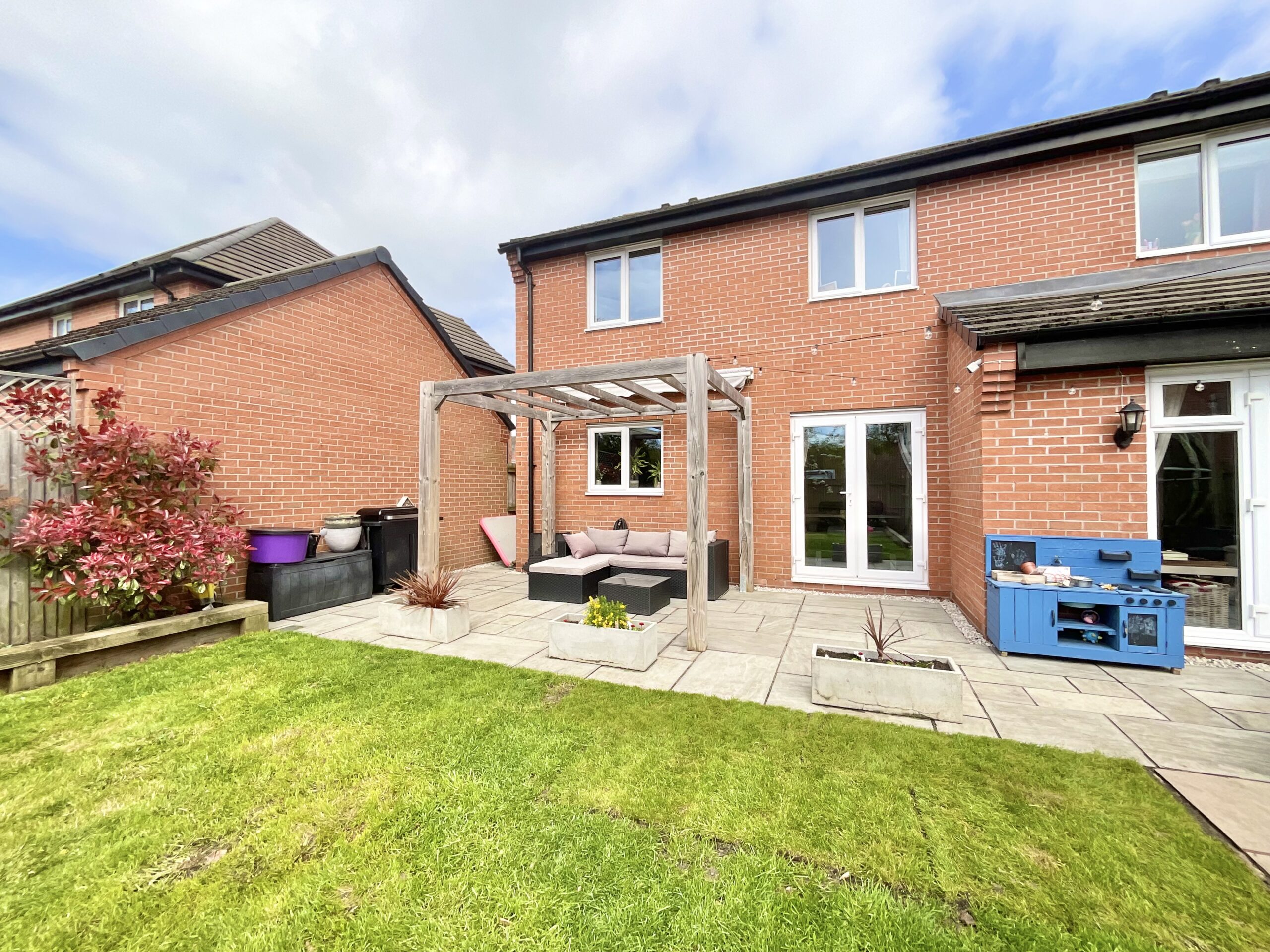 Externally, the home is equally well suited to family living. To the front, a large driveway provides off-road parking for multiple vehicles. To the rear, the garden has been thoughtfully designed to offer a variety of usable spaces. A patio seating area, positioned beneath a pergola and enhanced by an awning, creates a sheltered and inviting space for outdoor dining and relaxation. This leads onto a well-maintained lawned area, ideal for children or general enjoyment, as well as a chipped section currently used as a dedicated play area, offering a safe and practical environment for families.