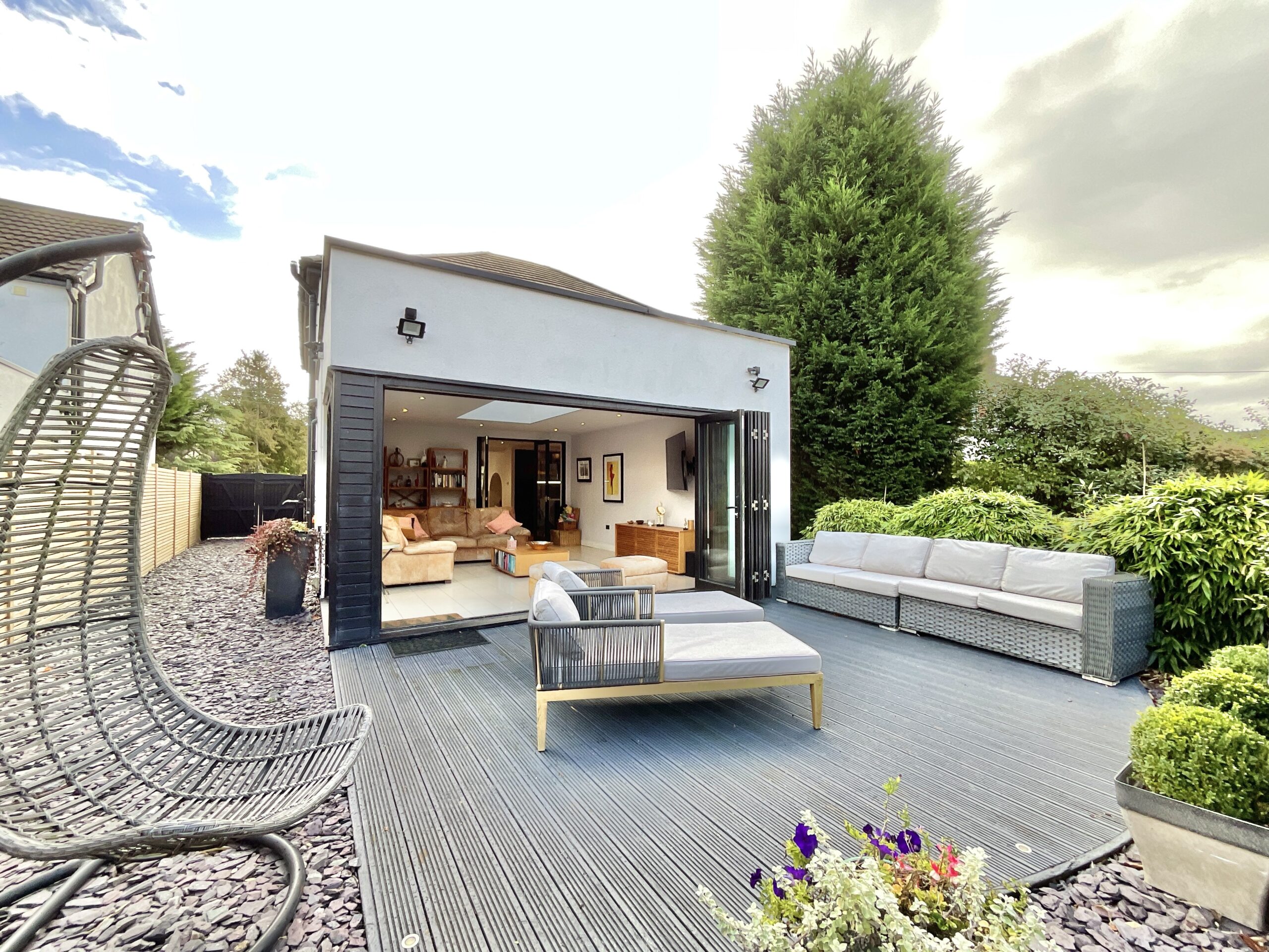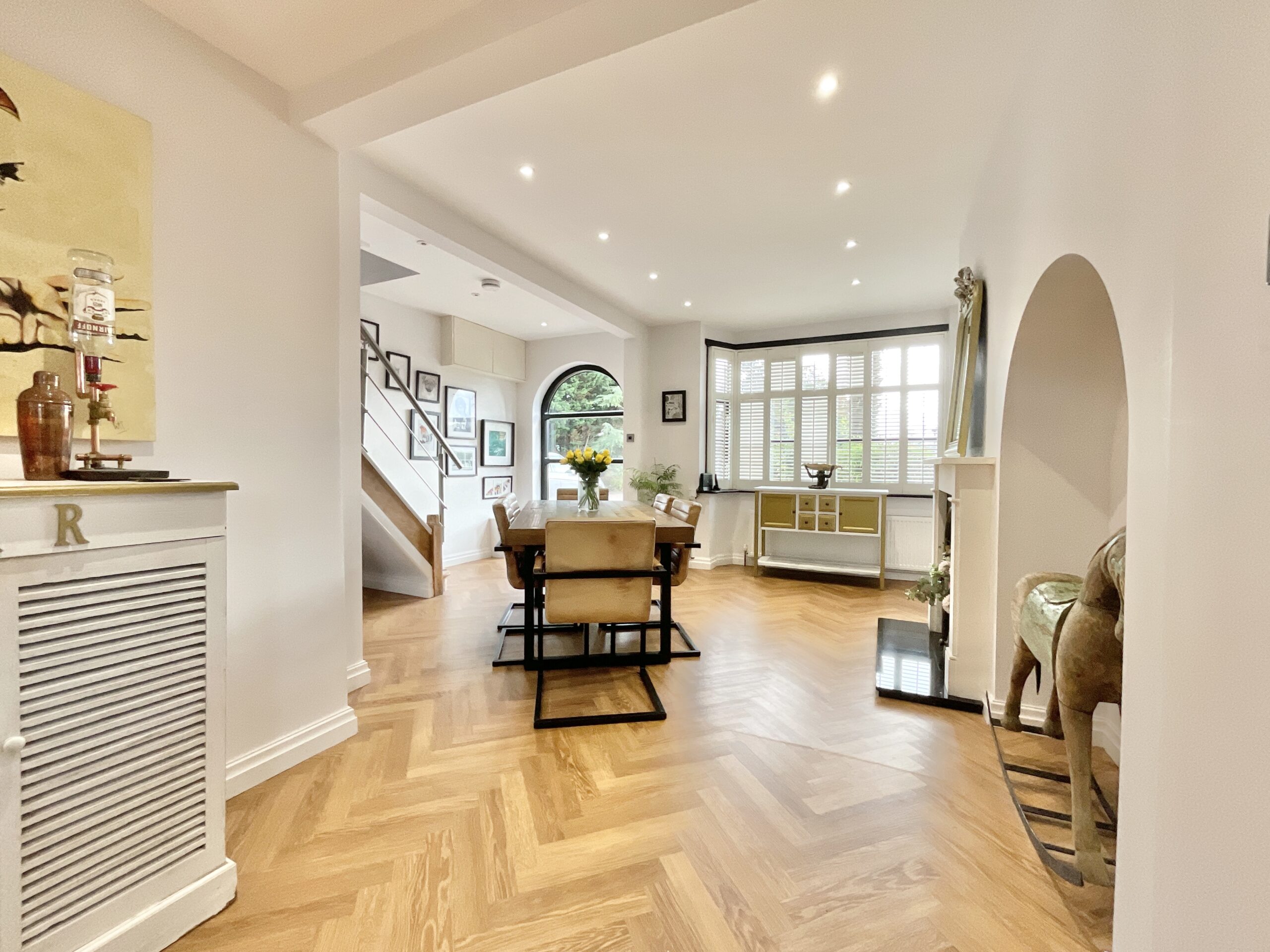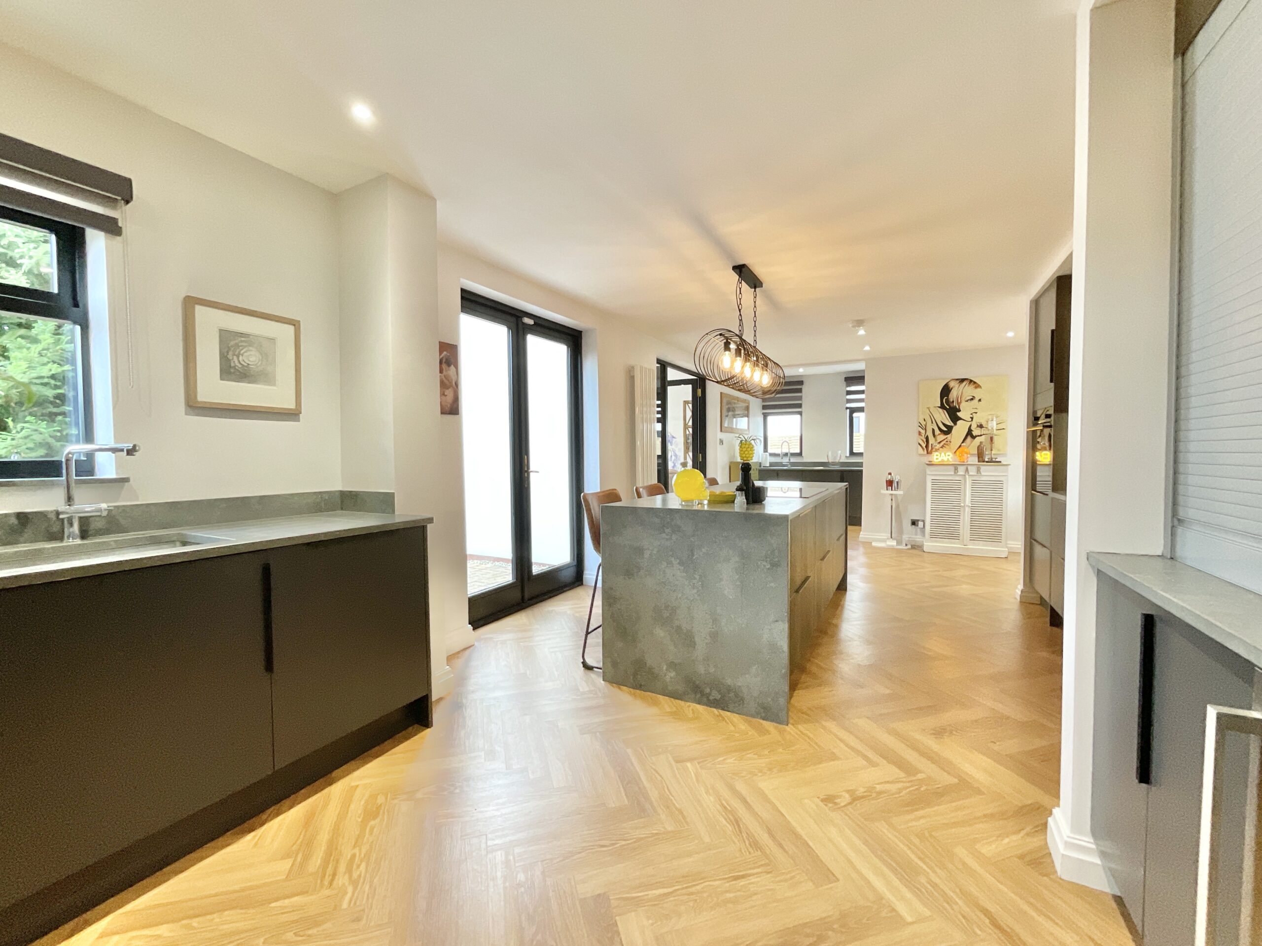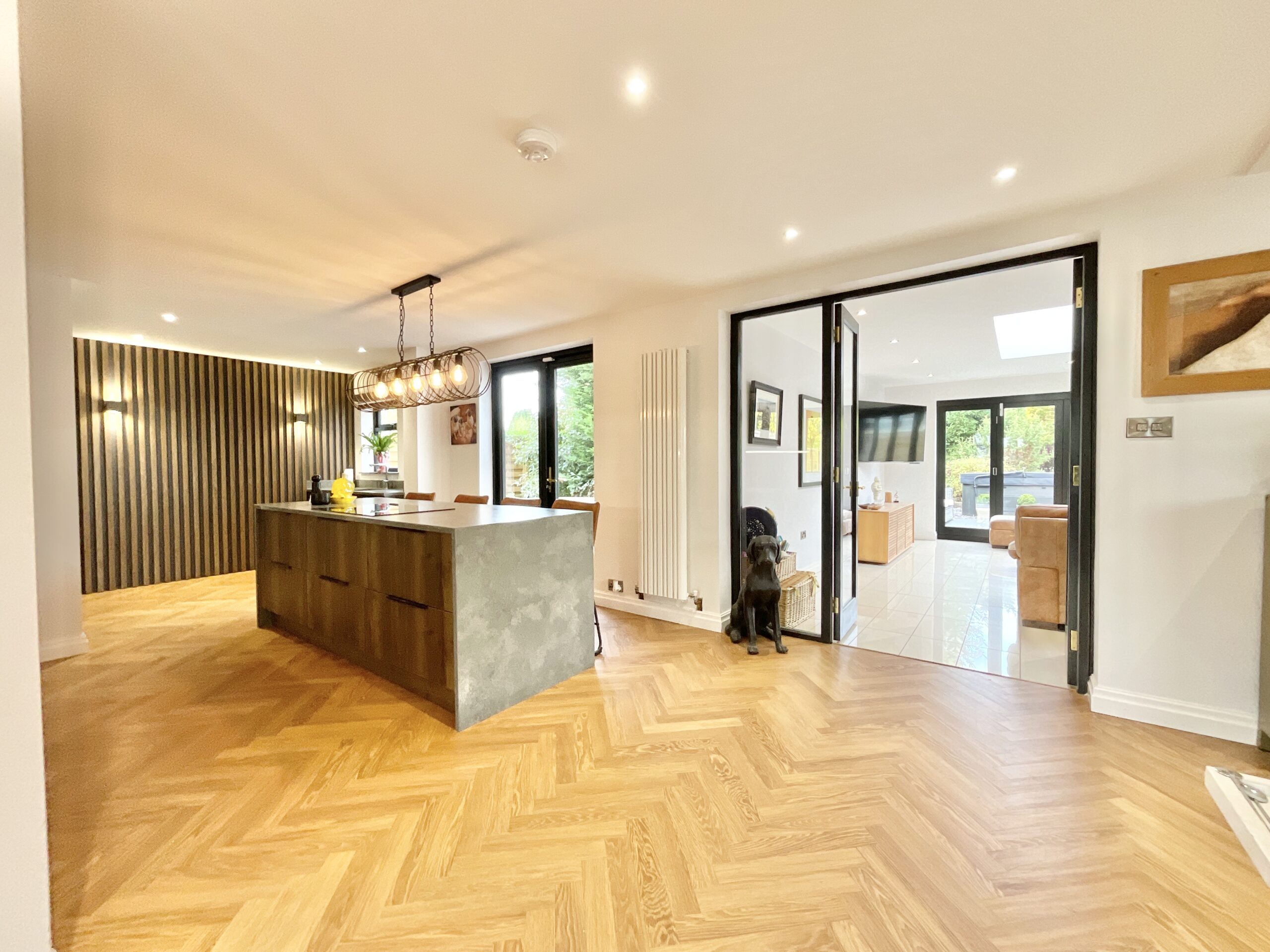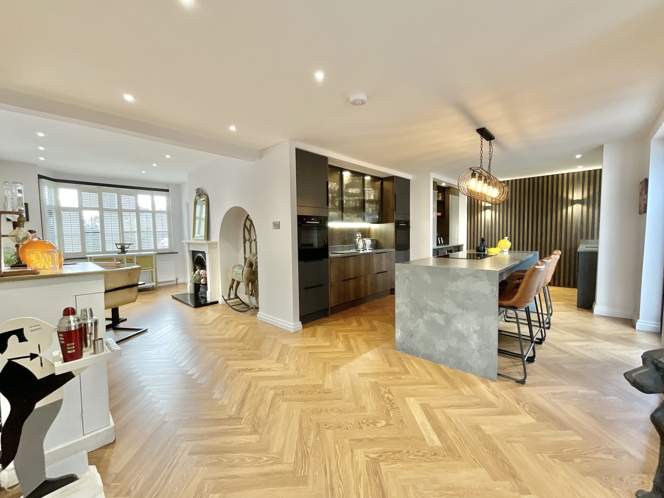 From the moment you arrive, this three-bedroom, two-bathroom retreat sets the scene for relaxation and luxury. A spacious driveway offers plenty of “first-class” parking, framed by a beautifully landscaped front garden. Step inside and feel instantly transported. The two generous reception rooms are flooded with sunshine through bay and arched windows dressed with chic plantation shutters, perfect for soaking in those golden rays. The heart of the home is the open-plan kitchen, a true showstopper featuring a sociable island, integrated appliances, modern panelling and herringbone flooring. It flows effortlessly into the dining, utility and living spaces, ideal for long, lazy brunches or lively dinner parties. The living room is your own private resort, complete with a sky lantern and bi-fold doors that open straight onto the garden, creating that seamless indoor-outdoor lifestyle we all dream of. Whether you’re hosting a soirée or simply recharging, this home delivers the perfect escape. A ground-floor cloakroom and office space keep everything practical and polished.