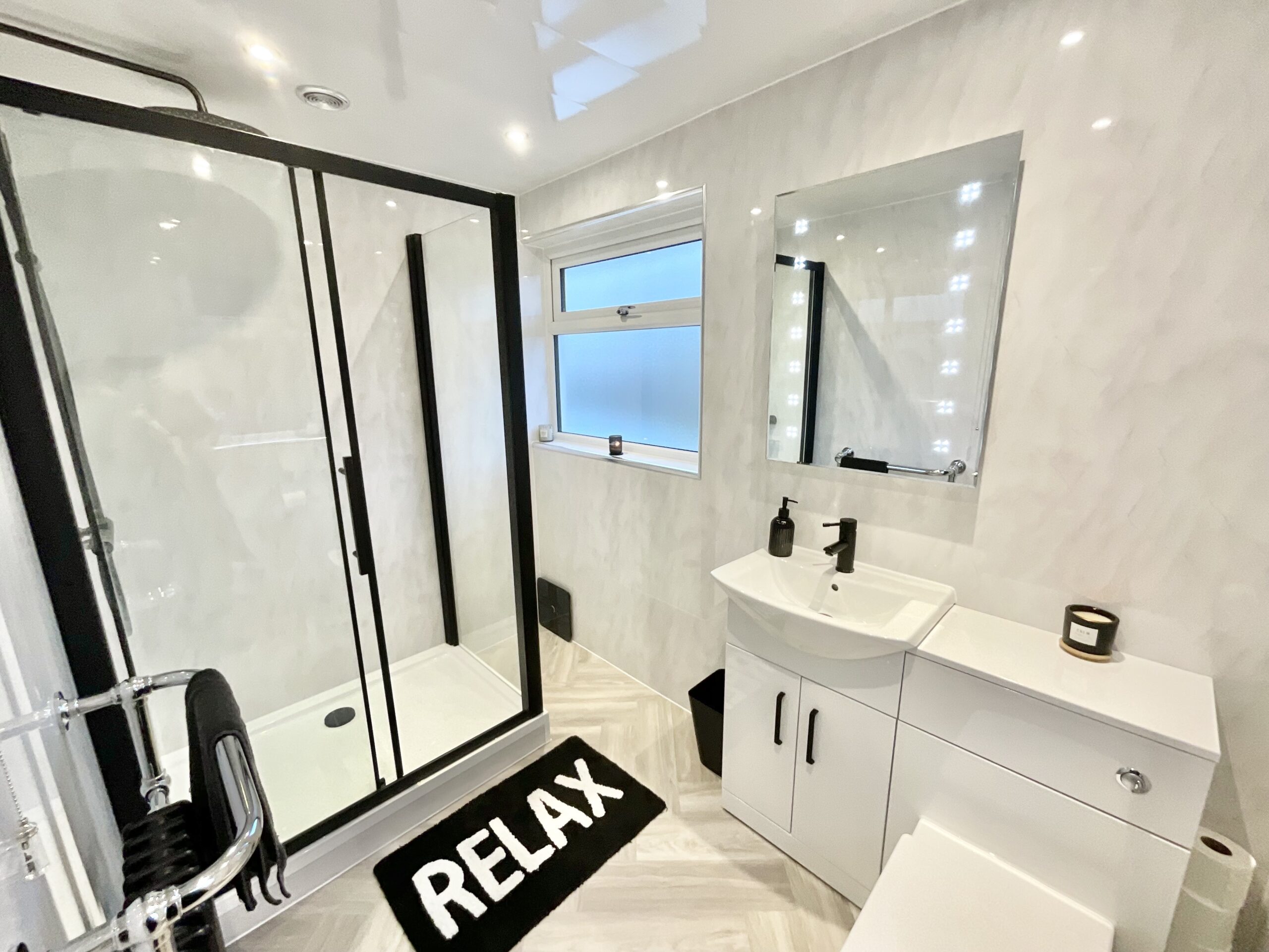 3. Three generously sized double bedrooms, accompanied by a sleek and modern shower room with floor-to-ceiling panelling, a rainfall shower, and a vanity sink and W/C.