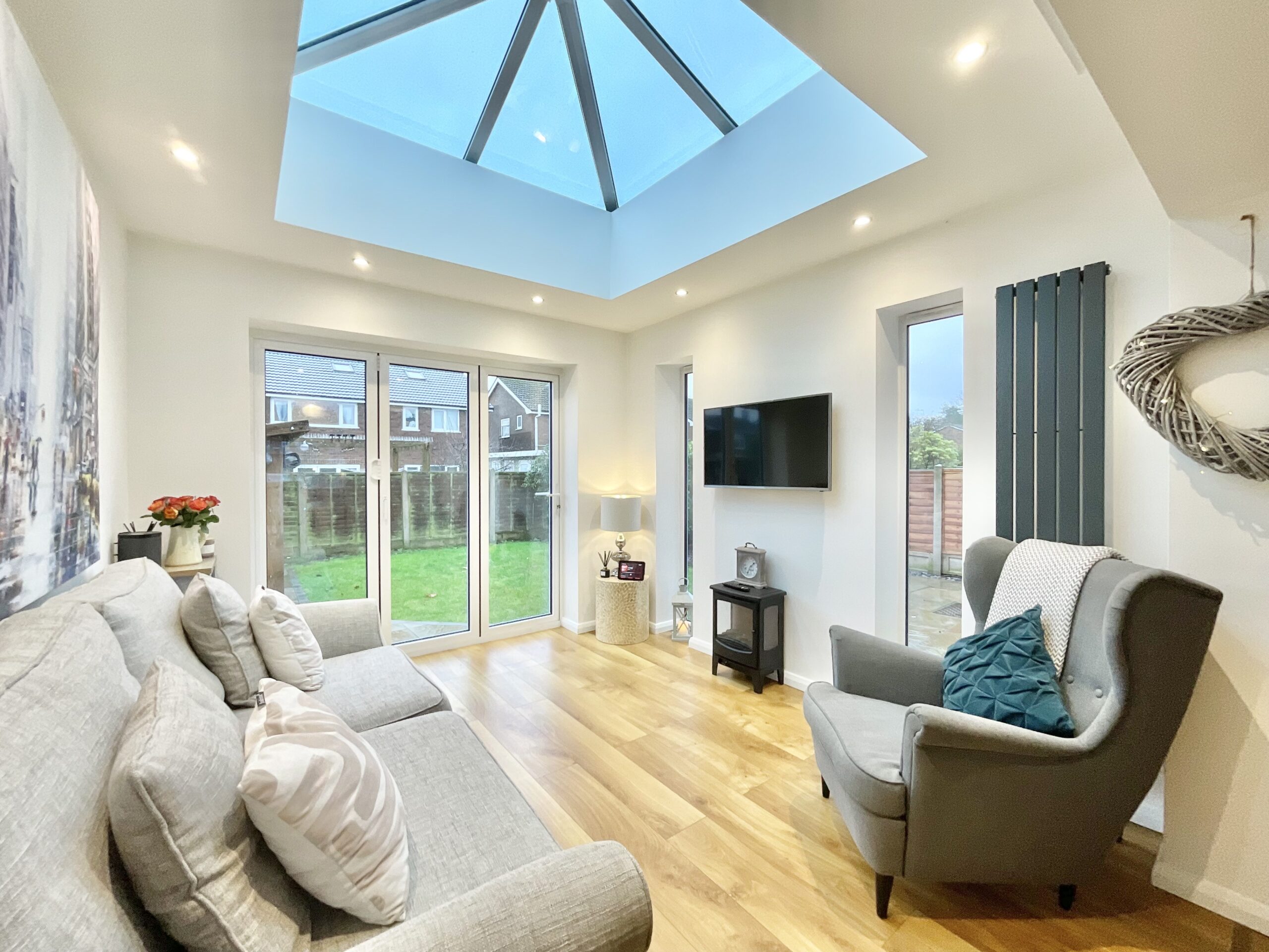 4. L-shaped open-plan kitchen/dining and sitting space with an extended sitting room with floor-to-ceiling tri-folding doors and vaulted ceiling lantern, living room with log burner, study and utility/WC