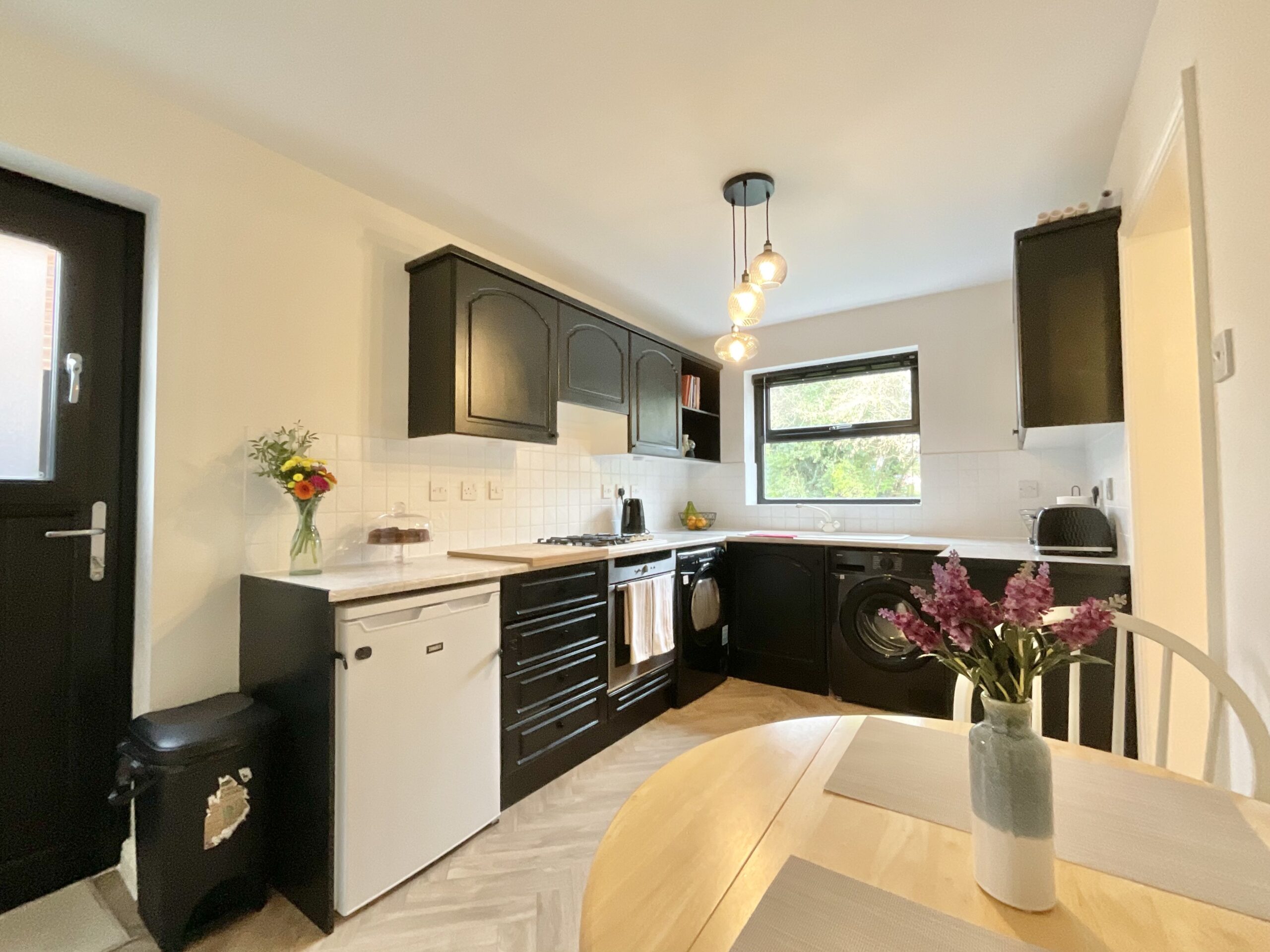 The kitchen is practical and well arranged, offering plumbing for a washing machine, space for a tumble dryer, room for an under-counter fridge, and additional space for a small table and chairs, ideal for informal dining or morning coffee.