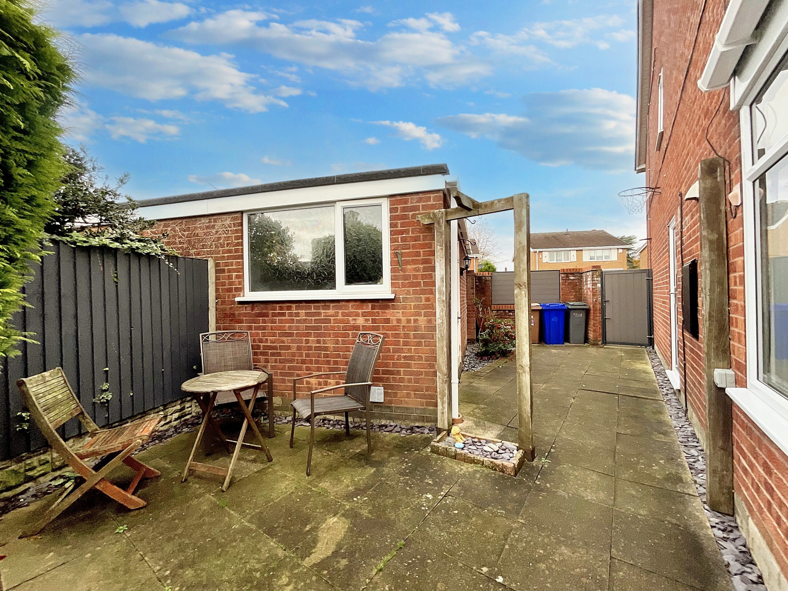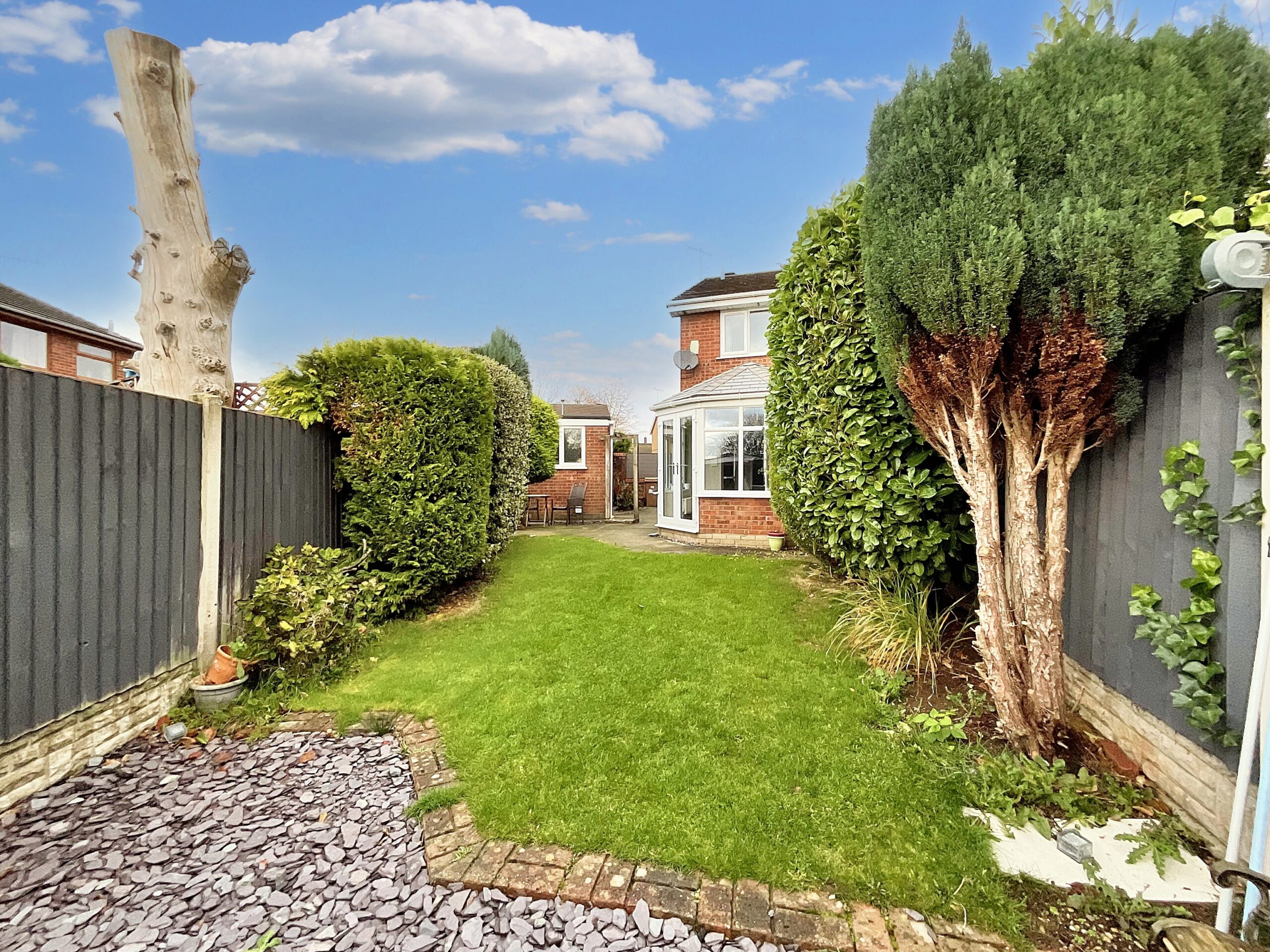 Outside, a direct South facing garden awaits with patio and slate seating areas, a lush grass lawn, mature hedging, and a patio that continues up the side of the home, offering the ideal spot for storing bins, bikes, or any outdoor essentials. To the front, a well-maintained grass lawn provides a scenic walk up to the property, while the driveway and single garage give space for off-road parking and secure storage.