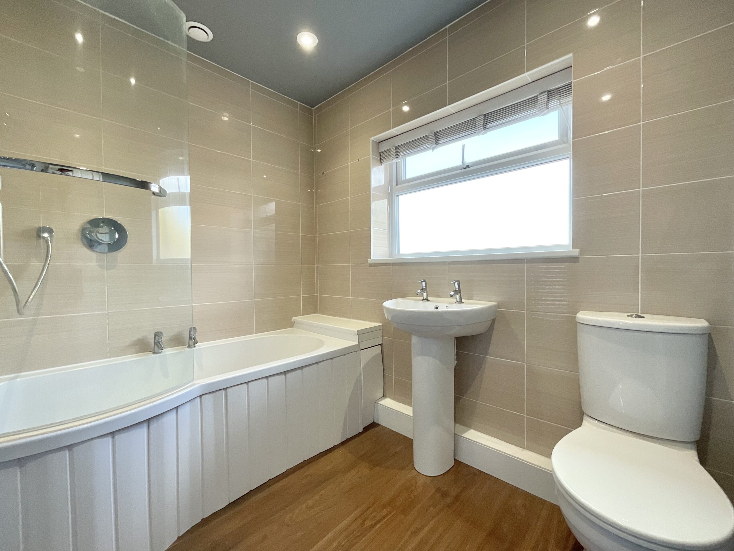 The contemporary family bathroom is beautifully finished, featuring a modern three-piece suite including a full-size bath with overhead shower, sleek fixtures, and tasteful tiling — ideal for both quick morning routines and indulgent evening soaks.