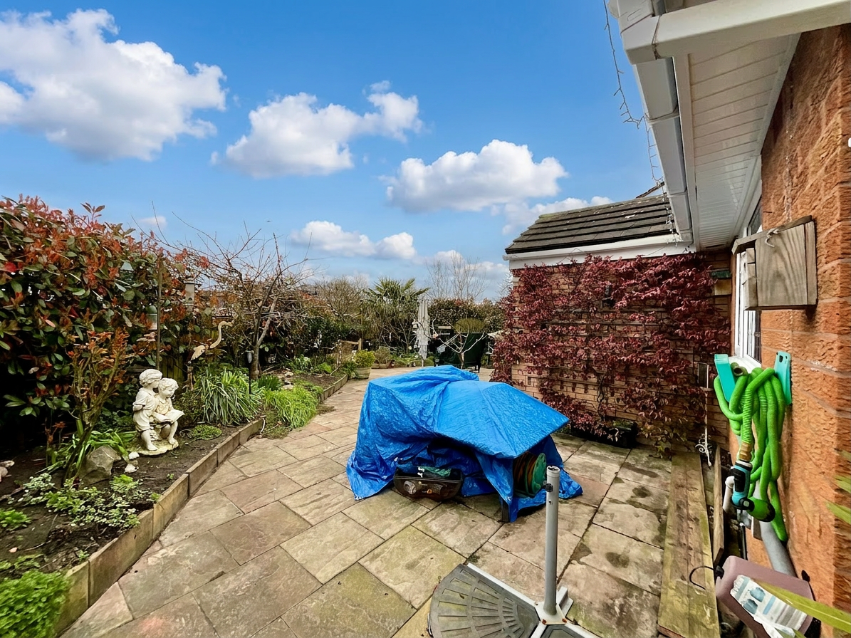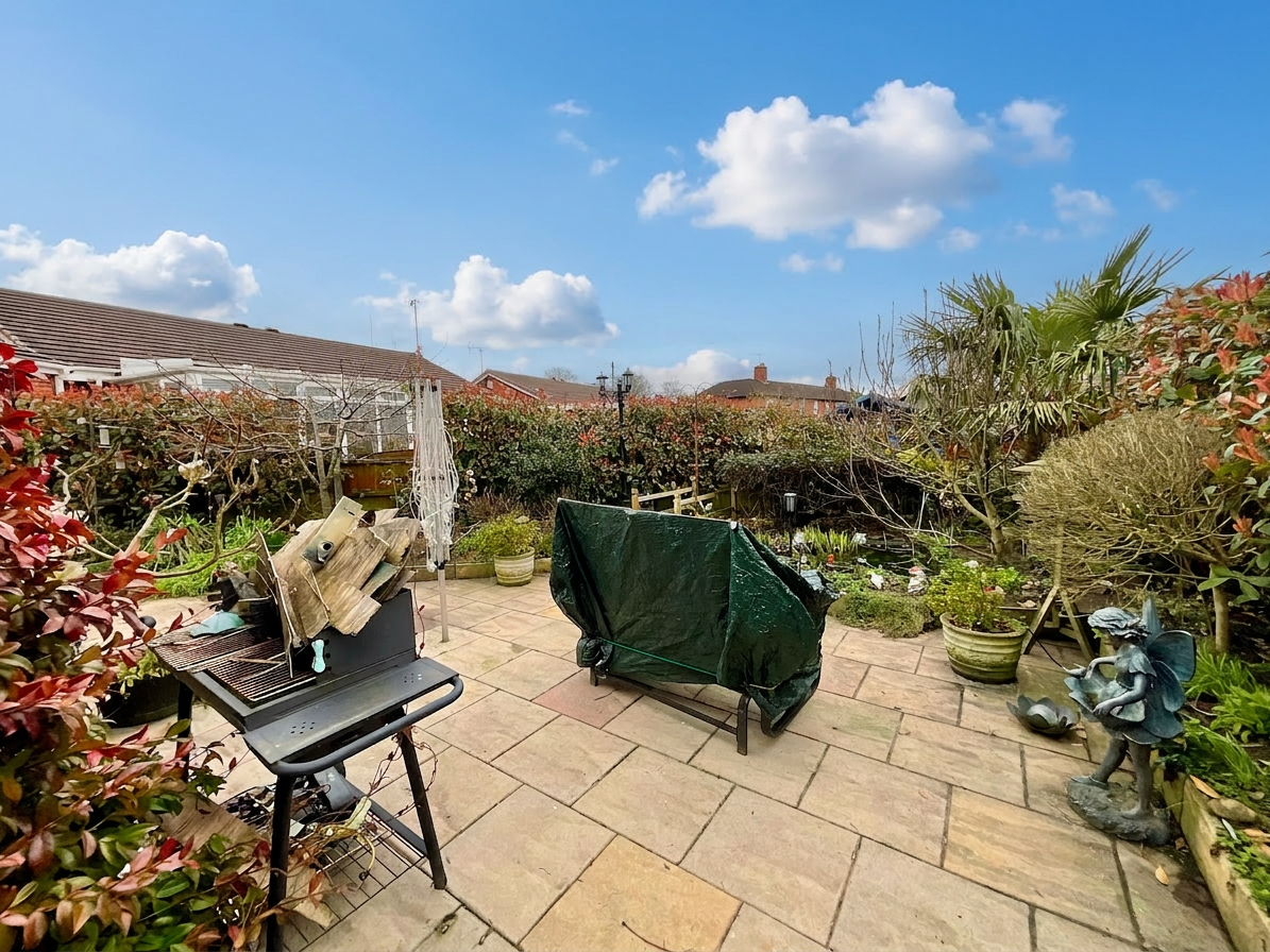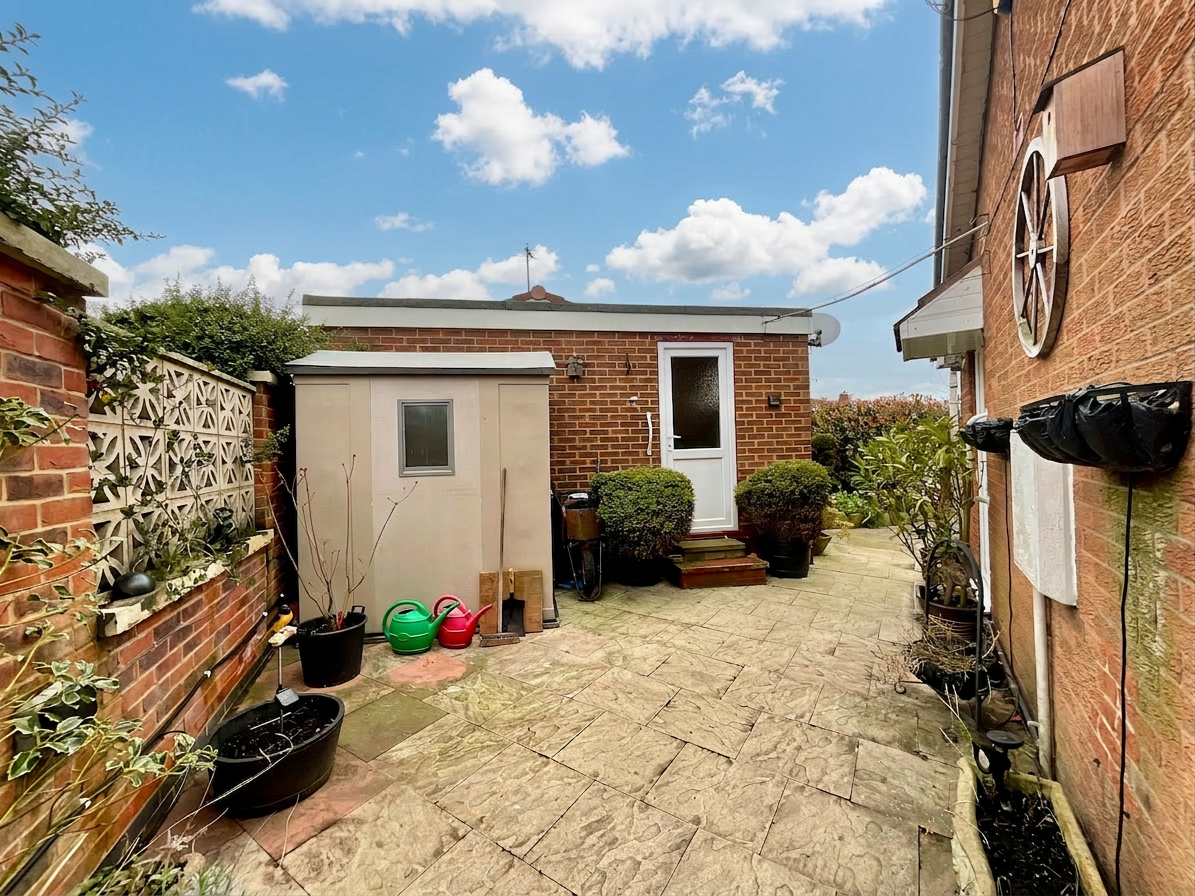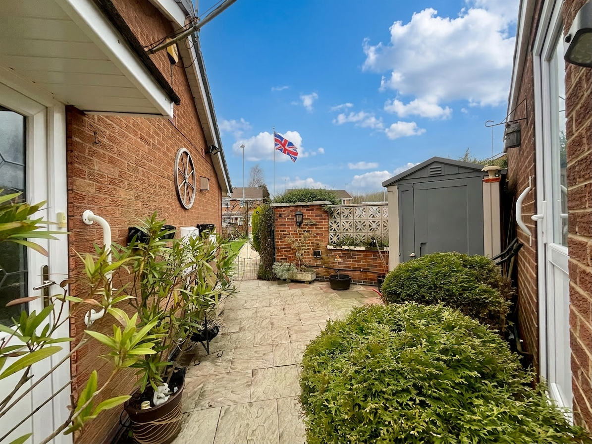 Step outside into the South-facing rear garden, a perfect enchanted escape. Laid with a patio area for low maintenance, and framed by mature shrubbery, it offers a lovely spot to relax, enjoy the sunshine, or pot a few plants. Completing the outdoor space is a handy garage, ideal for all your essential storage or parking needs, keeping everything neatly tucked away. To the front, the home features a lawned garden with a paved pathway leading to the door, creating a welcoming arrival, and a paved driveway infront of the garage provides a safe spot for your car.
