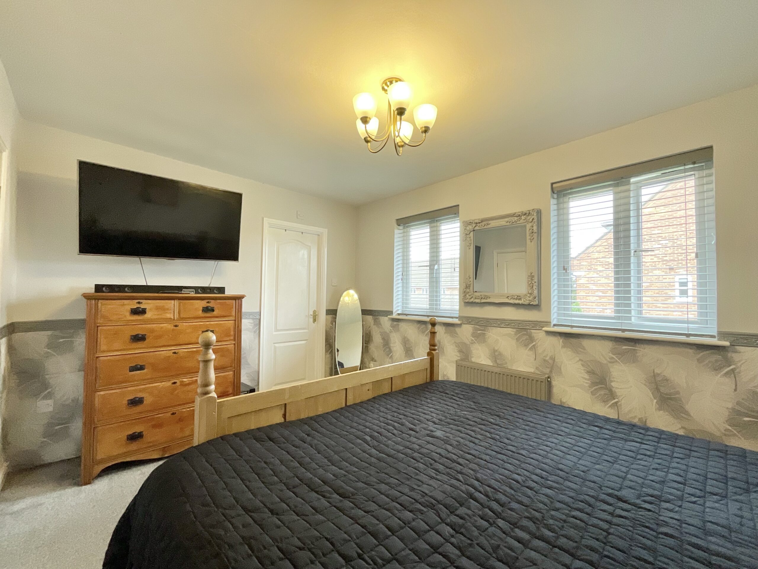 Bedroom two is another large double, flooded with natural light thanks to multiple windows and benefiting from its own private ensuite with a contemporary walk-in shower—ideal for guests, teenagers, or older children.
