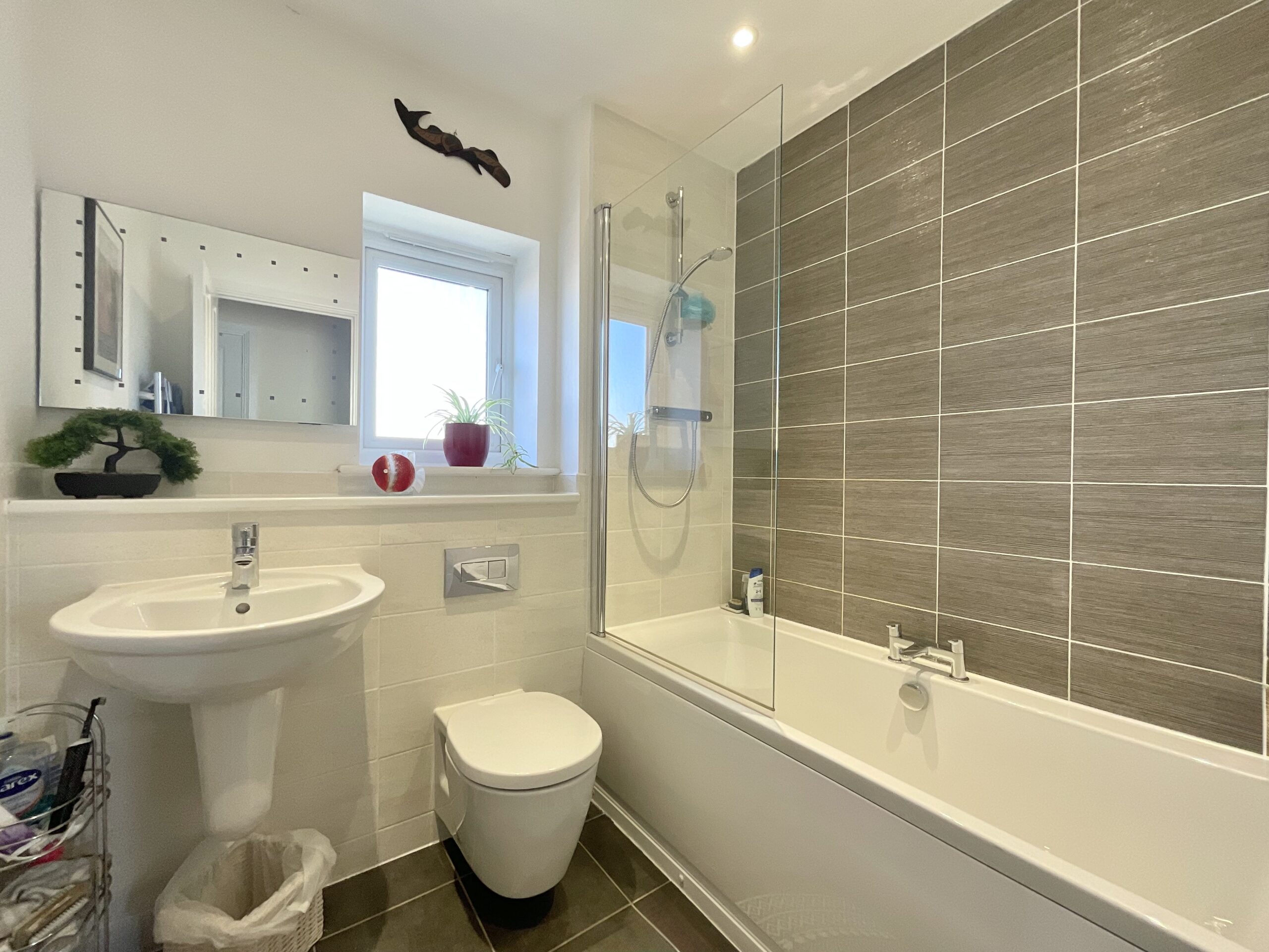 Upstairs, the master bedroom is a spacious double, enhanced by built-in wardrobes that stretch across an entire wall, offering excellent storage. The ensuite bathroom features a walk-in shower for added luxury.