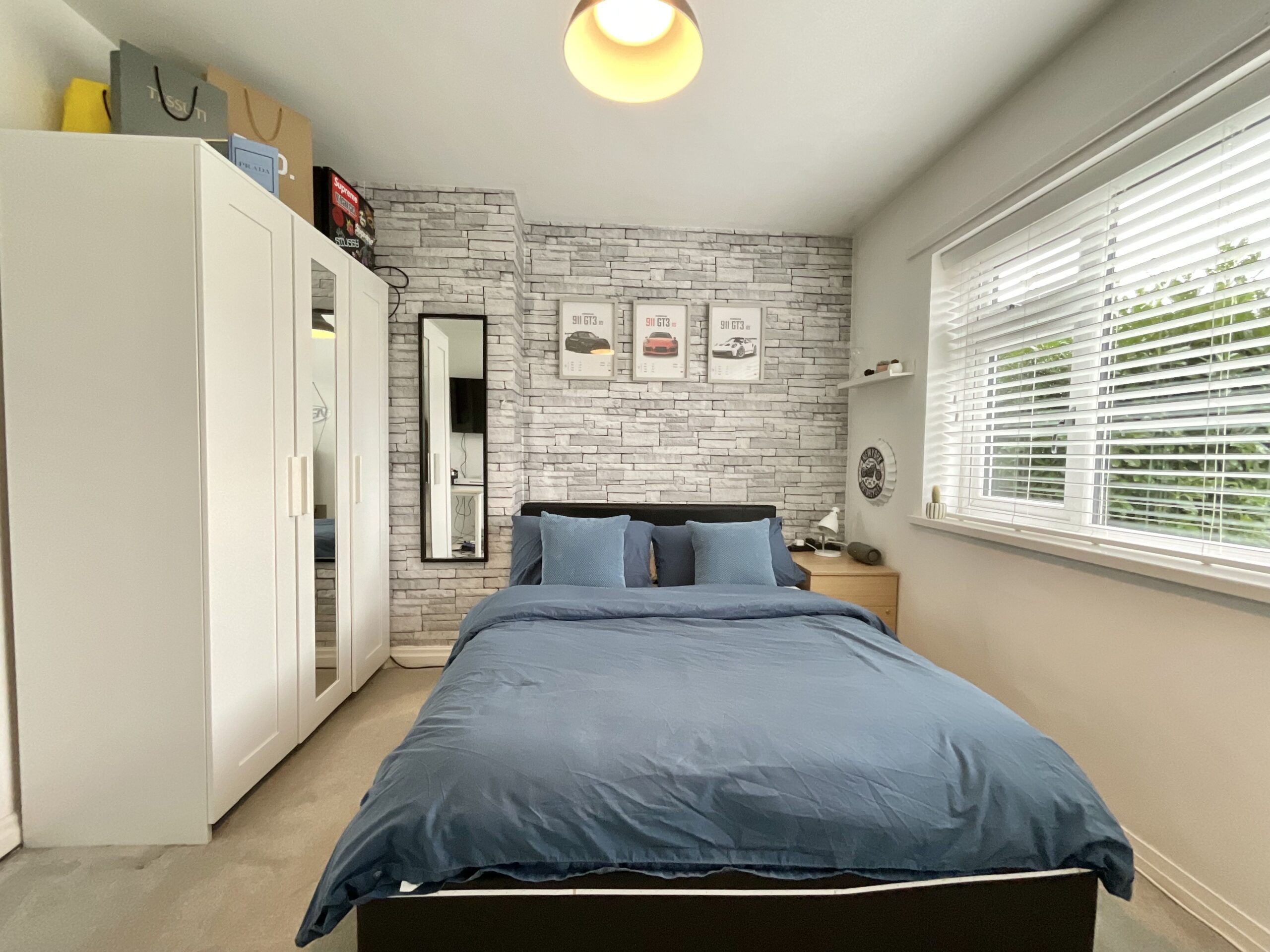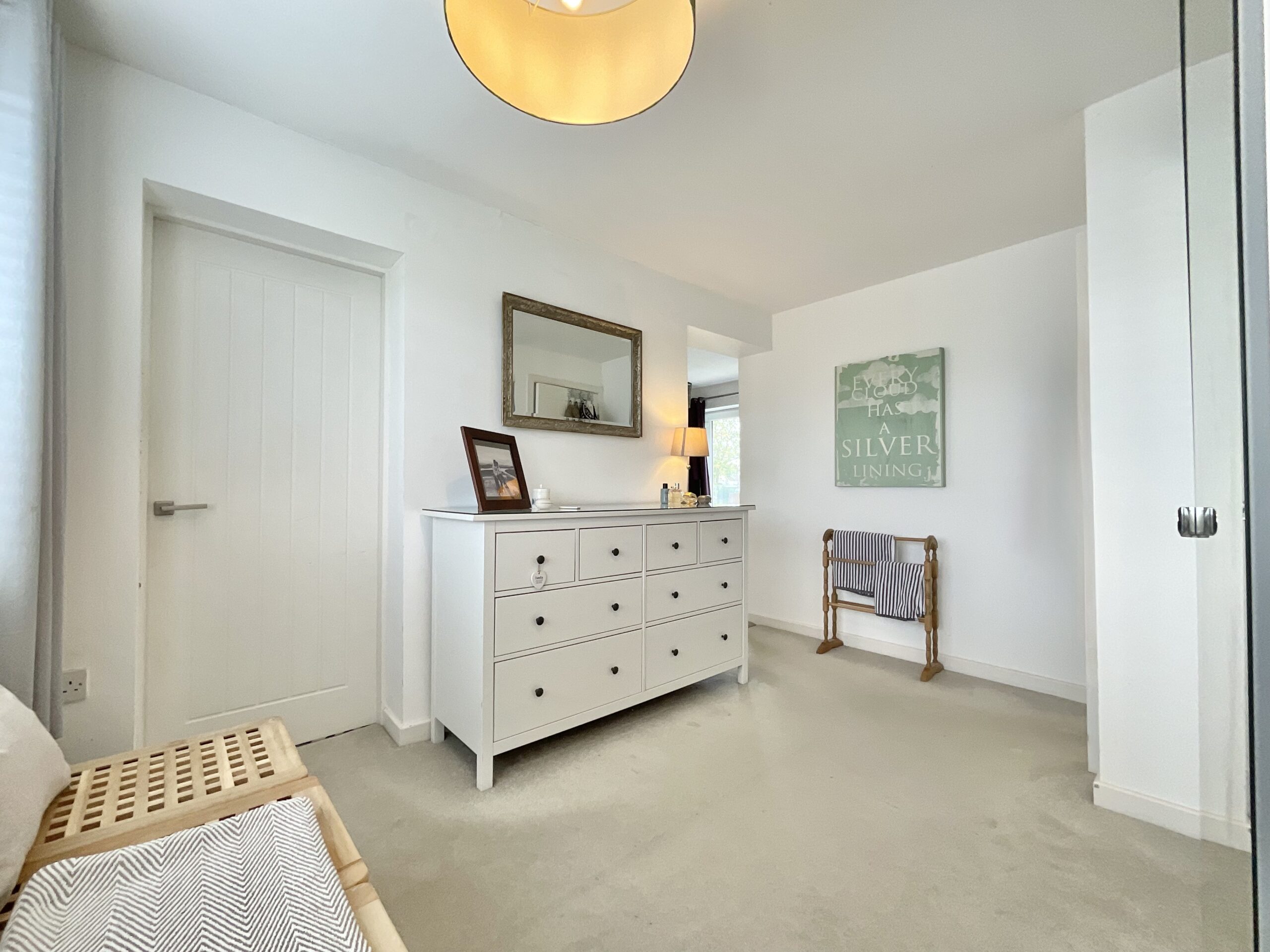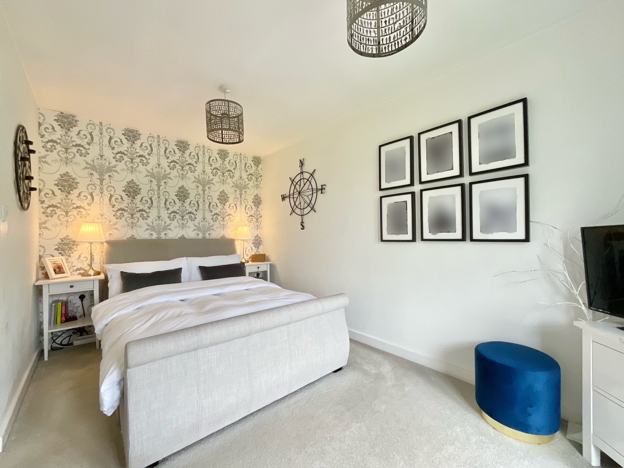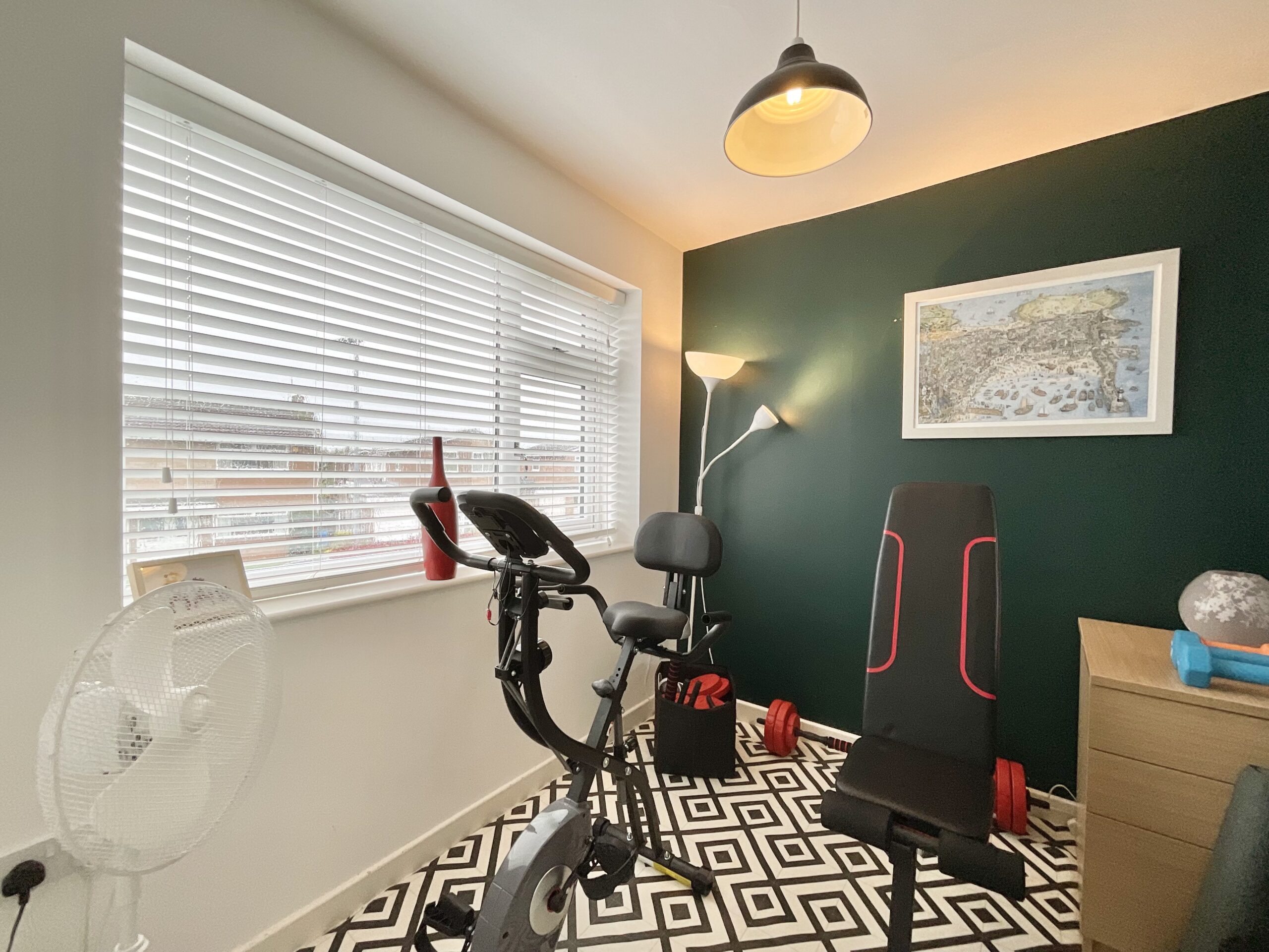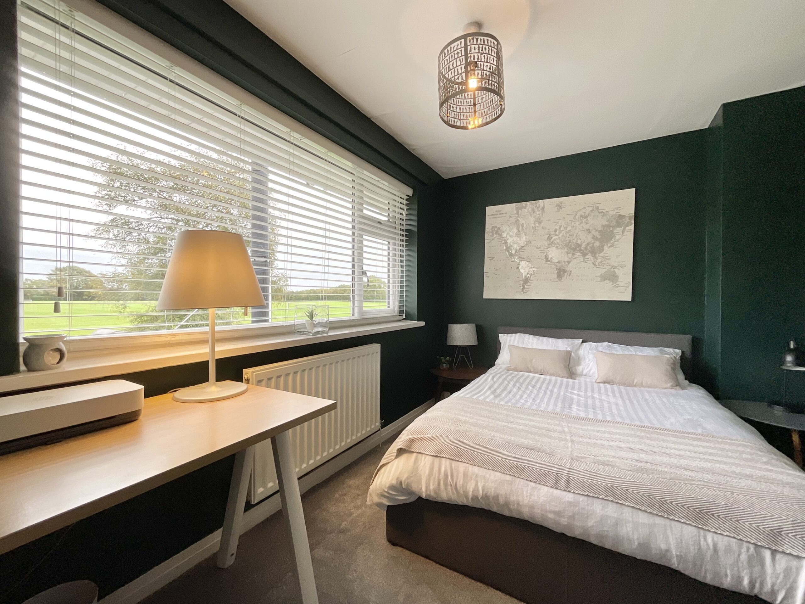 Bedroom two is a spacious double that easily accommodates a king-sized bed and wardrobes. It is currently used as a cinema room, showcasing the home’s adaptability. Bedroom three is another comfortable double with a triple wardrobe and is currently arranged as a home office, ideal for those working remotely.