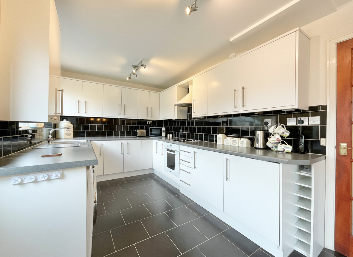 The heart of the home is the open plan kitchen diner, ideal for entertaining and everyday family life. The kitchen offers an integrated fridge and freezer, electric hob and oven, plumbing for a washing machine and space for a tumble dryer. The dining area benefits from French doors opening onto the rear garden, allowing plenty of natural light and seamless indoor–outdoor living.