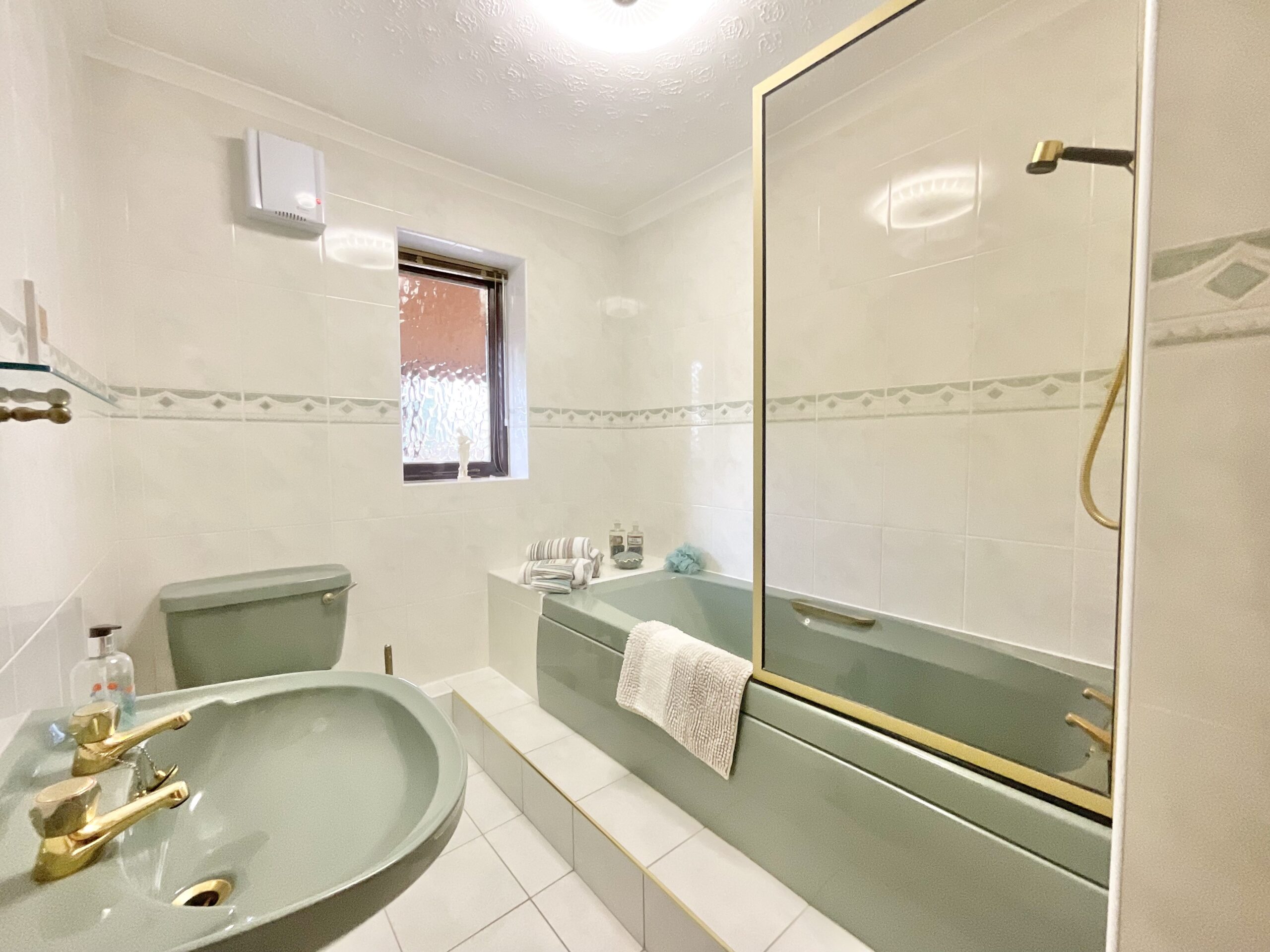 The family bathroom, finished in a soft sage green, includes a bath with mains shower, WC, and wash basin.