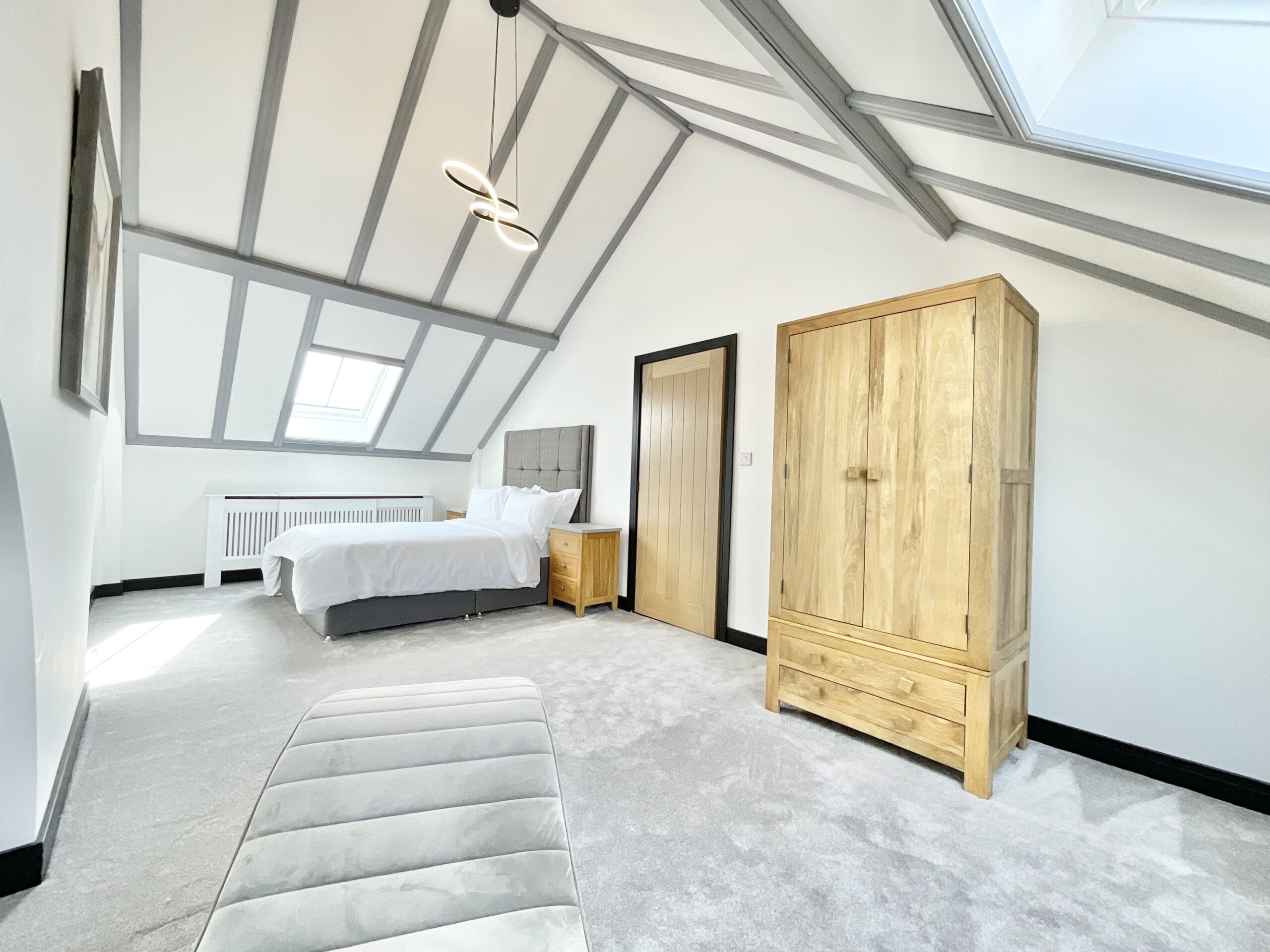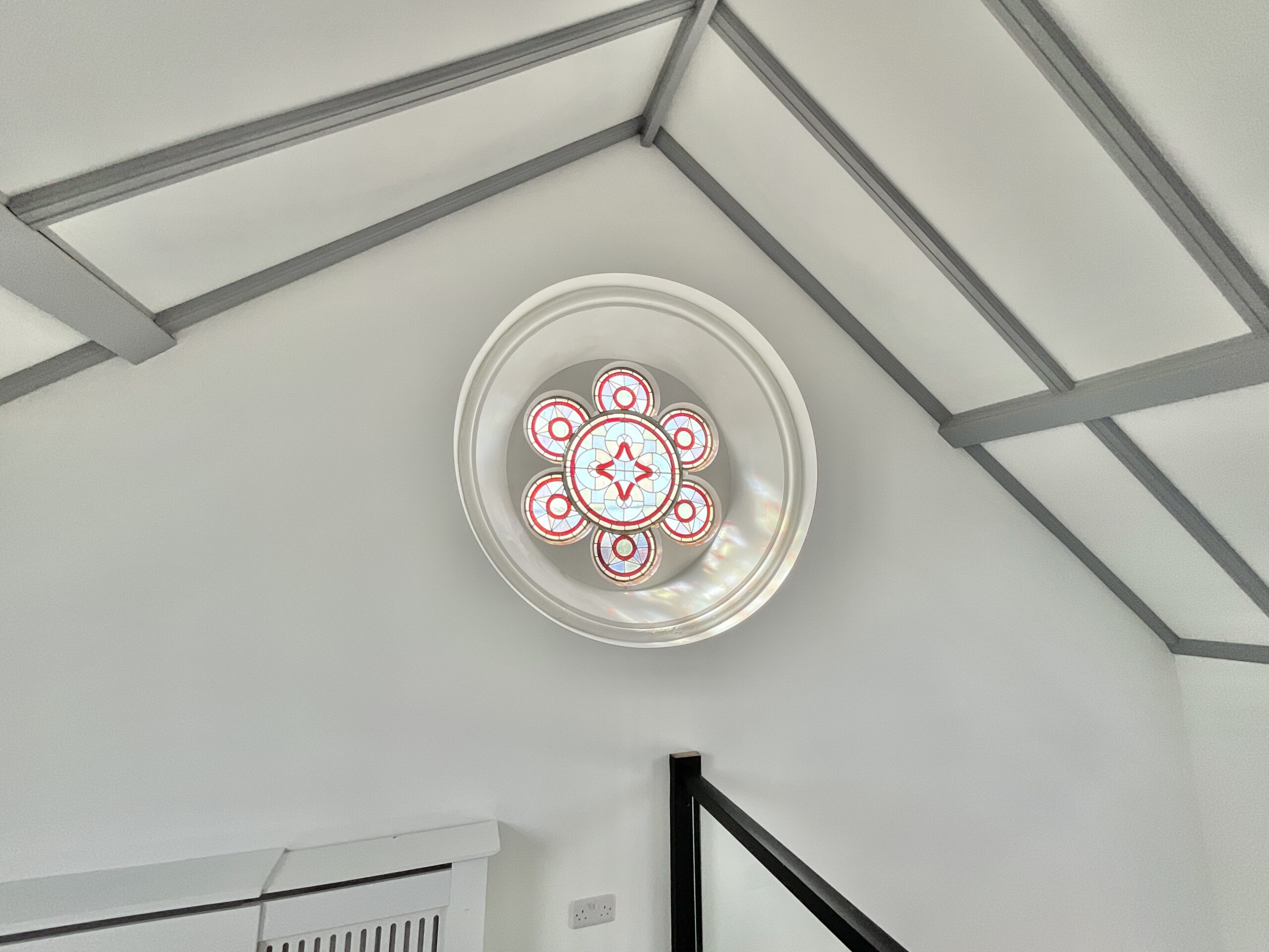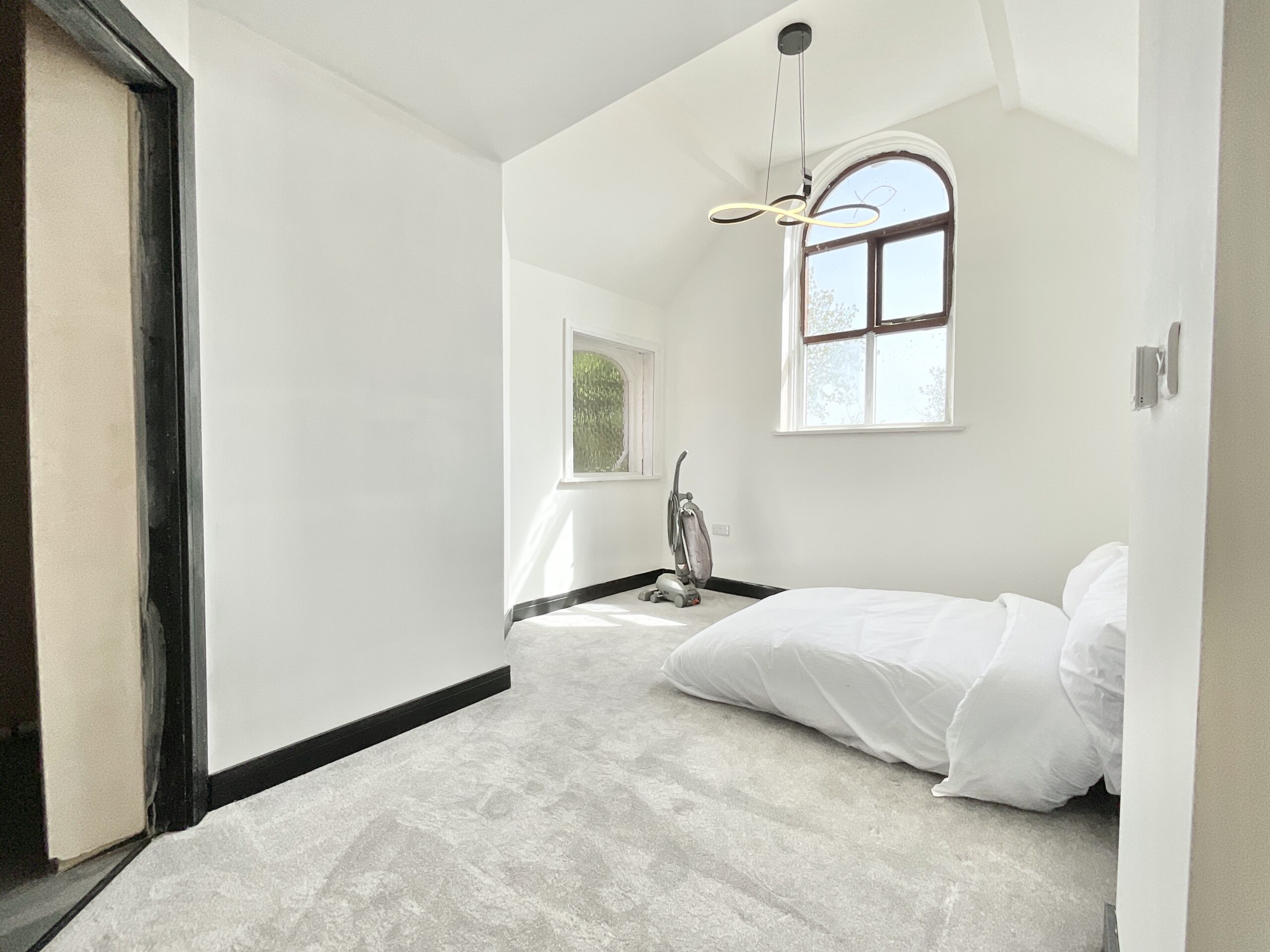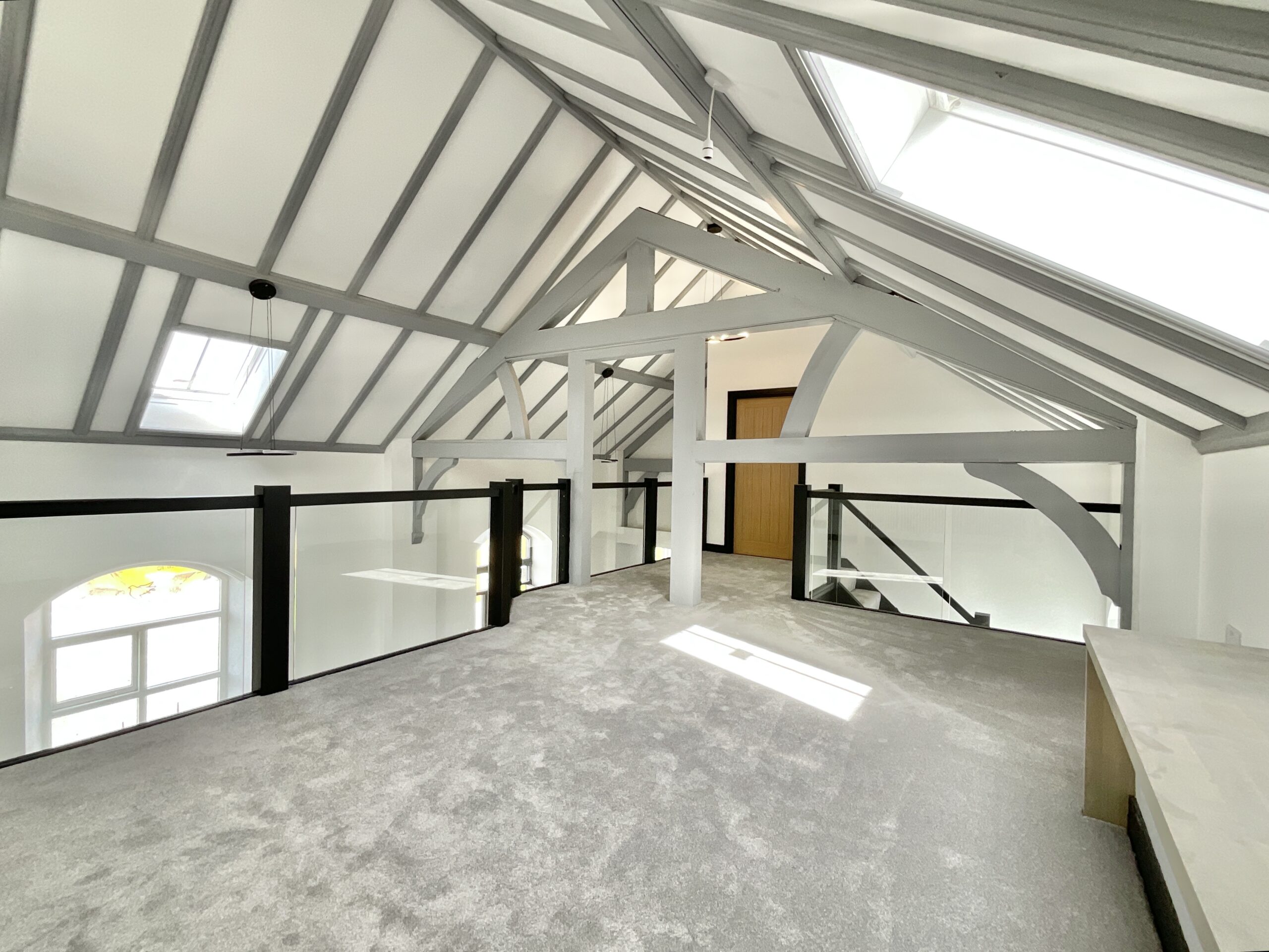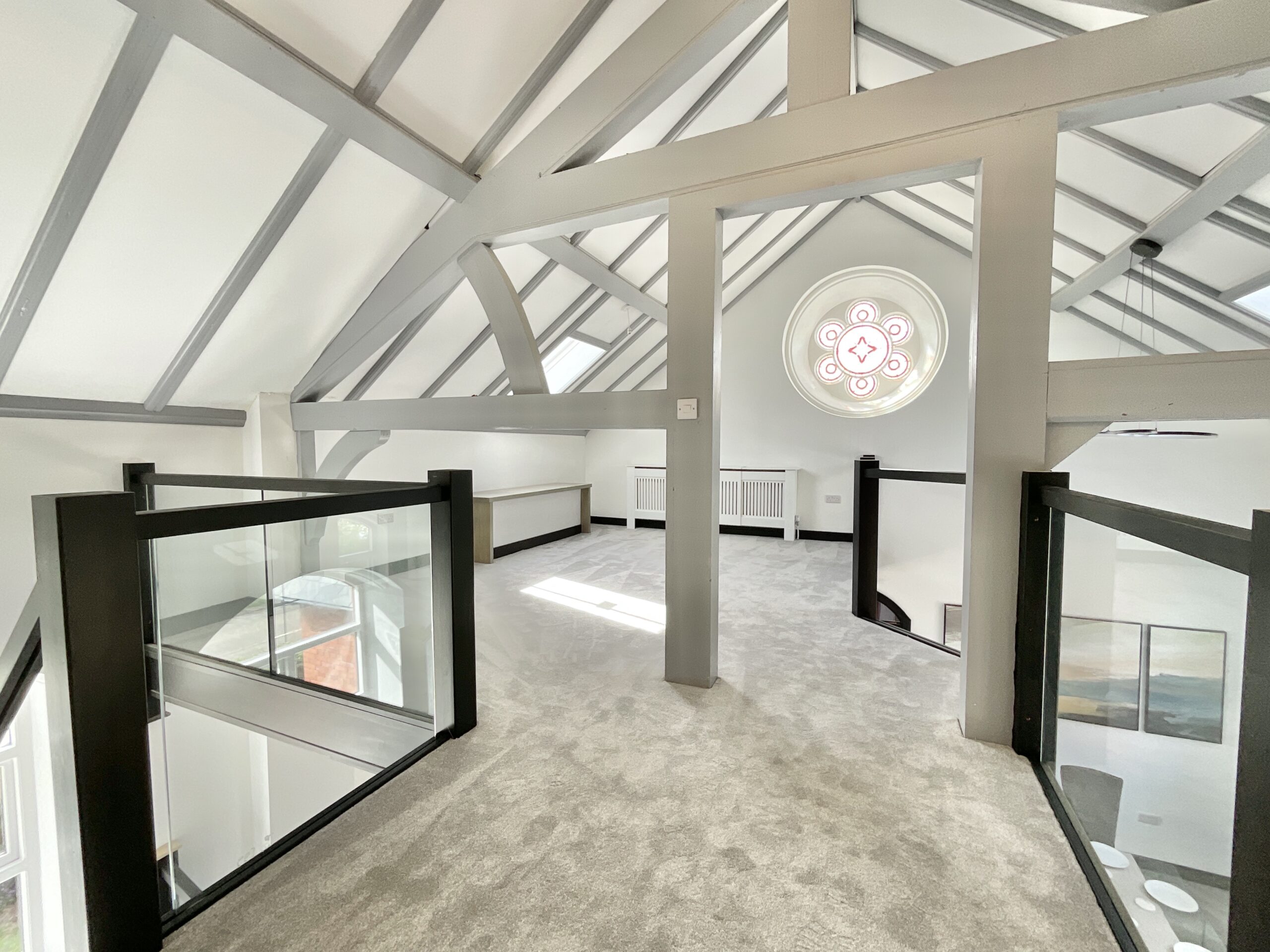 Upstairs, the sense of drama continues. A glass-panelled banister offers a dreamy view down below, while an original stained glass rose window steals the spotlight, casting colourful light like a quiet nod to the building’s past. Skylights pour sunshine in from above, creating a bright, uplifting retreat. The generous master bedroom and its ensuite provide a peaceful sanctuary, while the landing doubles beautifully as a study or reading nook.
