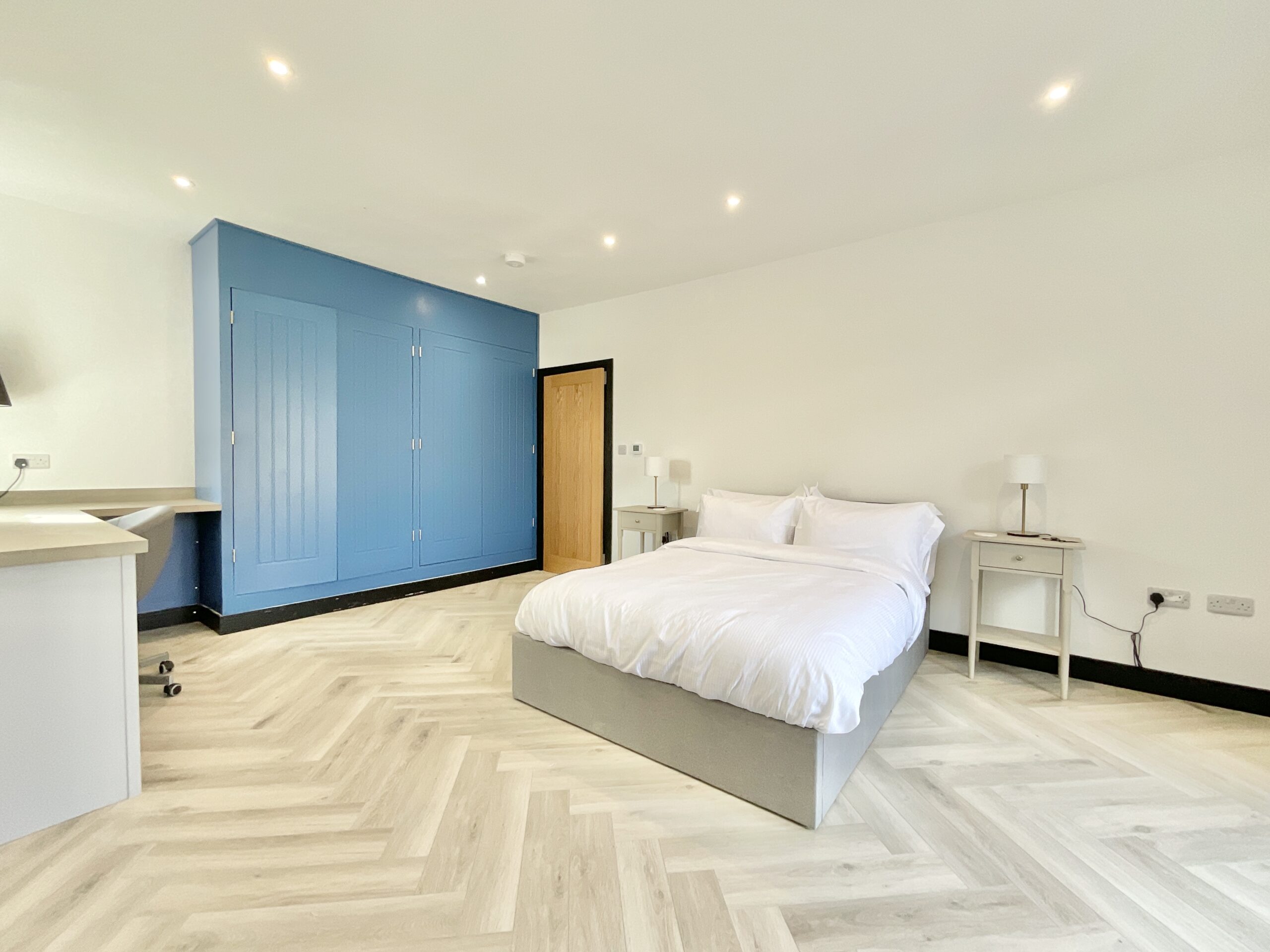 The ground floor is a showstopper, a gloriously open-plan space where cooking, dining and lounging flow together like a well-rehearsed choir. Beneath your feet, underfloor heating keeps things toasty, while herringbone flooring dances elegantly through the space. Overhead, original beams stand proudly, as if keeping watch over centuries gone by. The kitchen is ready for culinary magic. Dressed in rich dark blue cabinetry and topped with sleek quartz worktops, it’s fully equipped with AEG integrated appliances, including a downdraft hob, wine cooler, double oven, Belfast sink and more. Whether you're hosting a feast or just brewing a morning coffee, this space delivers.