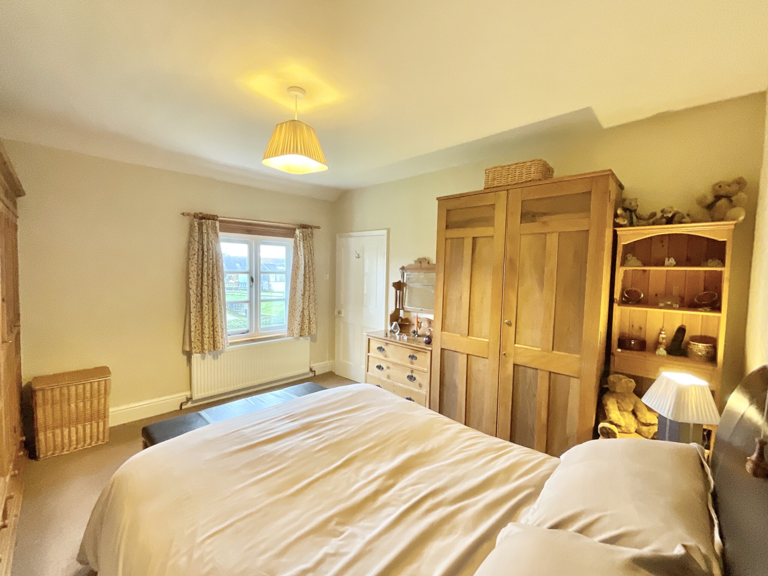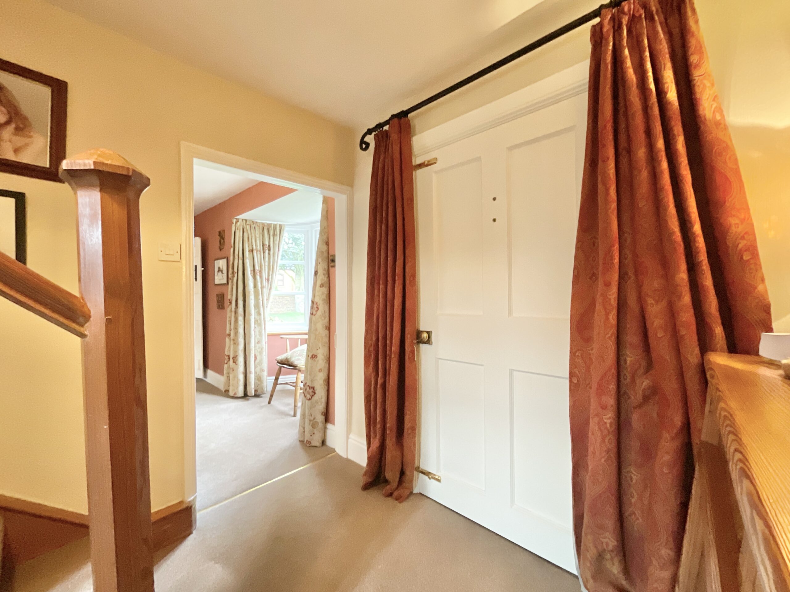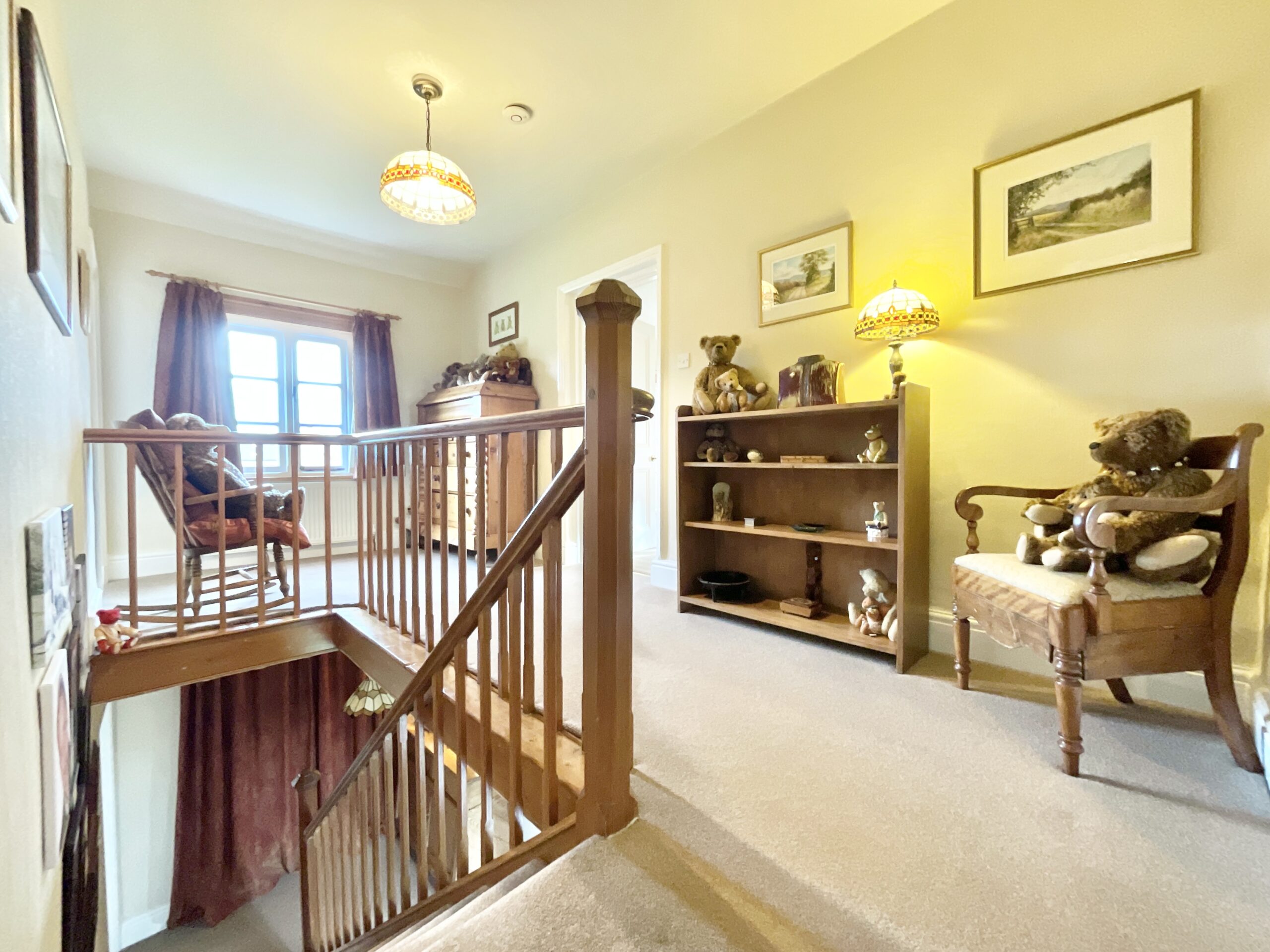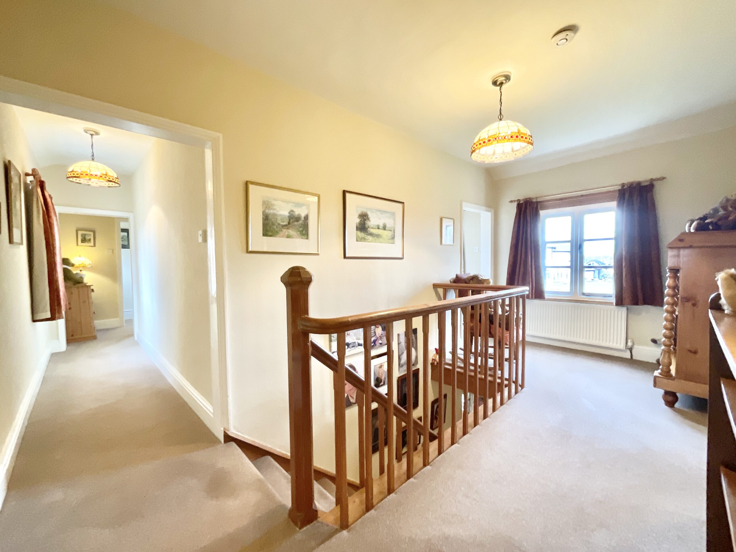 Back through to the other side of the kitchen/breakfast room you’ll discover an impressive dining room with another log burner style gas stove which flows perfectly through to the main entrance hallway and then the lounge, with yet another gas stove for that cosy focal point. The dual aspect windows allow the natural sunlight that envelopes the house to flood in with the bay window offering a beautiful view of the village and fields beyond. Underneath the stairs a handy storage cupboard provides space for hidden treasures whilst the grand staircase invites you up to the first floor and wonderful galleried landing. Heading far left across the landing you’ll find bedroom two, a spacious double with feature fireplace and plenty of opportunity for wardrobes. The main bedroom also sits along this landing which exudes the grandeur one would expect from an elegant home like this, with dual aspect windows and soaring ceilings. Continuing across to the right hand side of the landing, a corridor leads to a separate W.C and family bathroom fitted with a separate shower enclosure, free standing, roll top bath and sink. From here a Jack “n” Jill style door opens to the third bedroom, another sizeable double room which has a staircase leading back downstairs.