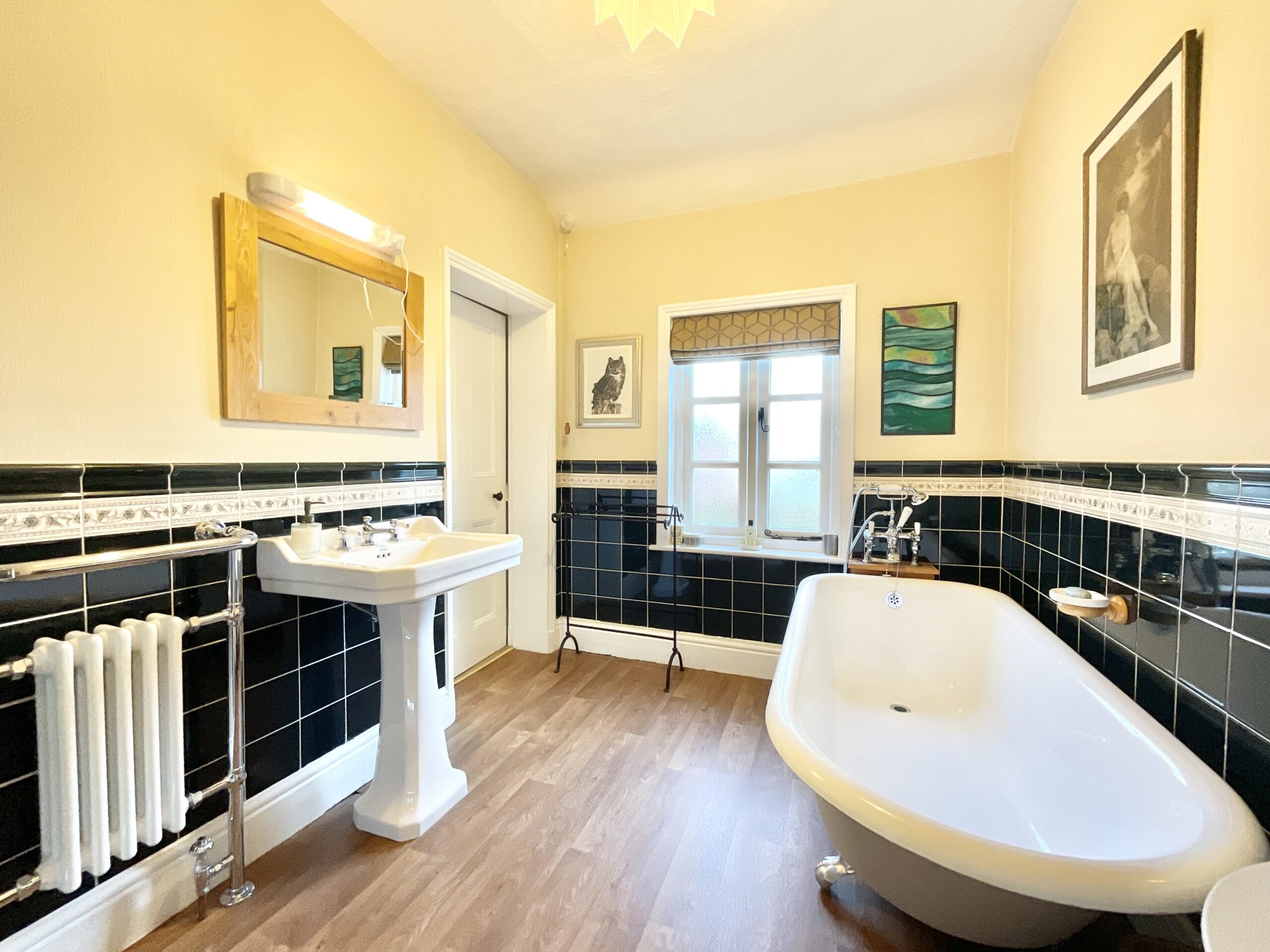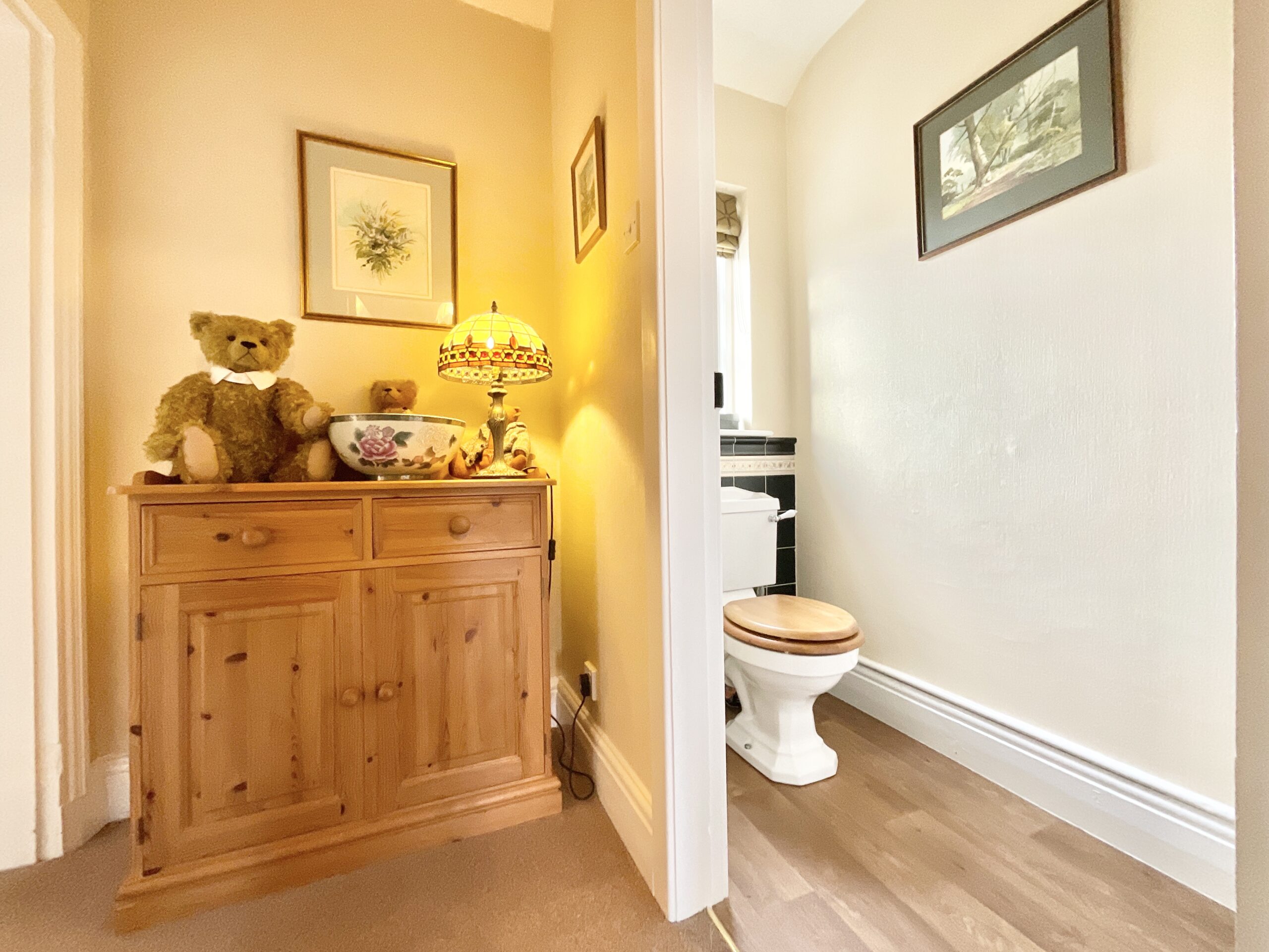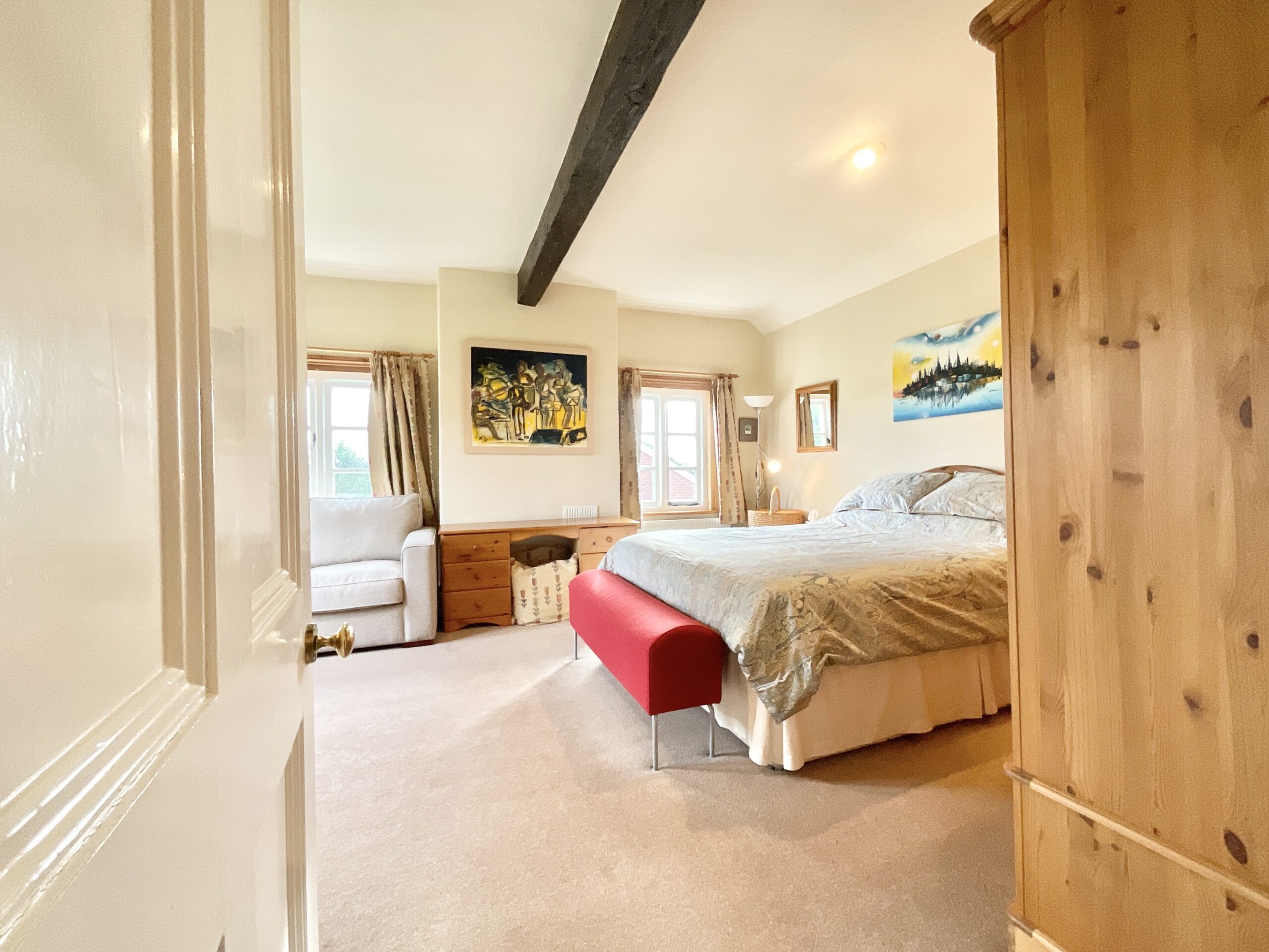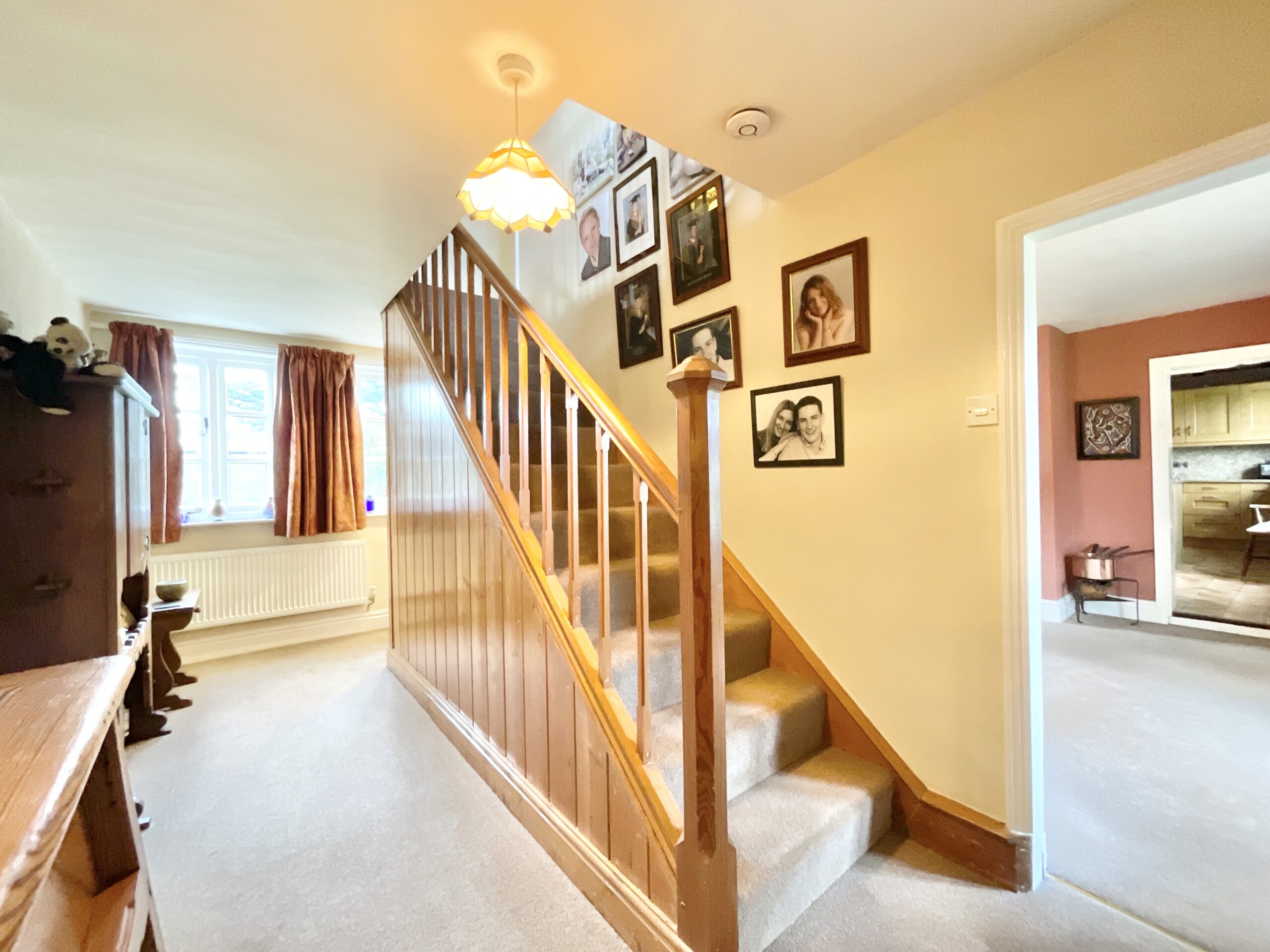 Back through to the other side of the kitchen/breakfast room you’ll discover an impressive dining room with another log burner style gas stove which flows perfectly through to the main entrance hallway and then the lounge, with yet another gas stove for that cosy focal point. The dual aspect windows allow the natural sunlight that envelopes the house to flood in with the bay window offering a beautiful view of the village and fields beyond. Underneath the stairs a handy storage cupboard provides space for hidden treasures whilst the grand staircase invites you up to the first floor and wonderful galleried landing. Heading far left across the landing you’ll find bedroom two, a spacious double with feature fireplace and plenty of opportunity for wardrobes. The main bedroom also sits along this landing which exudes the grandeur one would expect from an elegant home like this, with dual aspect windows and soaring ceilings. Continuing across to the right hand side of the landing, a corridor leads to a separate W.C and family bathroom fitted with a separate shower enclosure, free standing, roll top bath and sink. From here a Jack “n” Jill style door opens to the third bedroom, another sizeable double room which has a staircase leading back downstairs.