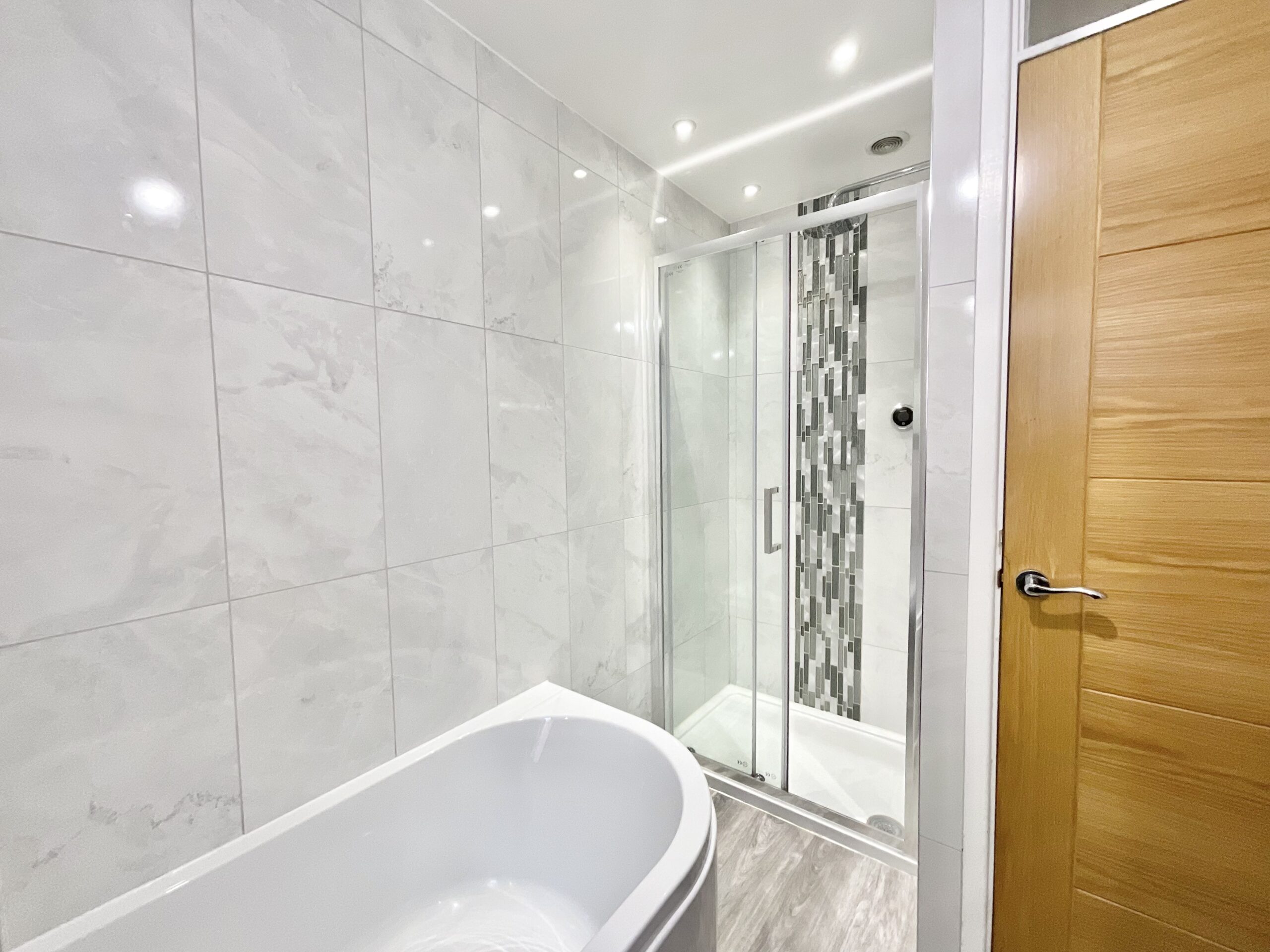 - Three generous bedrooms including two doubles, one with its own fitted wardrobes, plus a further single with fitted wardrobes, and a family bathroom with a bath, shower, vanity sink, and W/C.