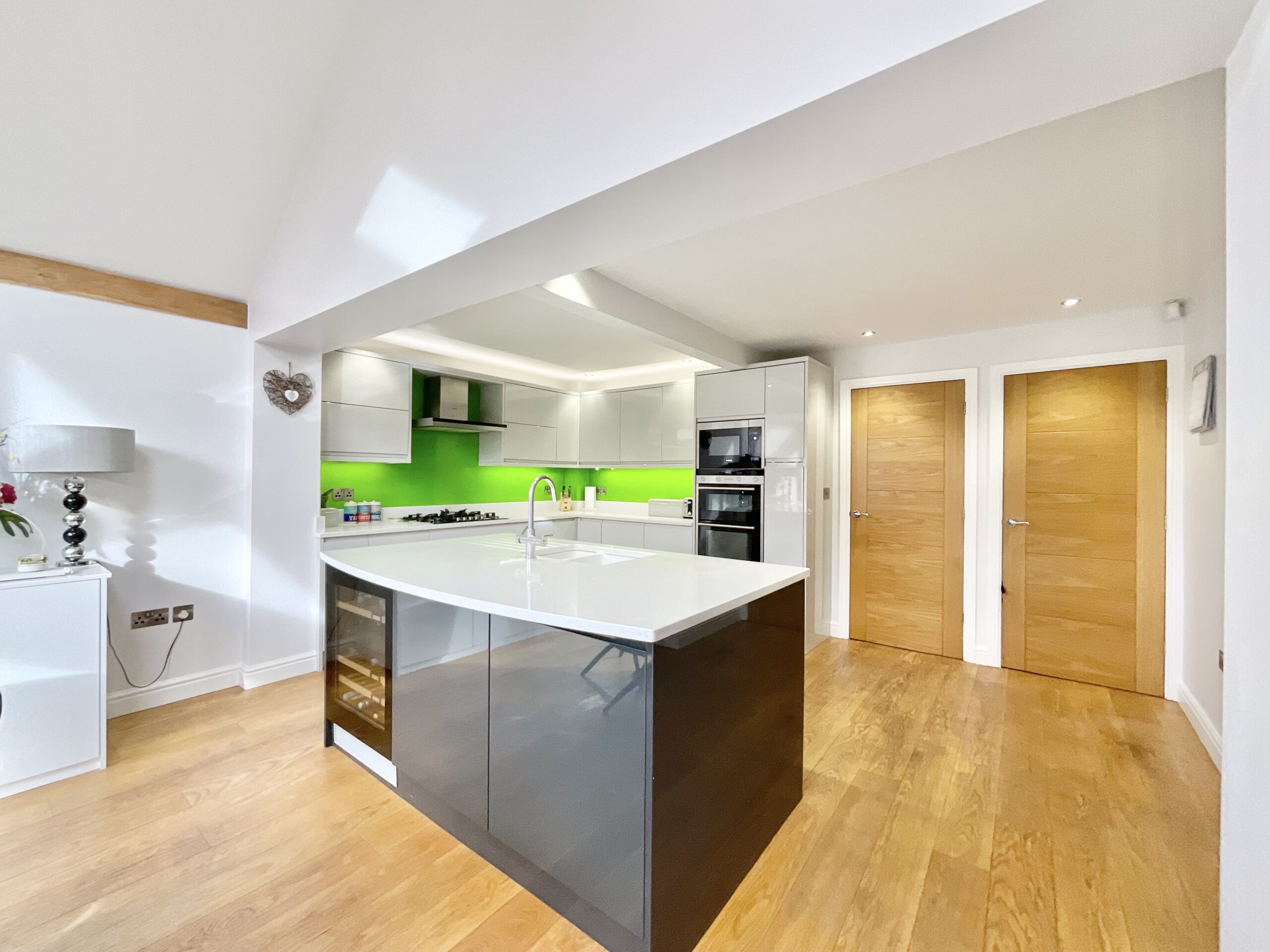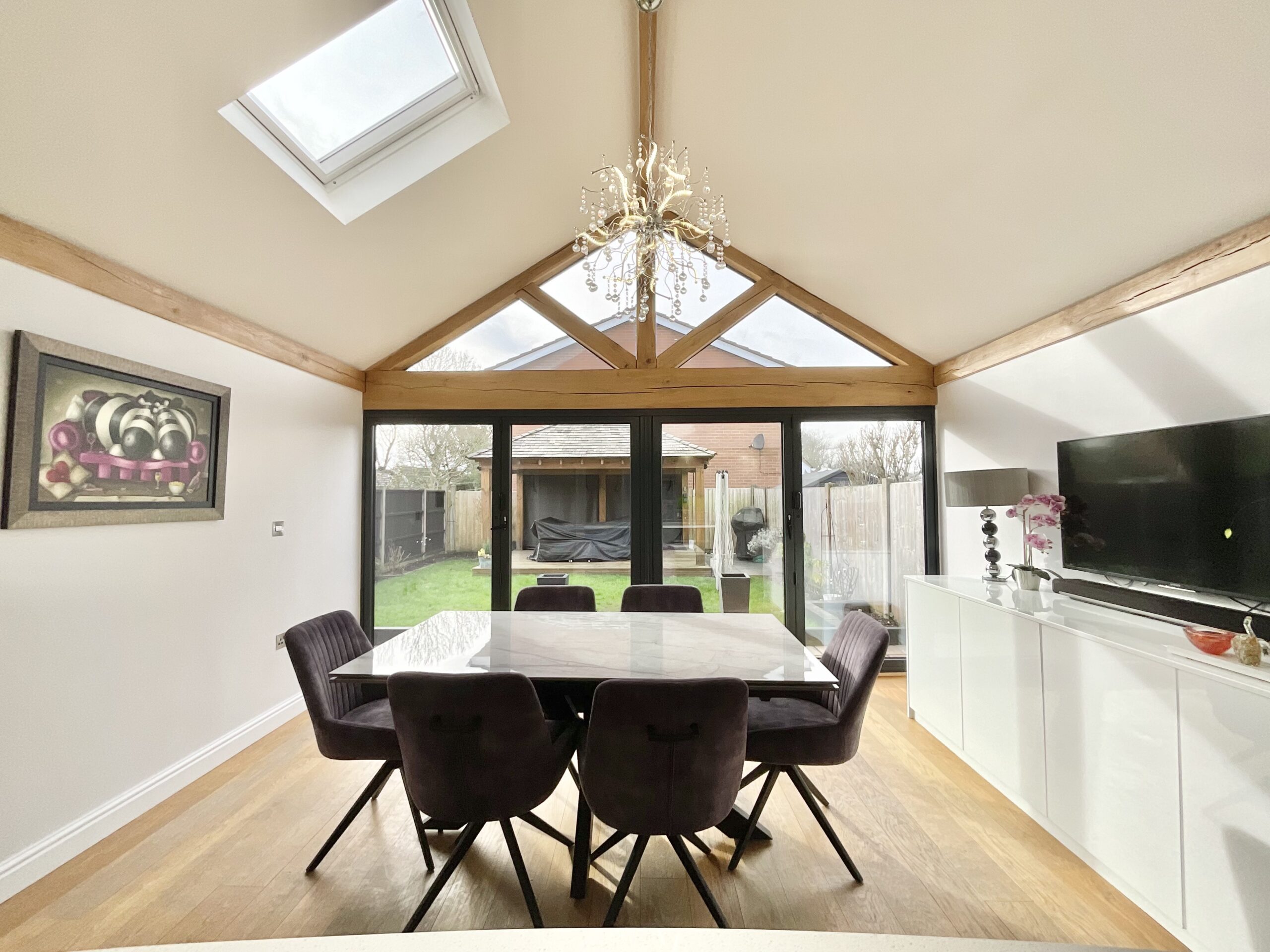 Inside, the beating heart of this home presents a generously sized open-plan kitchen/living/dining space. The kitchen is set in a practical L-shape with sleek grey cabinetry, granite worktops, integrated appliances, an island with storage and a drinks cooler, and quartz worktops, plus the extended living/dining space with underfloor heating, full-length bifolding doors, a vaulted ceiling with oak-beamed and glazed frontage, and a skylight that floods it with natural light. This space has been beautifully designed by the current owners to be perfect for entertaining both friends and family for all occasions. Off the kitchen, you’ll find a separate utility room with space for further appliances. The spacious living room offers a lovely bay window and plenty of space to relax with friends and family.