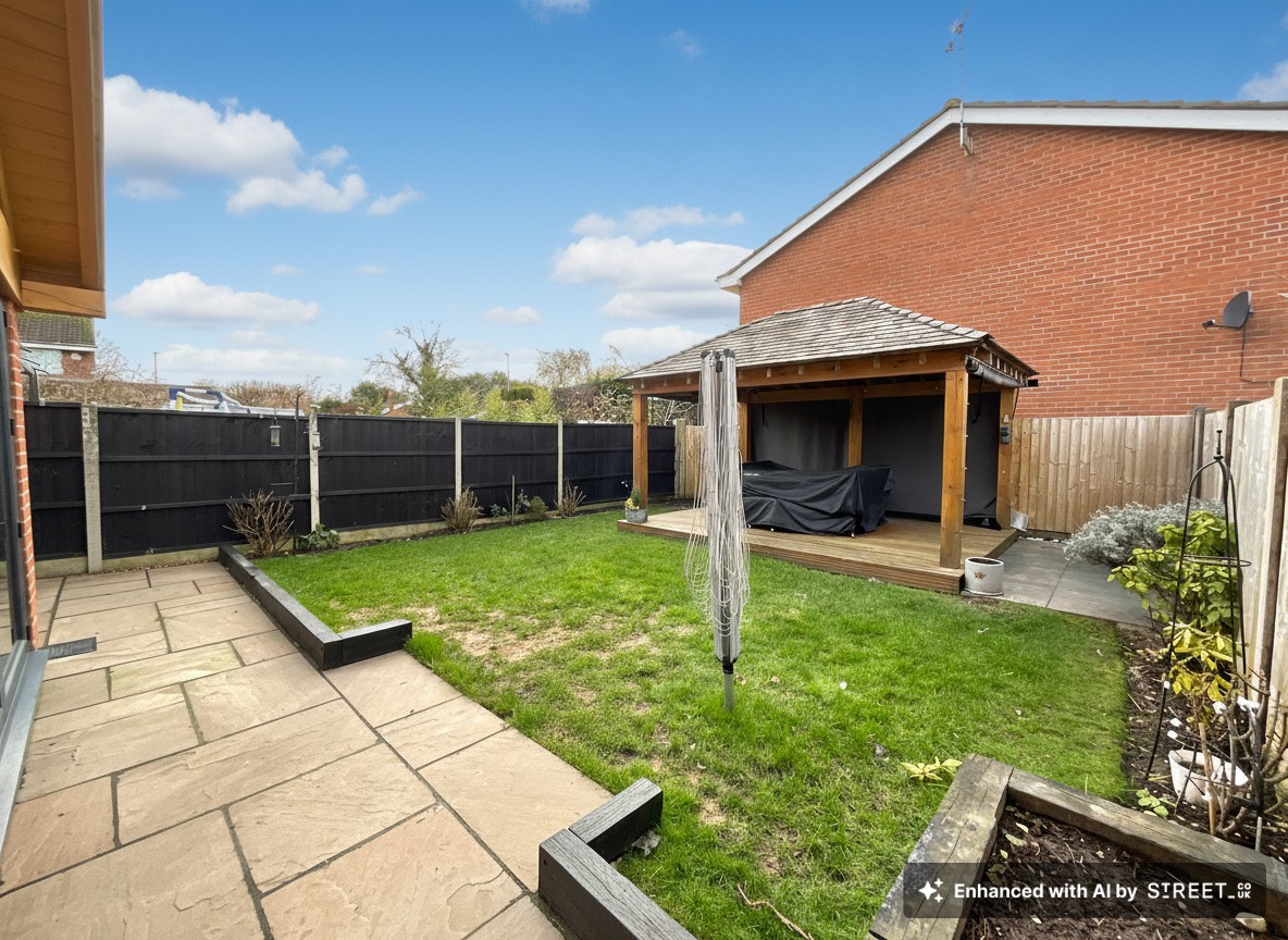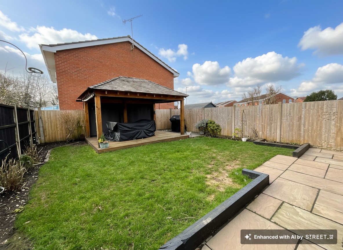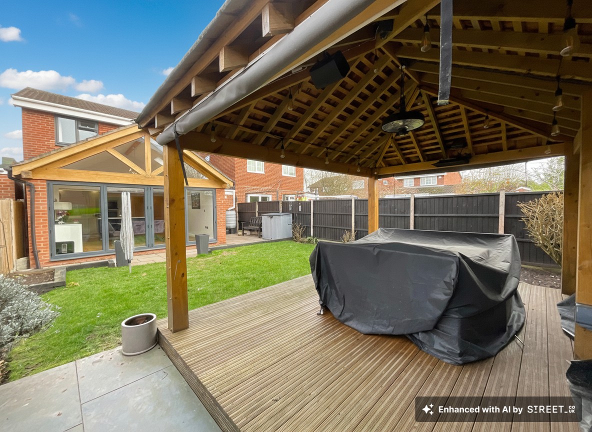 - South-West facing rear garden with L-shaped wraparound patio seating space, lush grass lawn, and decked area with purpose built pergola offering electricity, heating, and projector, ideal for hot tub.