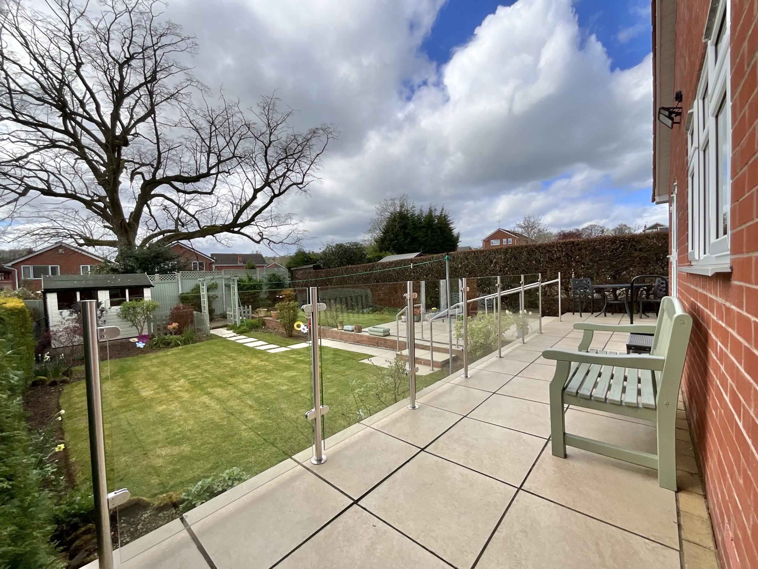 - South-West Facing Garden – Landscaped outdoor space with patio areas, lawn, and garden views elevated by a contemporary glass balustrade..