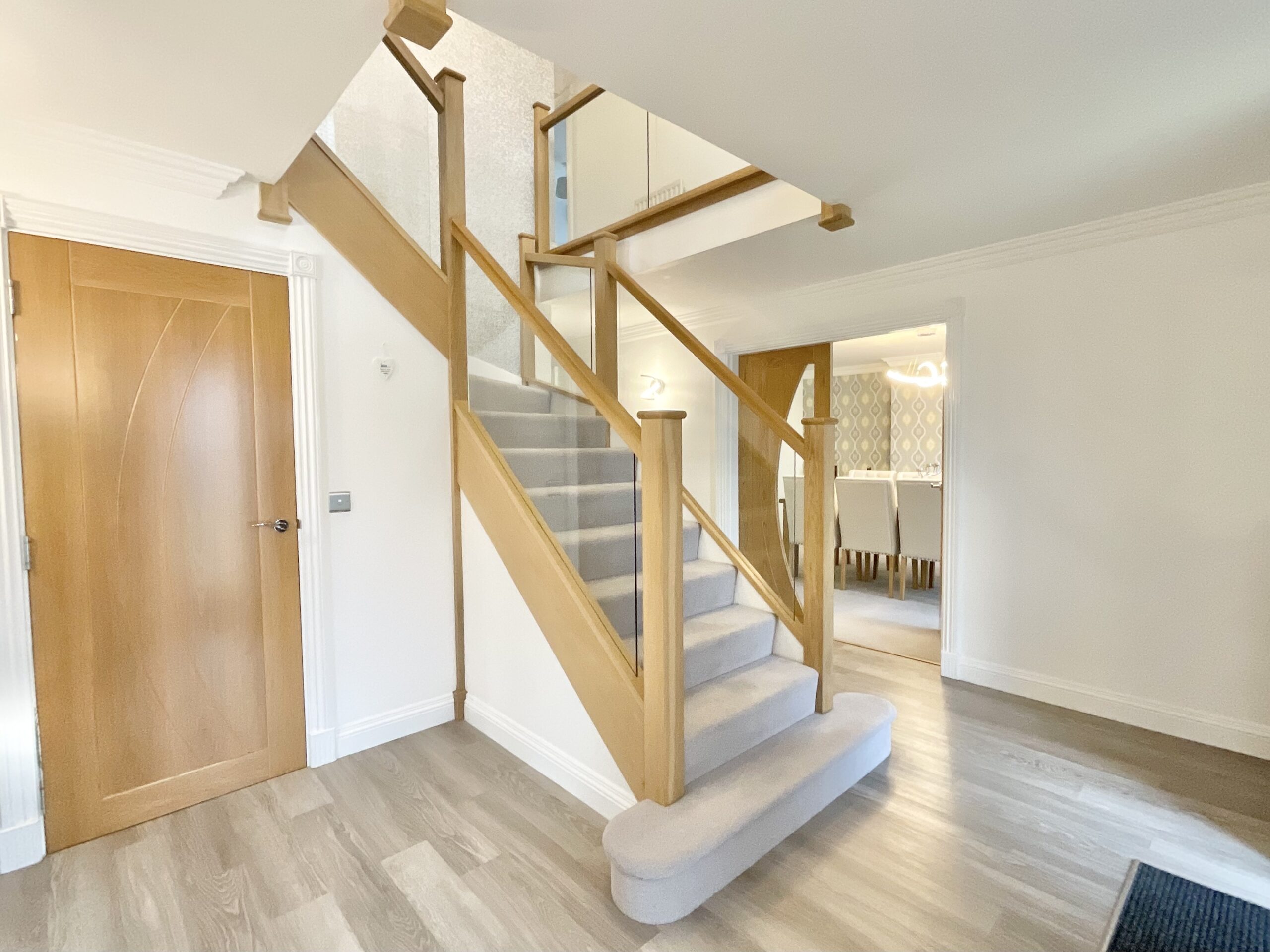 The specification throughout the property has been carefully considered, with oak doors running throughout, complemented by glass detailing, bespoke oak stair components and custom thresholds. Additional features include bespoke fitted blinds, a gas fire with limestone surround, decorative coving and a multi-room integrated speaker system serving the kitchen/diner, dining room, master bedroom and bathroom.