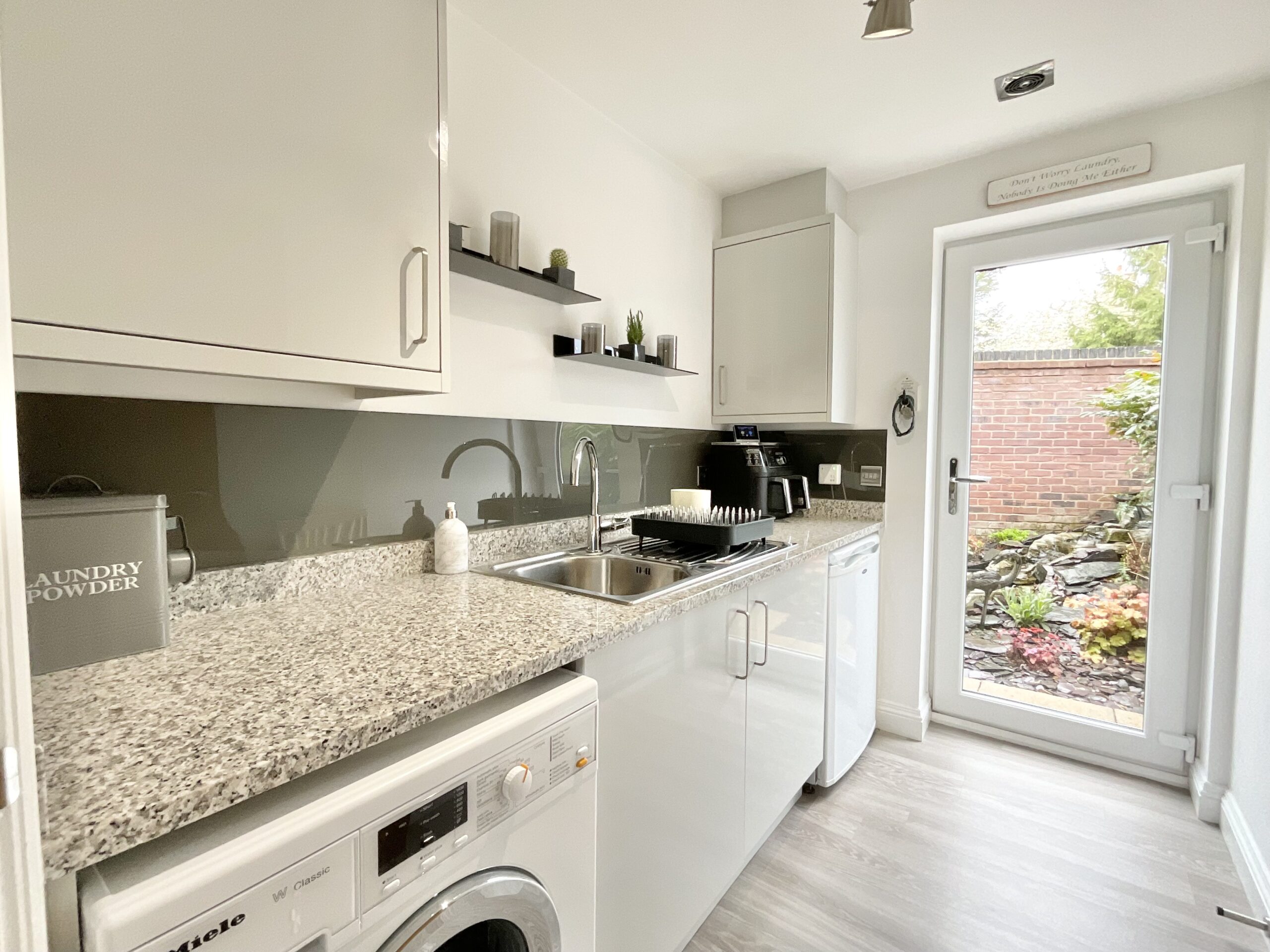 At the heart of the home is an impressive open-plan kitchen and dining space, finished to a high standard with granite worktops and upstands, acrylic splashbacks and a glass breakfast bar. The kitchen also benefits from a Rangemaster cooker, integrated dishwasher and coffee machine, along with space for an American-style fridge freezer. A separate utility room continues the quality finish, providing additional granite work surfaces, splashbacks and space and plumbing for laundry appliances. A study and ground floor WC complete the downstairs accommodation.