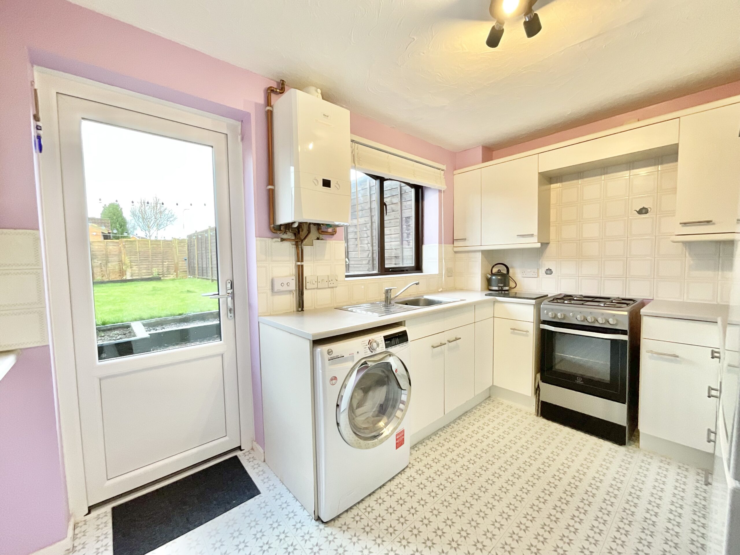 Inside, you’ll find a spacious lounge/diner with room to relax after a long day. The practical U-shaped kitchen features white base and overhead cabinetry, plenty of room for appliances, and a breakfast bar area.