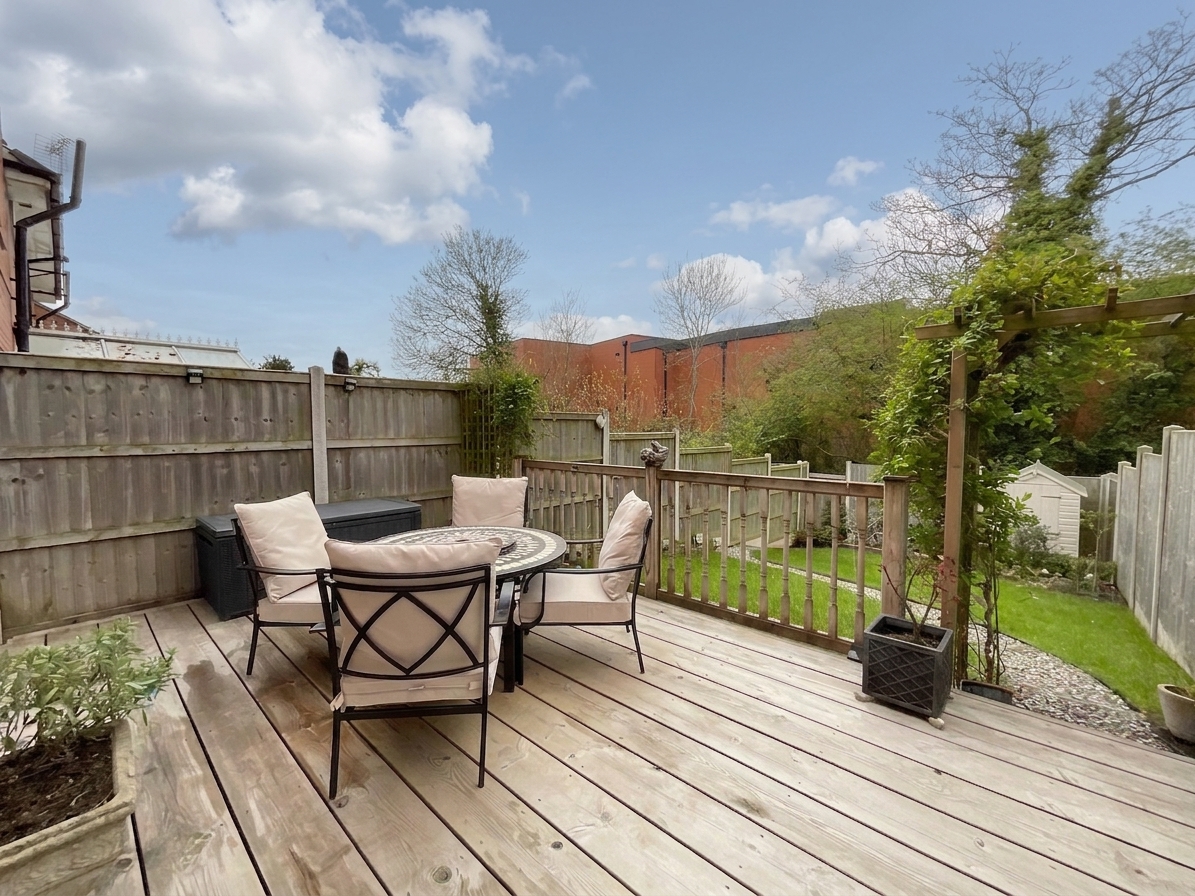 Externally, the property continues to impress with driveway parking for at least two cars, an integral garage, and a superb landscaped tiered rear garden. Designed with both relaxation and entertaining in mind, it features lawned areas, a decked seating terrace, mature borders, and additional seating spaces that are perfect for summer barbecues or evening drinks.