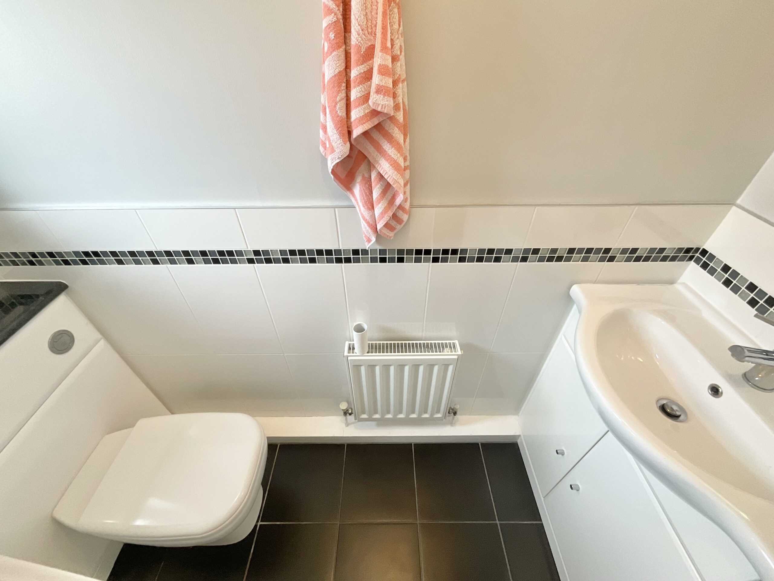 Upstairs, the property offers three well-proportioned bedrooms, including two good-sized doubles and a versatile single room, ideal as a nursery, home office, or guest room. The bathroom is fitted with a bath and electric shower, along with a WC and wash basin.