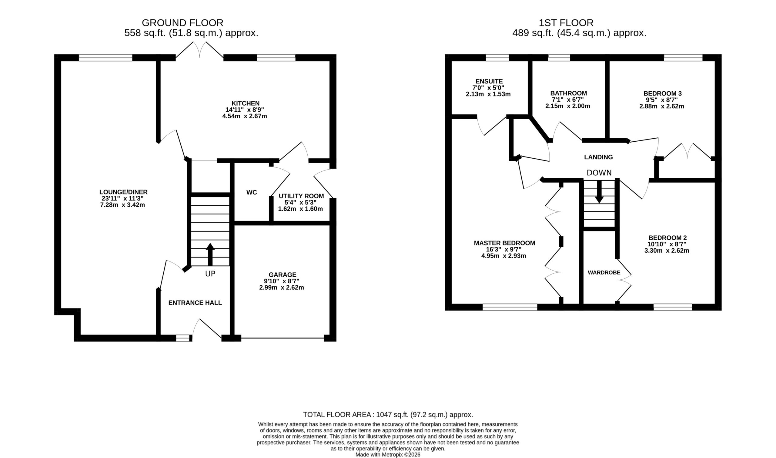 Upstairs, the property boasts three bedrooms, comprising two doubles and a single, all benefiting from built-in wardrobes for excellent storage. The master bedroom also enjoys the added advantage of an en-suite, while the remaining bedrooms are served by a modern family bathroom. A useful landing area connects all rooms, along with additional storage.