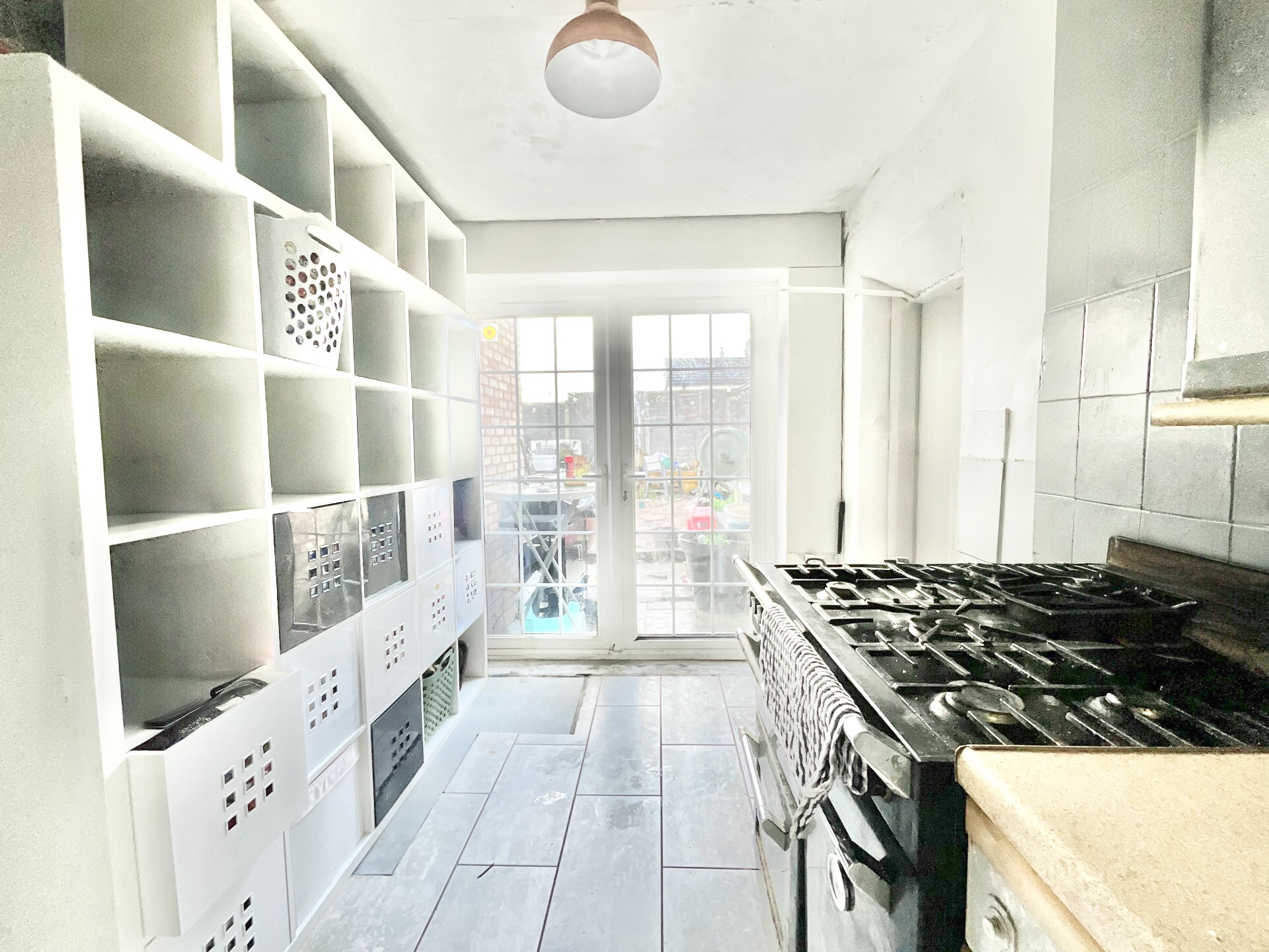 1. Spacious living accommodation, including a living room, a galley kitchen with wood-effect units, and double-glazed doors opening to the garden.