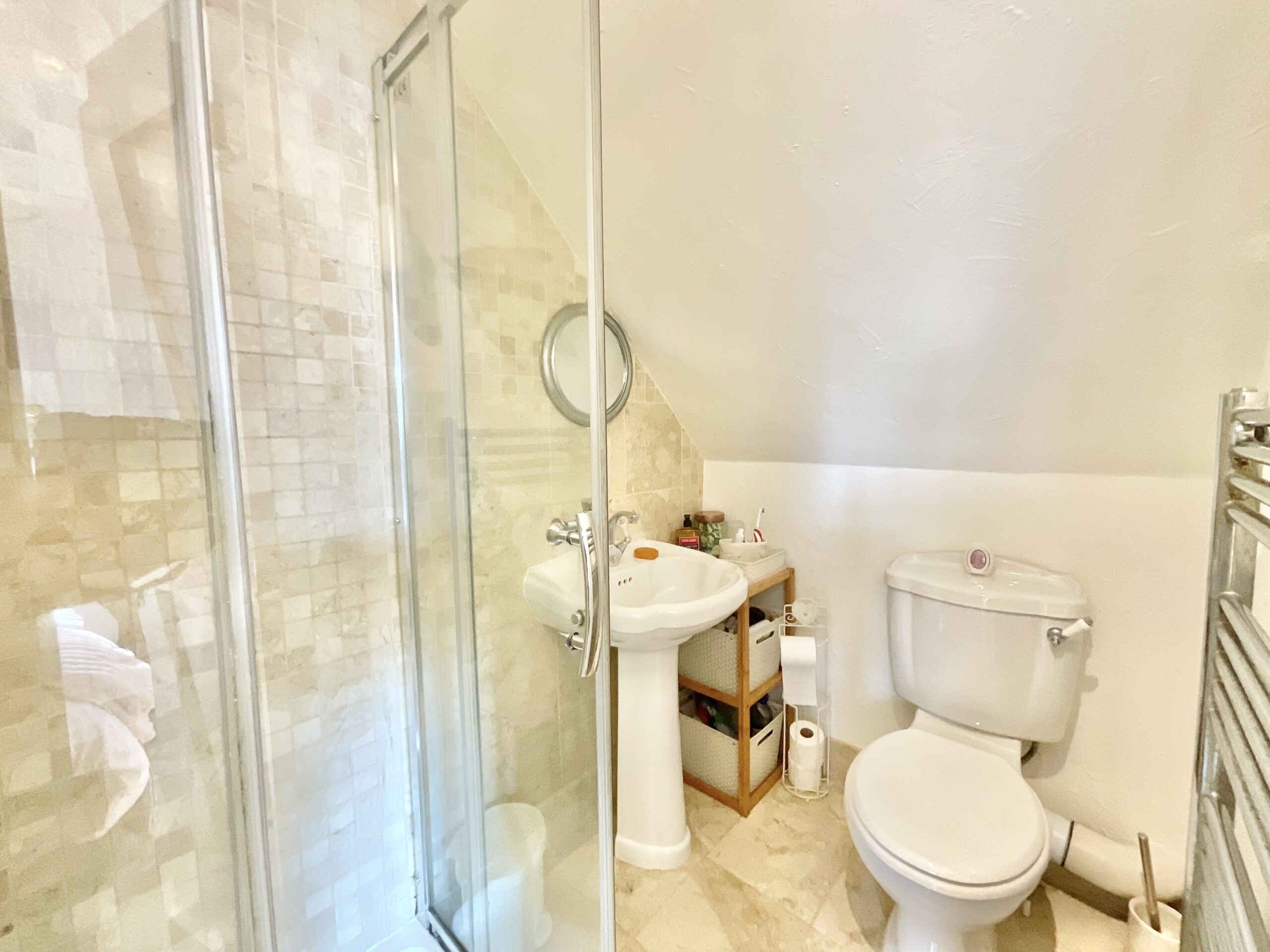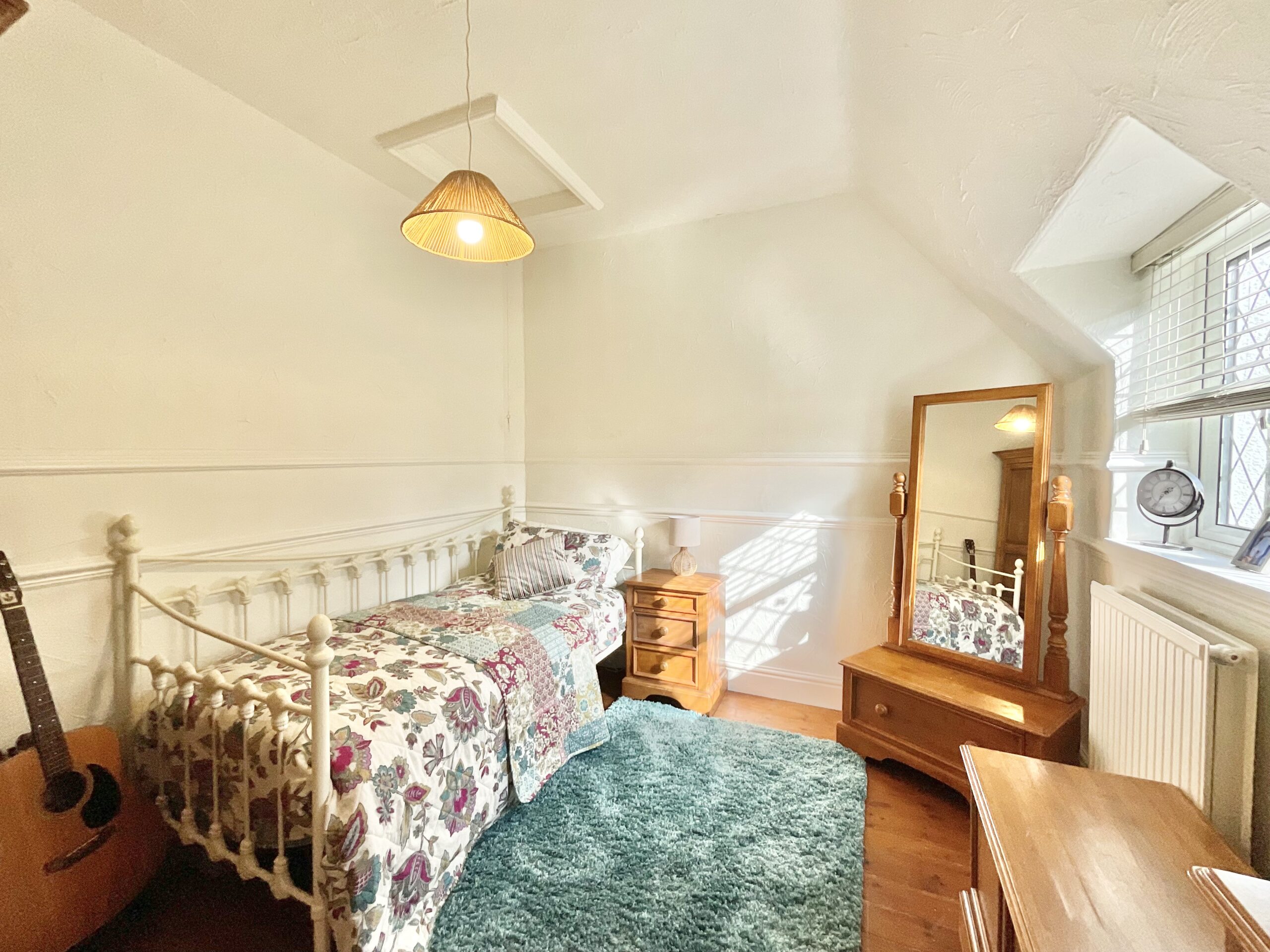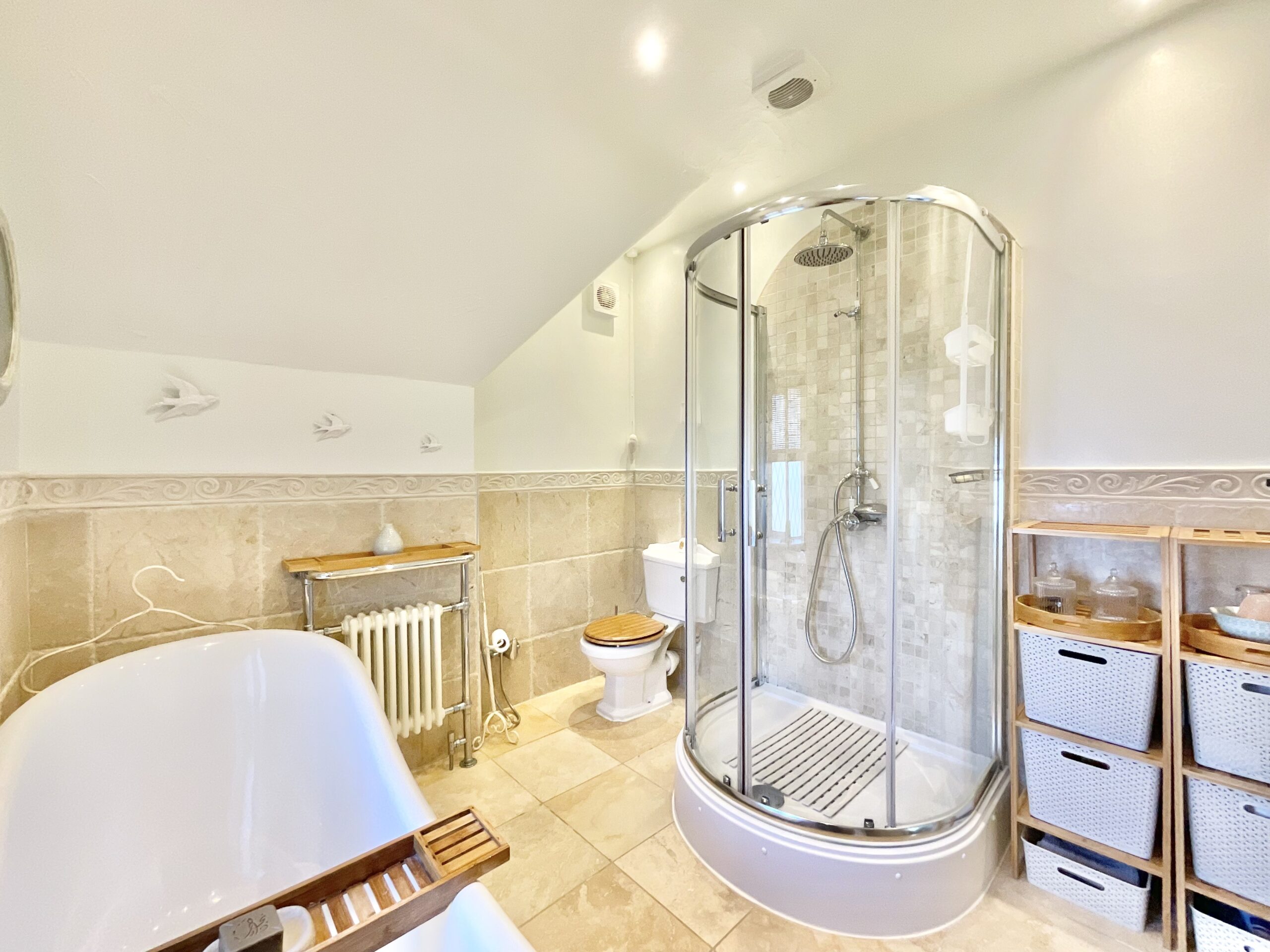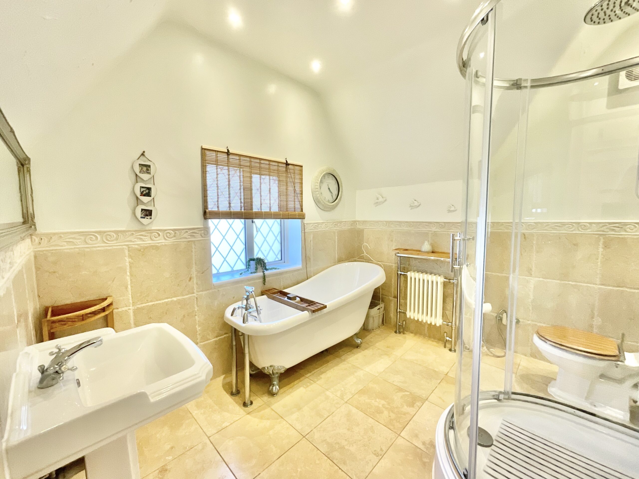 Upstairs, you’ll discover three generously sized double bedrooms, including a master with its own en suite shower room, plus a further single that’s perfect for a nursery, dressing room, or office. The family bathroom is home to a freestanding clawfoot rolltop bath, a separate D-shaped shower, a sink, and a W.C.