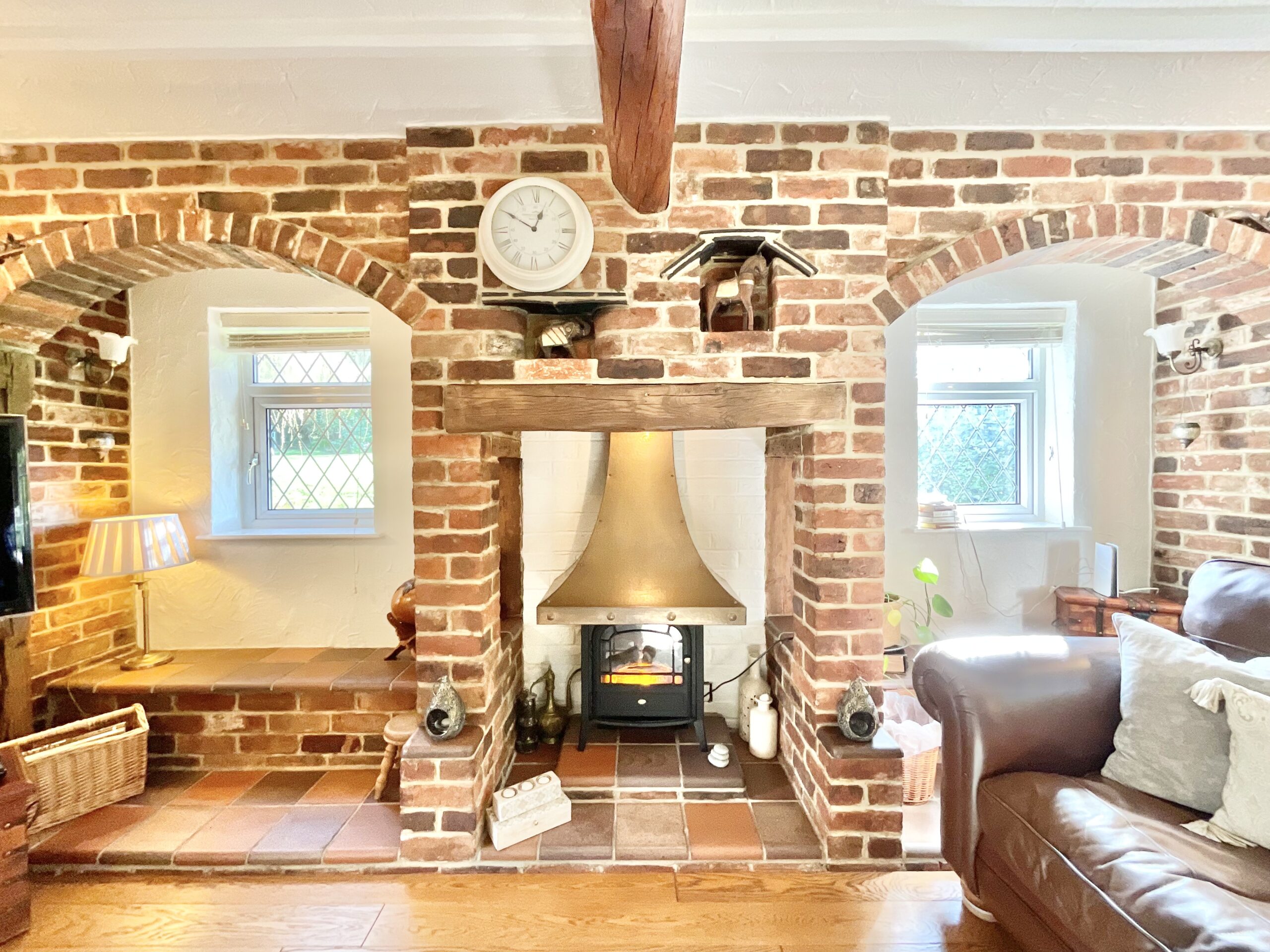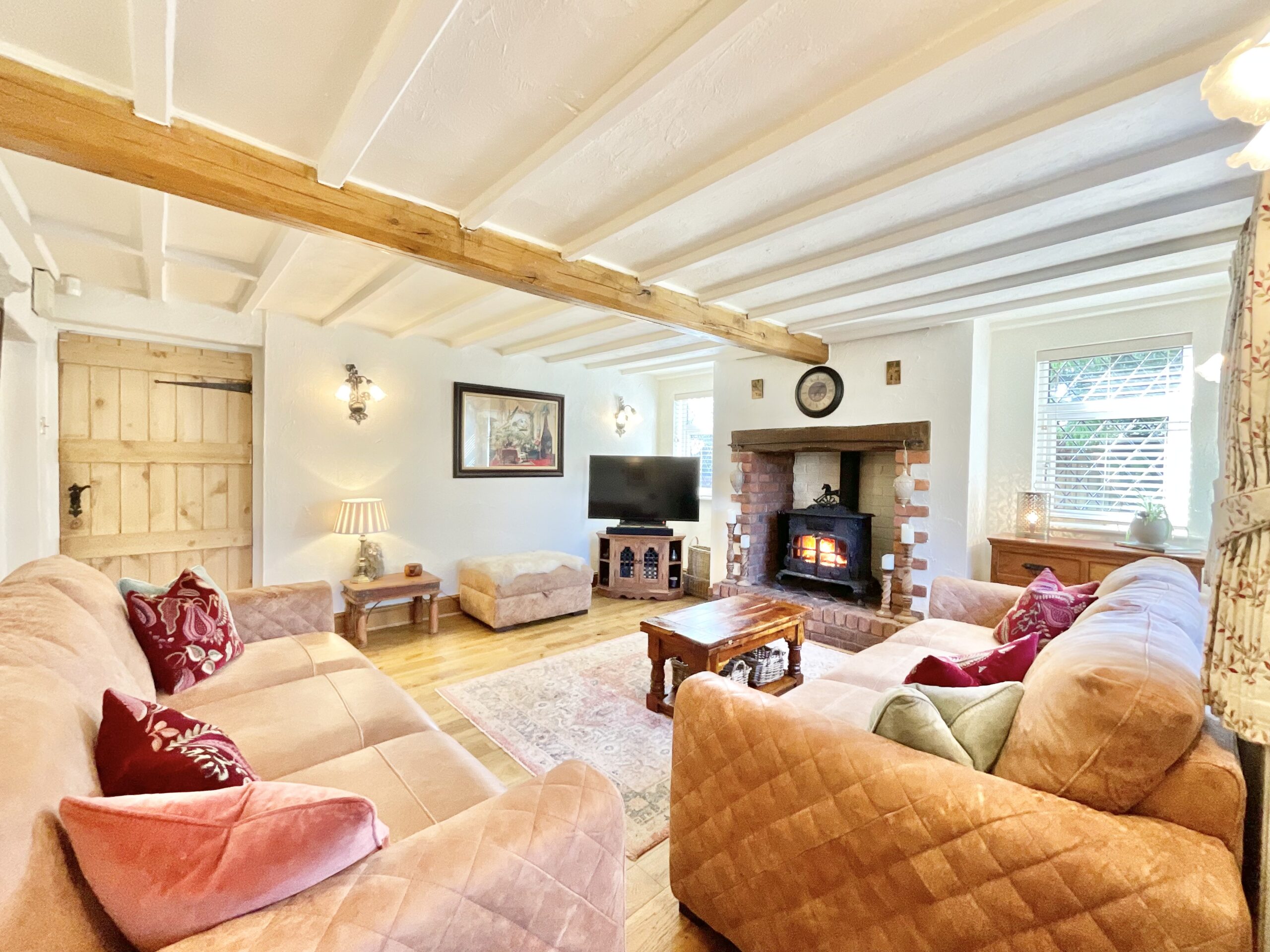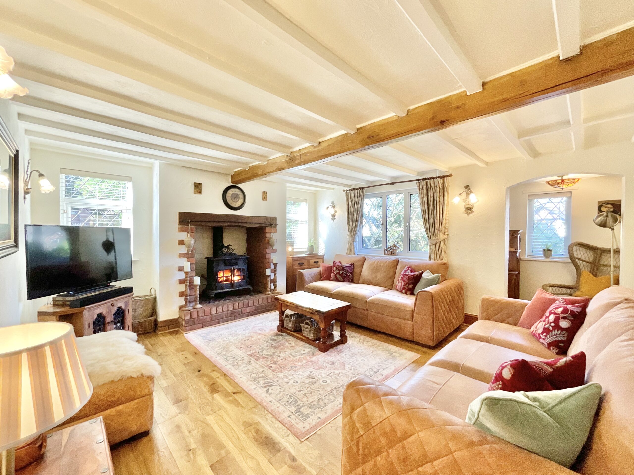 Enter into a warm and inviting living room, guiding you seamlessly throughout this home. Both the family room and living room are flooded with natural light and boast traditional exposed beams and brick-built inglenook fireplaces, with the living room offering a stunning log burner and quiet reading nook. The kitchen/dining space is home to a French Oak Arthur Bonnet Kitchen with ample base and overhead cabinetry space, a twin Belfast sink, an integrated dishwasher, a fridge, a gas AGA cooker and an additional electric oven and gas hob. Completing the ground floor is a separate utility room for added convenience.