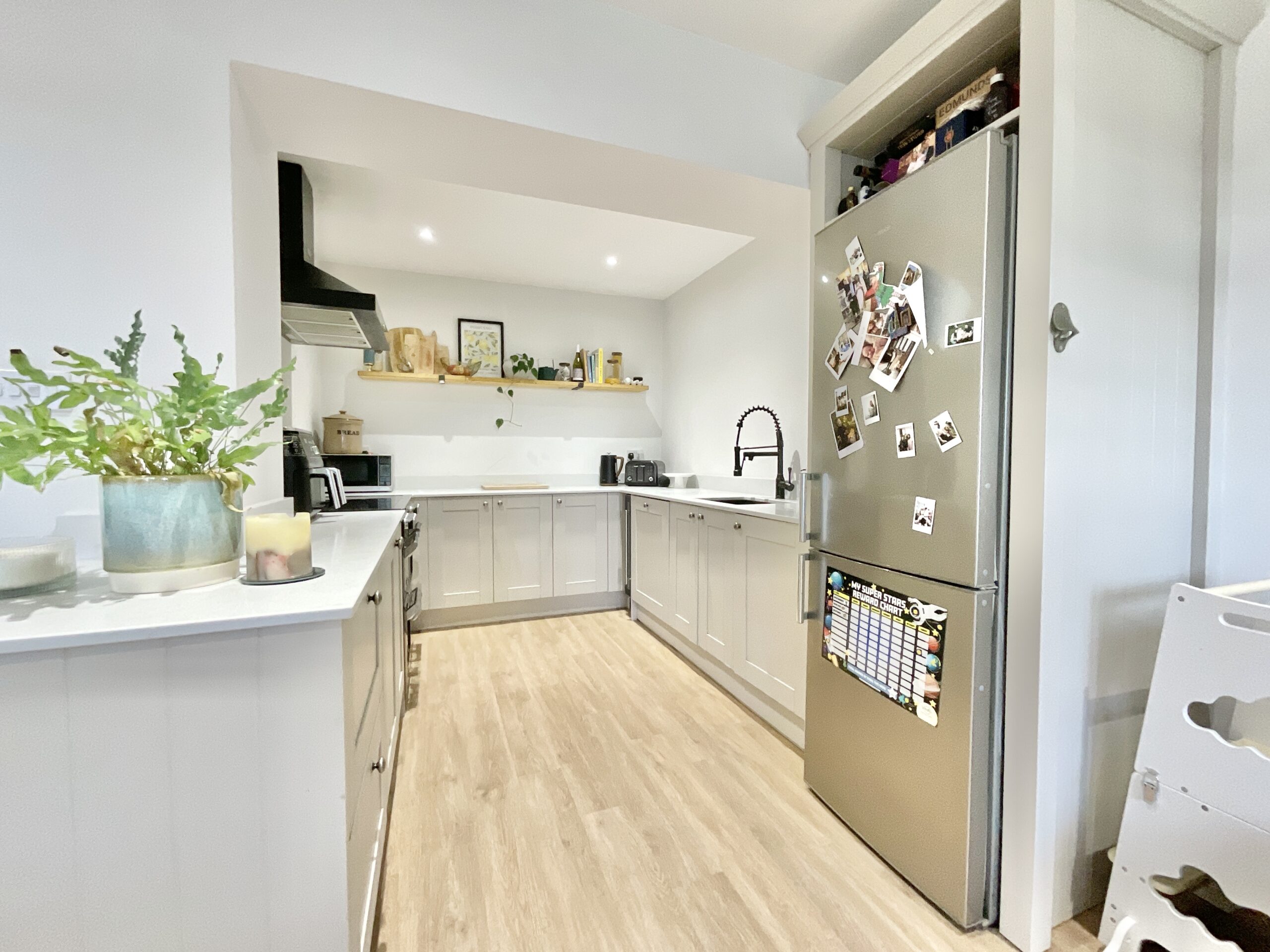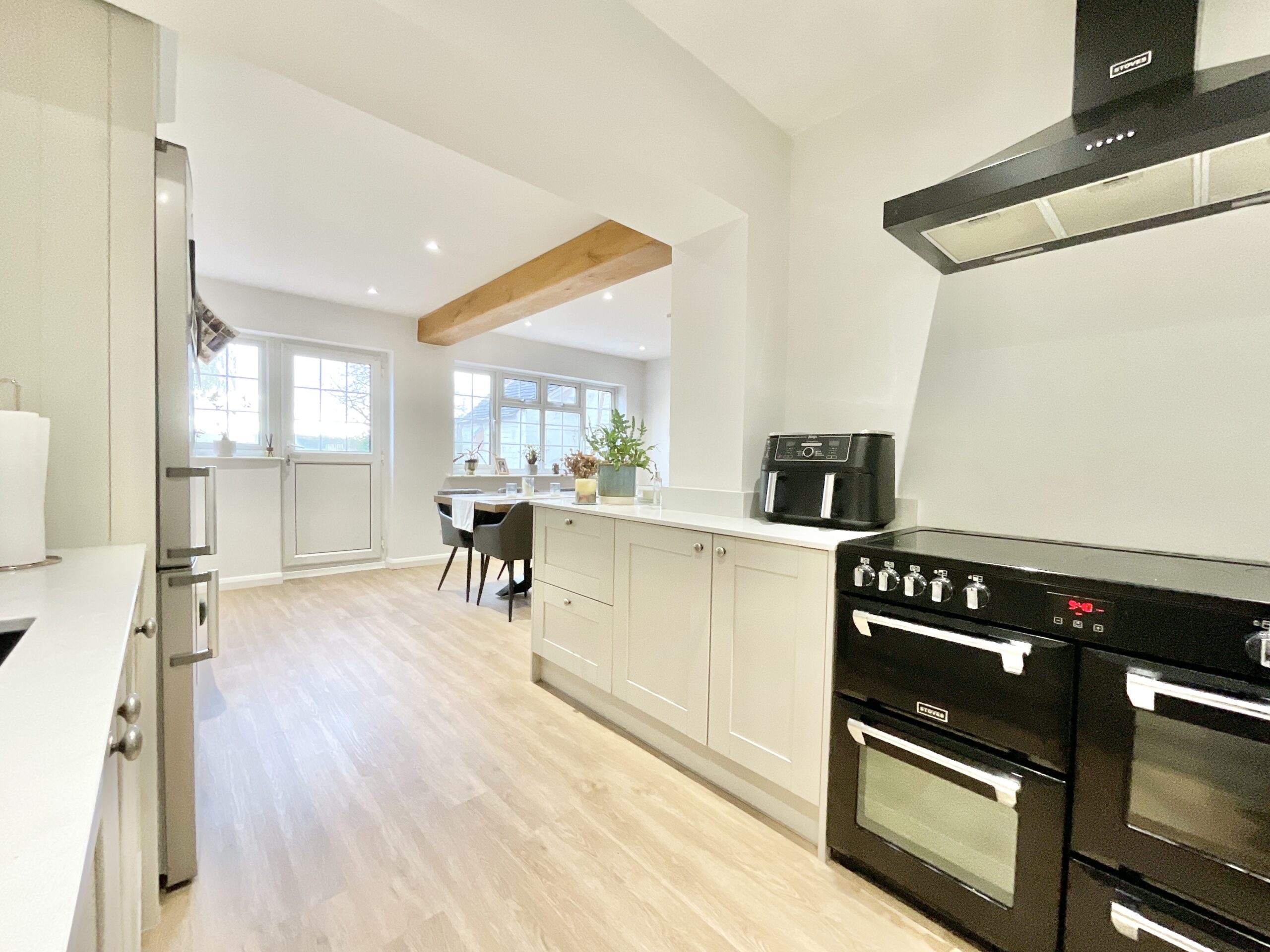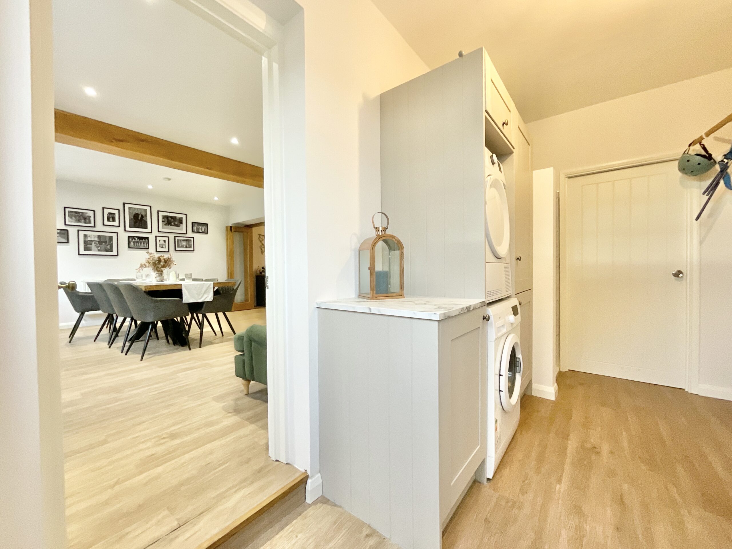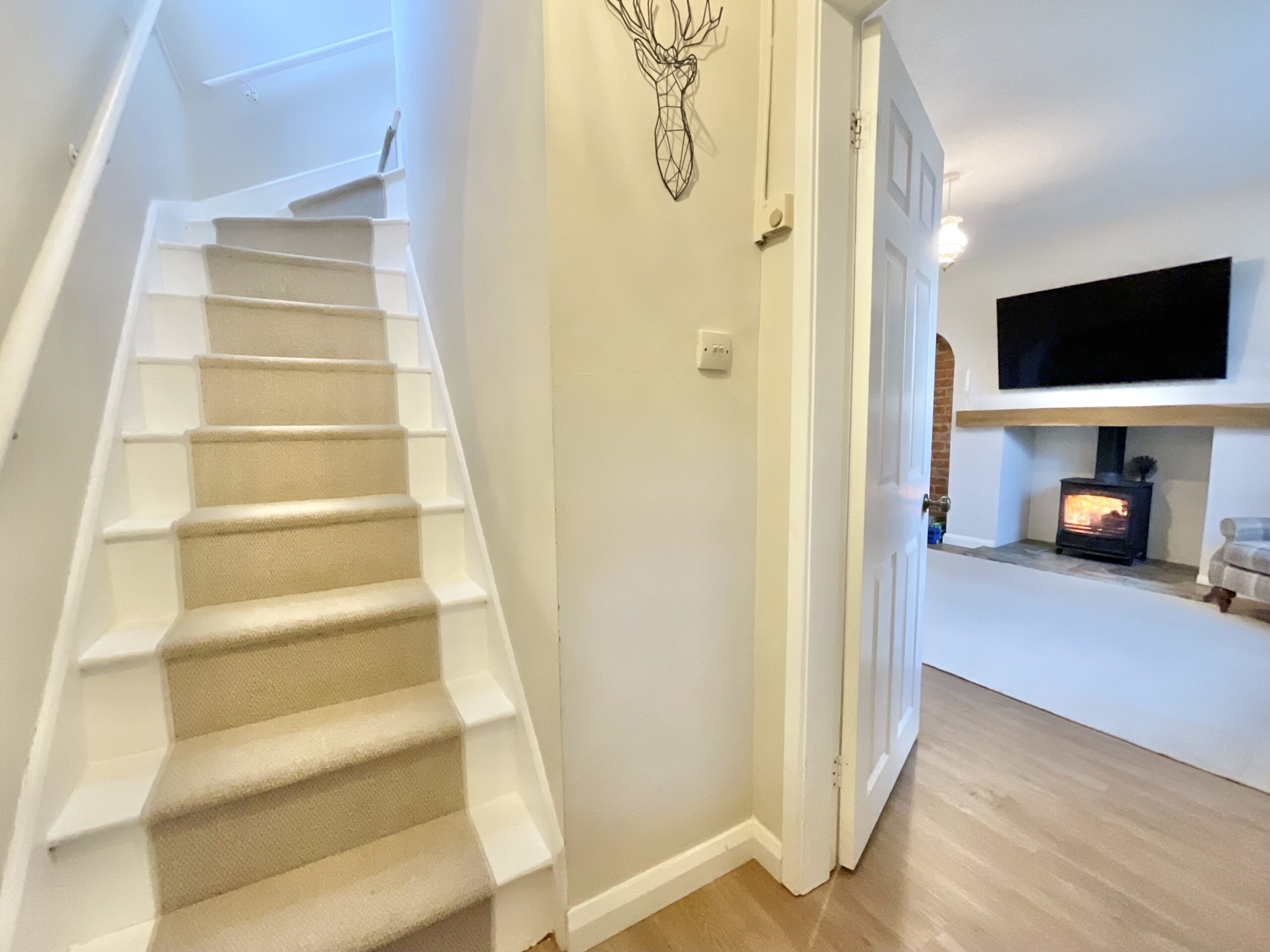From the moment you arrive, the generous brick-paved driveway, attached garage and neatly presented front garden set the tone, mature shrubs and a graceful tree boost the home’s kerb appeal and hint at what lies within. Step through the welcoming front porch and drift into the open-plan living and dining areas, where natural light pours in and wood-effect flooring, exposed brickwork and a cosy wood-burning stove create an atmosphere perfect for family time or entertaining. The modern kitchen continues the theme, with plentiful cabinetry, integrated appliances and a layout that feels wonderfully open and airy. Wood-effect bifold doors allow you to close off the living room when you need a moment of peaceful privacy, dreamlike quiet at the slide of a door. Practicality is woven throughout too, with a utility/shower room conveniently sat off the kitchen, ideal for freshening up after a countryside wander, while also giving access to a cloakroom, the garage and the rear garden. Upstairs, three beautifully presented bedrooms offer comfort and flexibility, each decorated in calming neutrals with plush carpeting and scenic views that make waking up feel like the start of a dream you don’t want to leave. The family bathroom is finished with light tiling, a relaxing bath and built-in storage.