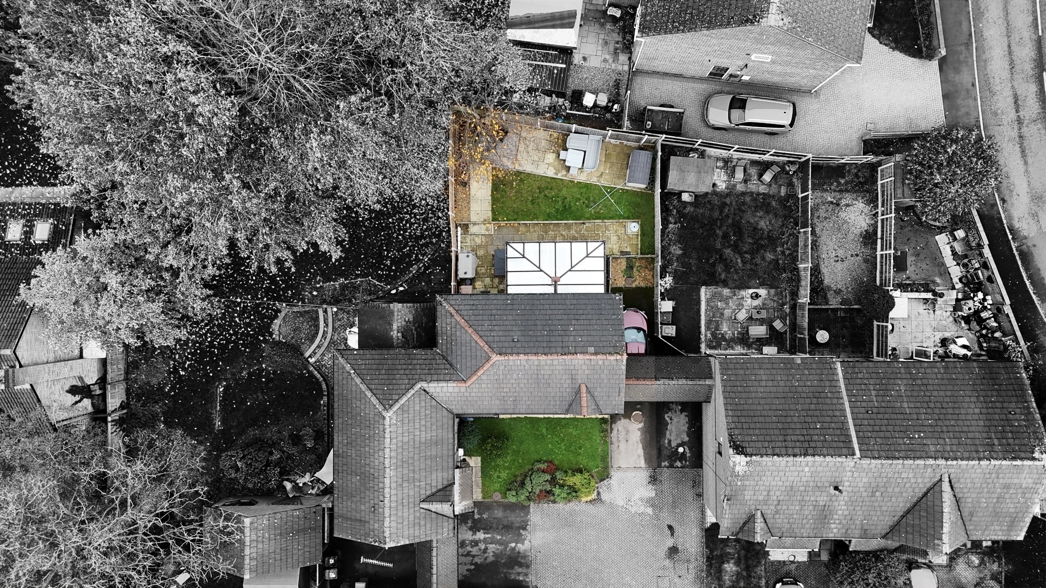 - A front garden with mature shrubbery, and a driveway with a carport, aswell as a rear garden with lawn, decking, and a patio.