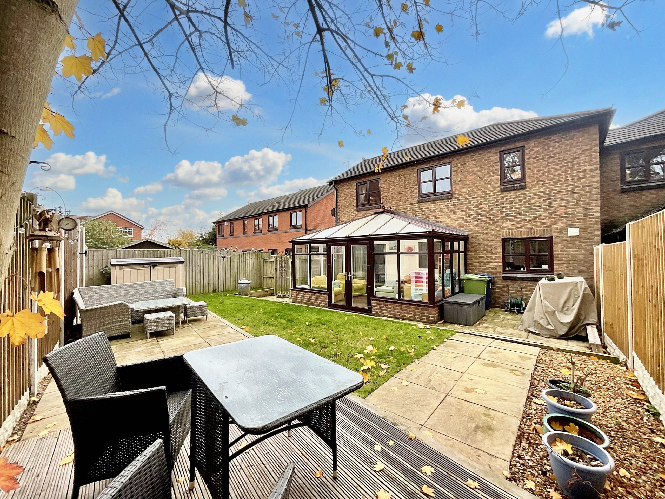 Venture beyond the walls to uncover the final chapter of this home’s story: the great outdoors. At the front, a tarmac driveway with carport provides practical shelter, while the front garden’s mature greenery offers a welcoming first impression. Continue your exploration to the rear garden, a green oasis featuring a lawn for play and adventure, a decking area ideal for basking in the sun, and a patio perfect for evening gatherings under the stars.