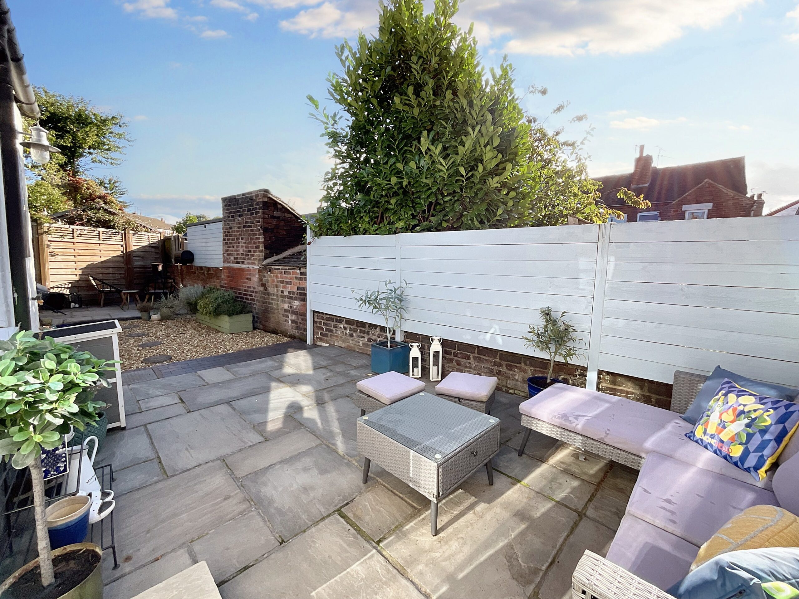 - Low-maintenance rear garden with two patio seating areas and a gravelled mid-section.