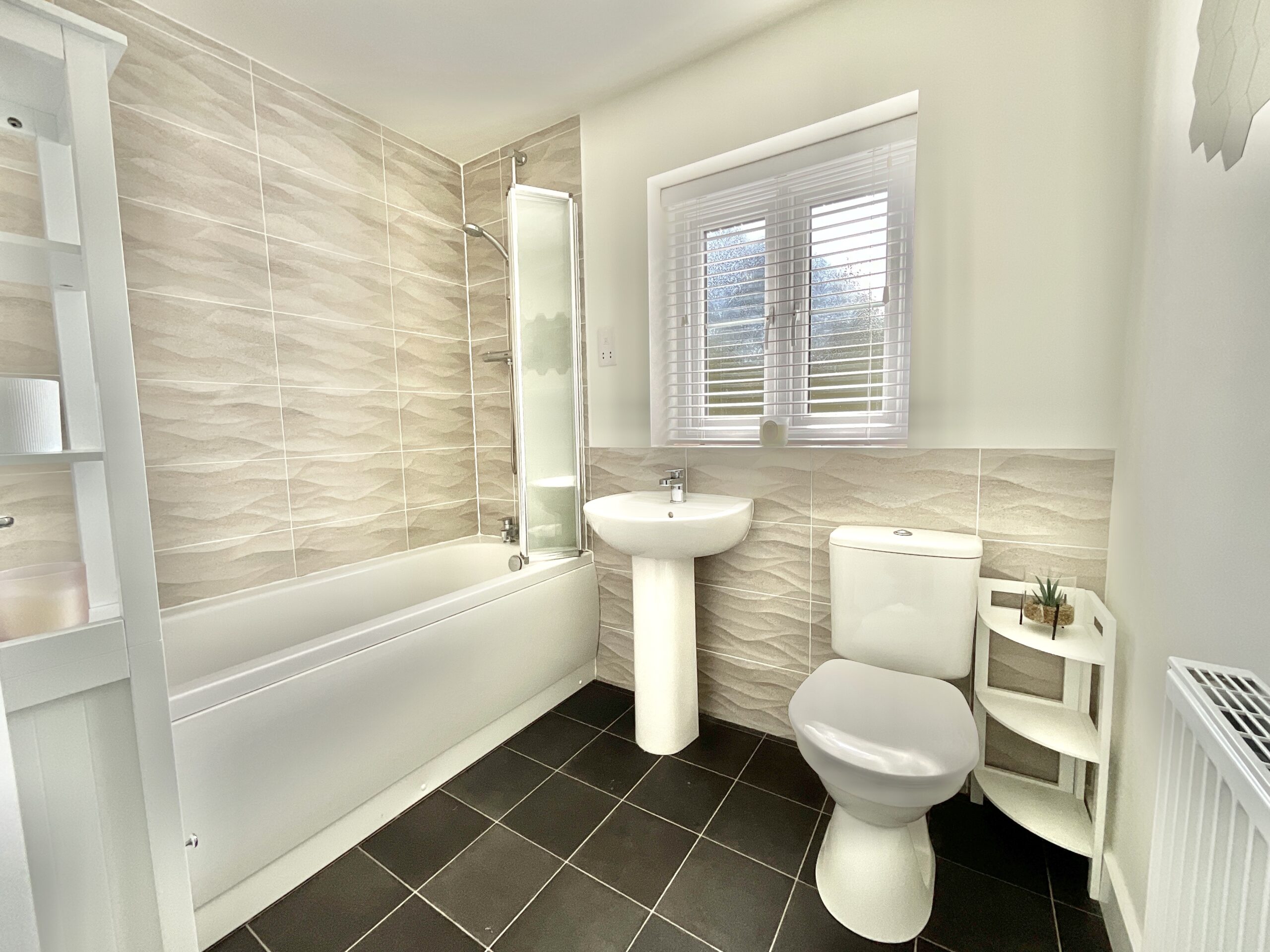 The family bathroom is equally well-appointed, featuring a full-size tub with overhead shower and contemporary grey tiles that brighten the space.