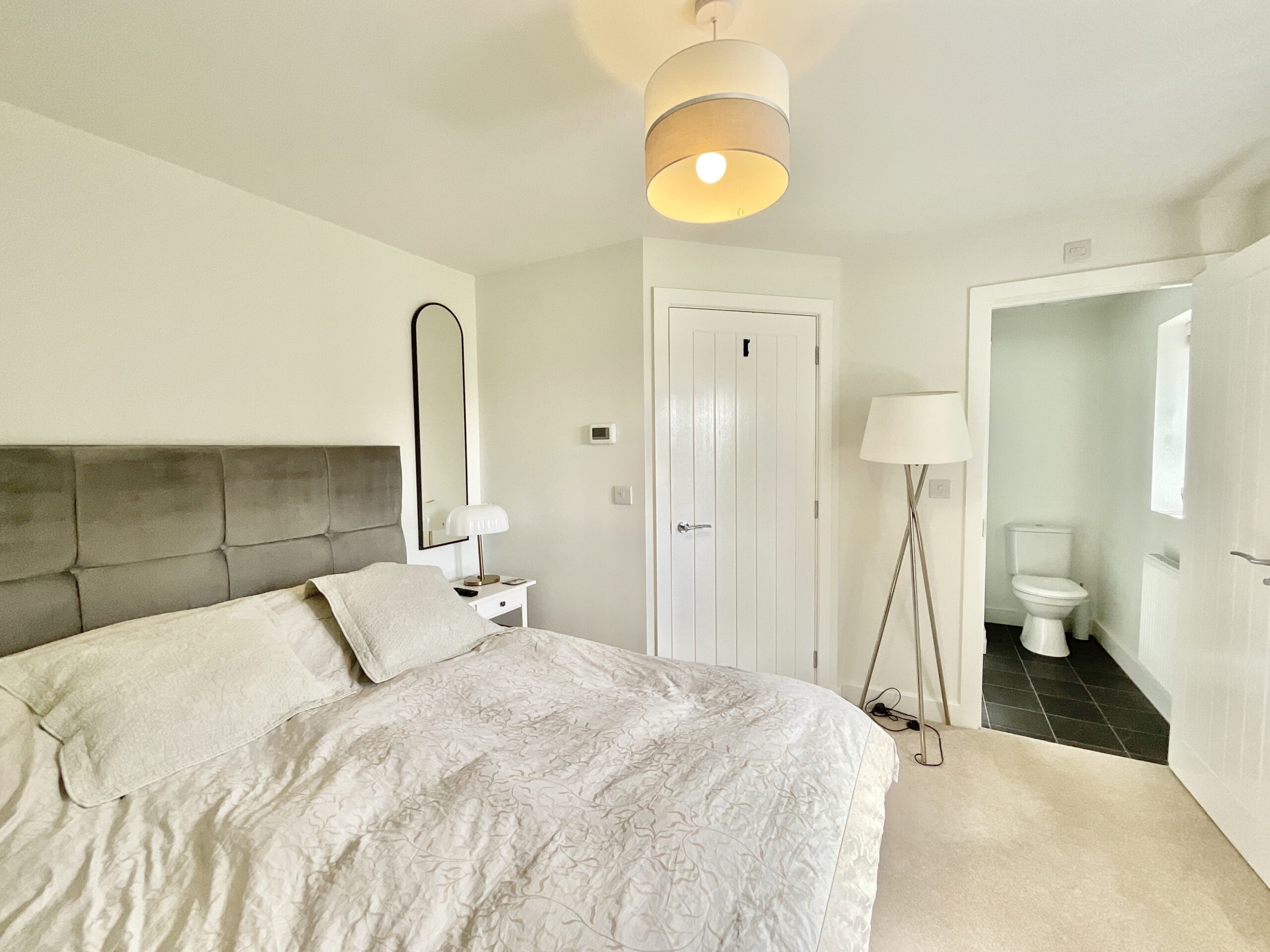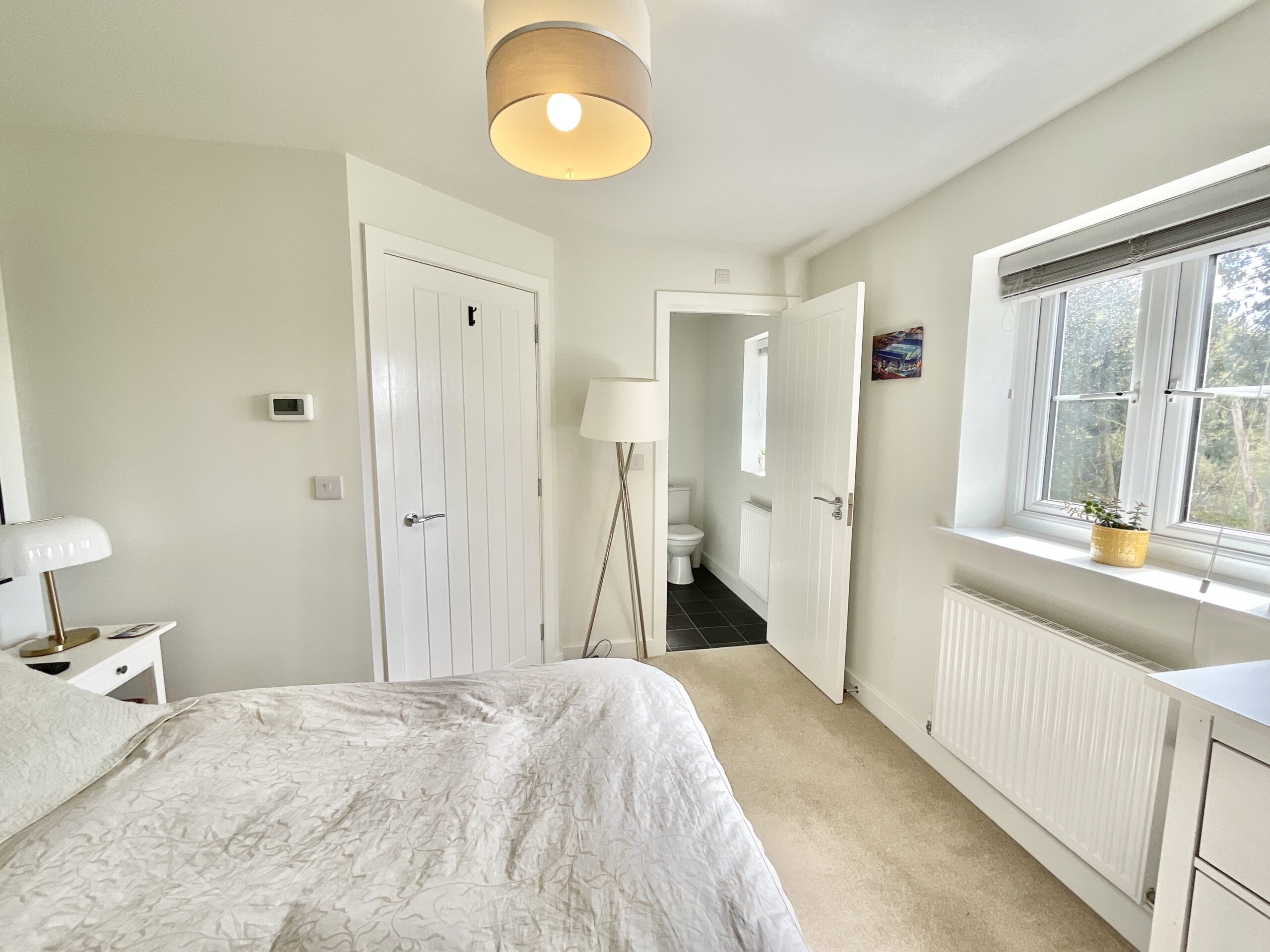 4. Upstairs, the spacious master bedroom enjoys calming views and features a modern ensuite with sleek tiling and a corner shower, providing a comfortable and stylish private retreat.
