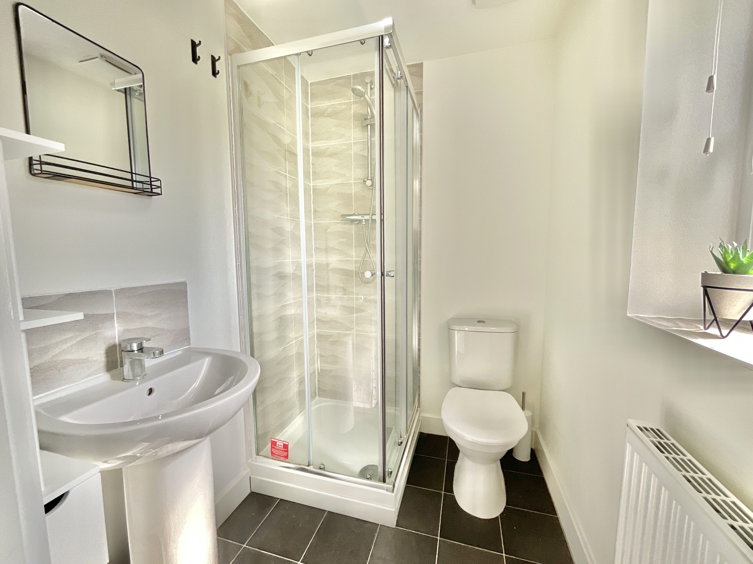 Upstairs, the sense of space continues with a stunning master bedroom positioned to capture those same tranquil park views, comfortably accommodating a large double bed and benefiting from a sleek private ensuite with stylish grey tiling and a corner shower.