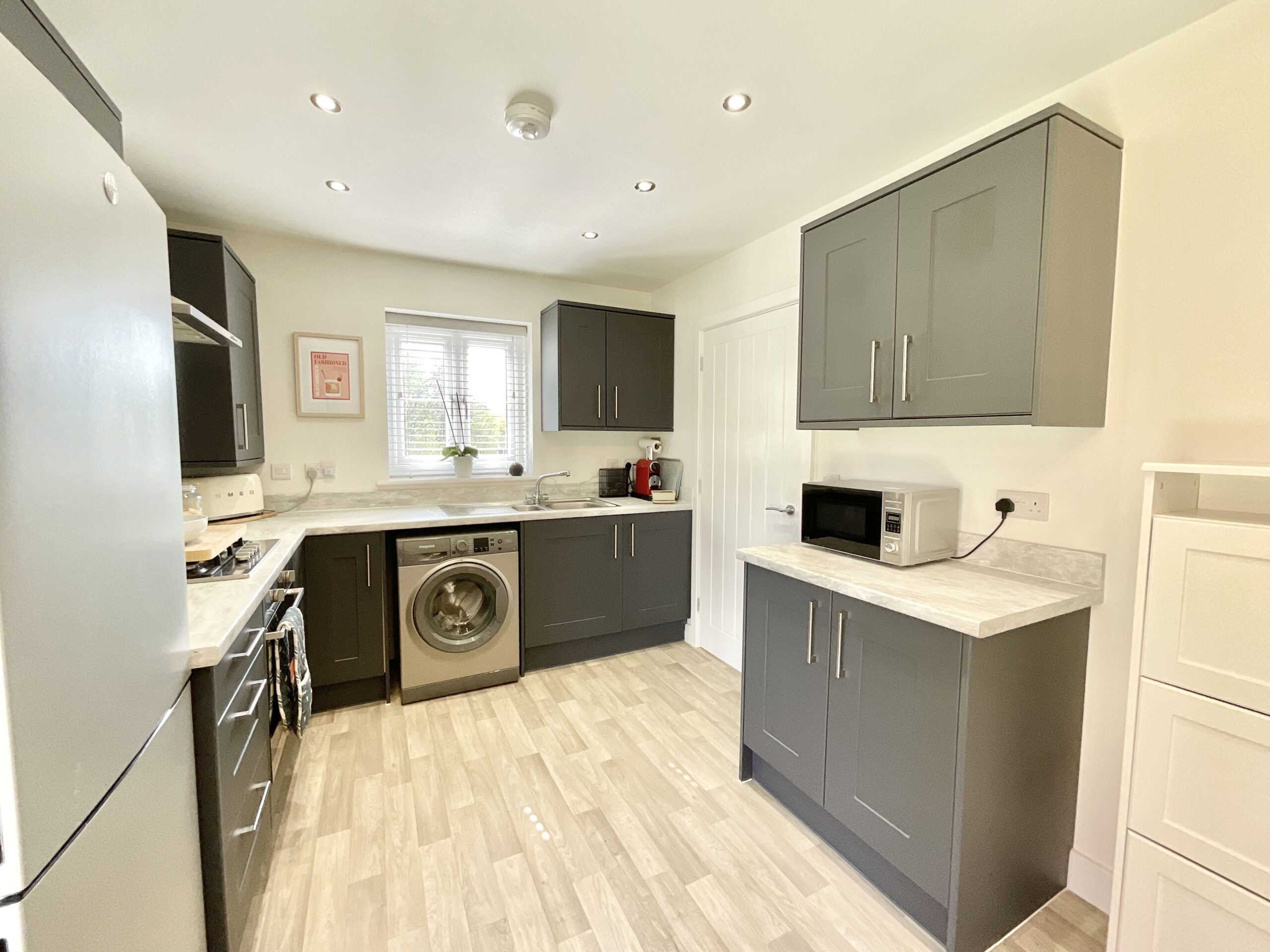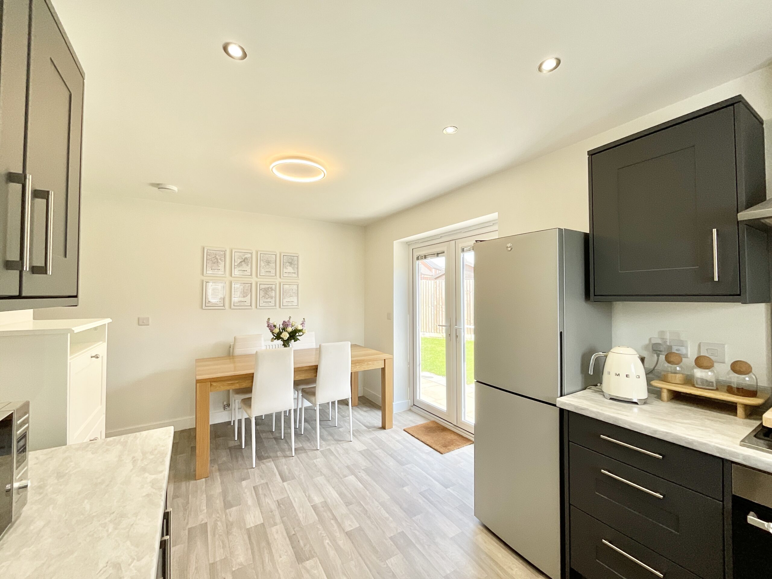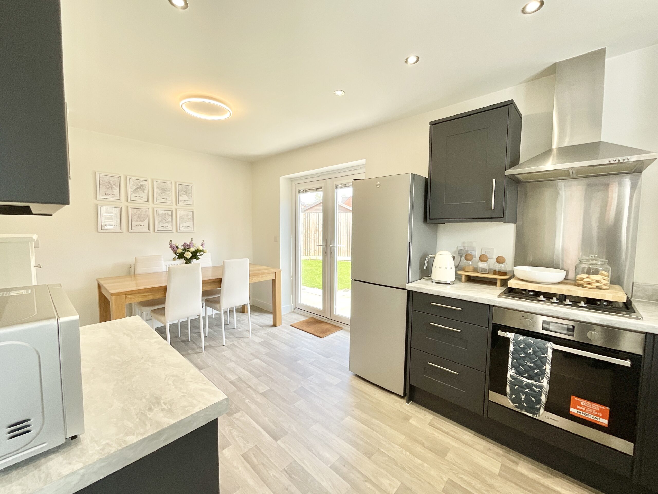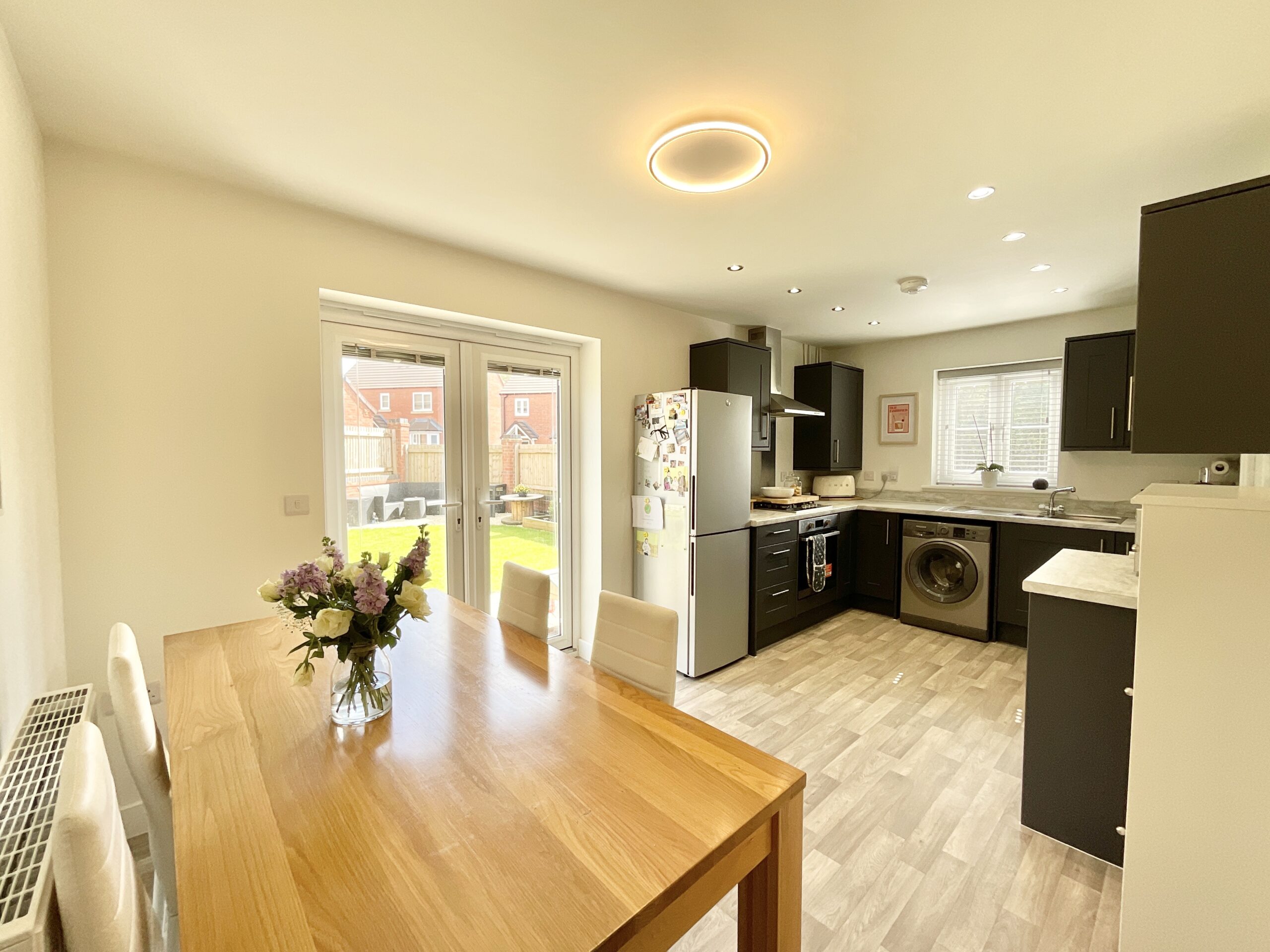 3. The open-plan kitchen diner offers a versatile and sociable space, complete with room for essential appliances, dining, and direct access through double doors to your own private garden space.