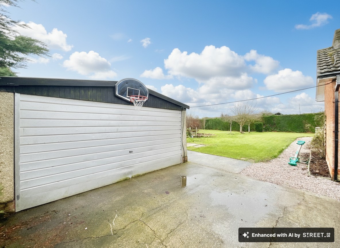 The exterior of this bungalow is equally impressive, boasting extensive gardens with lush lawns, mature hedges, and privacy-enhancing trees. The large patio and seating areas provide idyllic settings for outdoor entertaining, enhanced by charming stone wall features and scenic countryside views. A spacious gravel driveway and detached garage offer ample off-road parking and storage options, while a second secure gated entrance offers further parking for a motorhome or caravan.