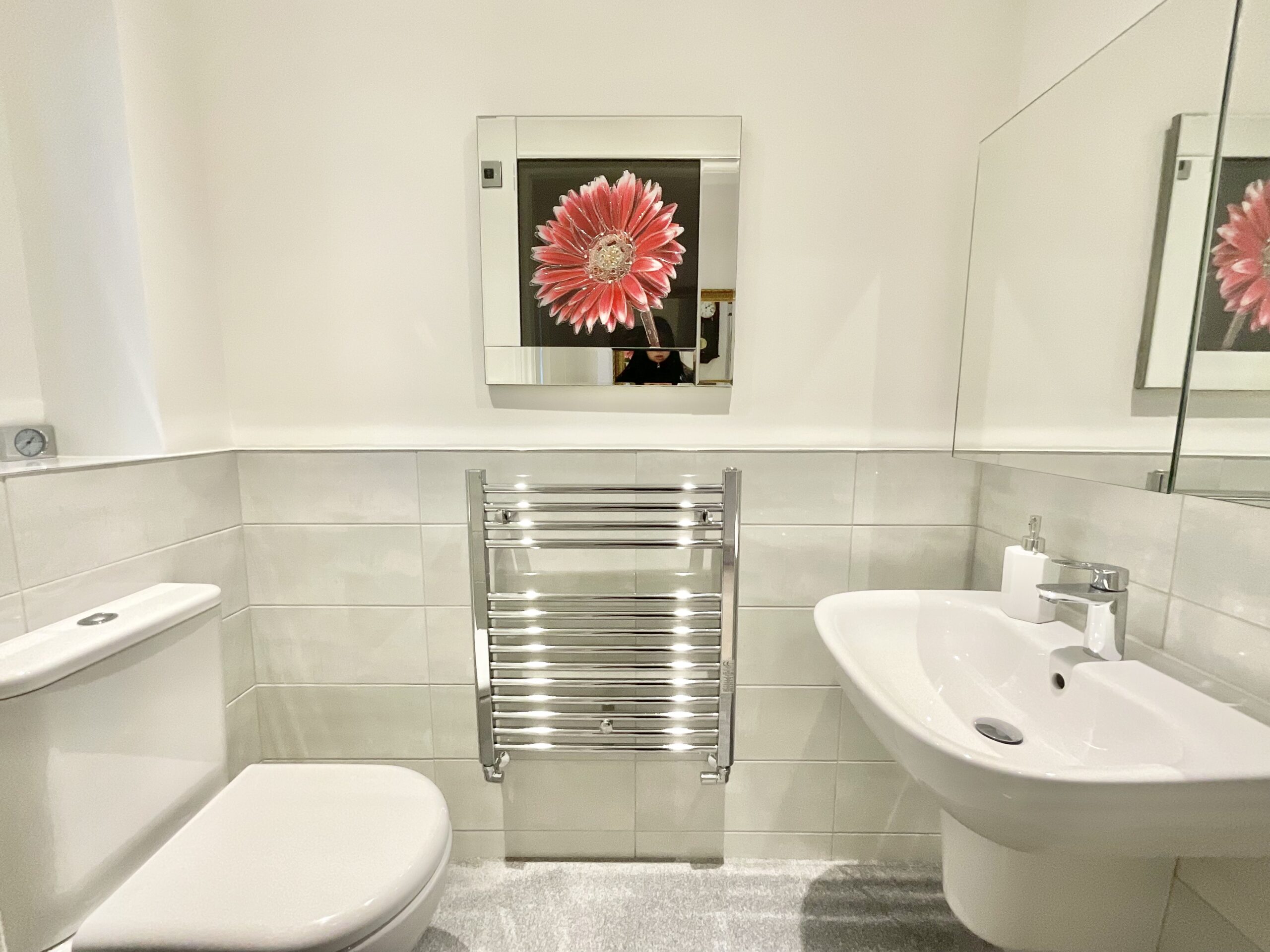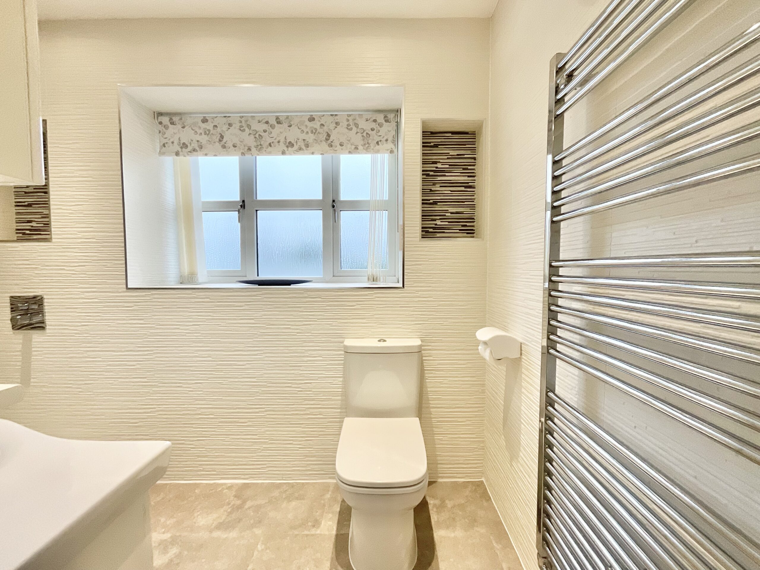 The heart of this home is an open-plan kitchen/living/dining space offering a sleek kitchen with shaker-style base and overhead cabinetry, an integrated fridge/freezer, double oven, microwave, dishwasher, wine cooler, and a five-burner gas hob. A floor-to-ceiling picture window overlooks the rear garden, perfectly blending the indoors and outdoors. Off the kitchen you’ll find a convenient utility room, and completing the ground floor is a handy W/C and storage cupboard.
