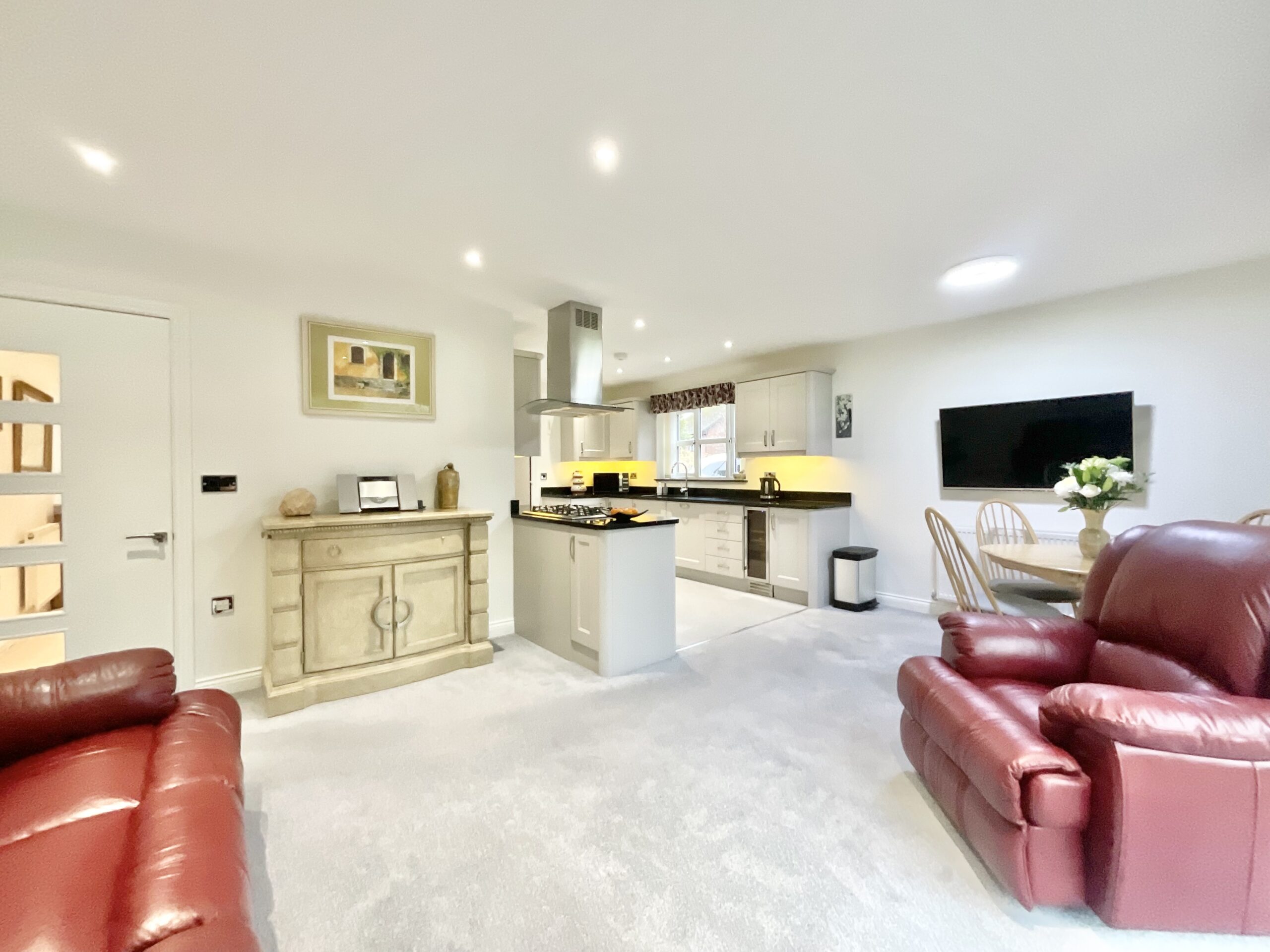 3. Bright and spacious living room with bay window, French doors and hidden log burner. Open-plan kitchen/living/dining with shaker-style kitchen and a range of integrated appliances.