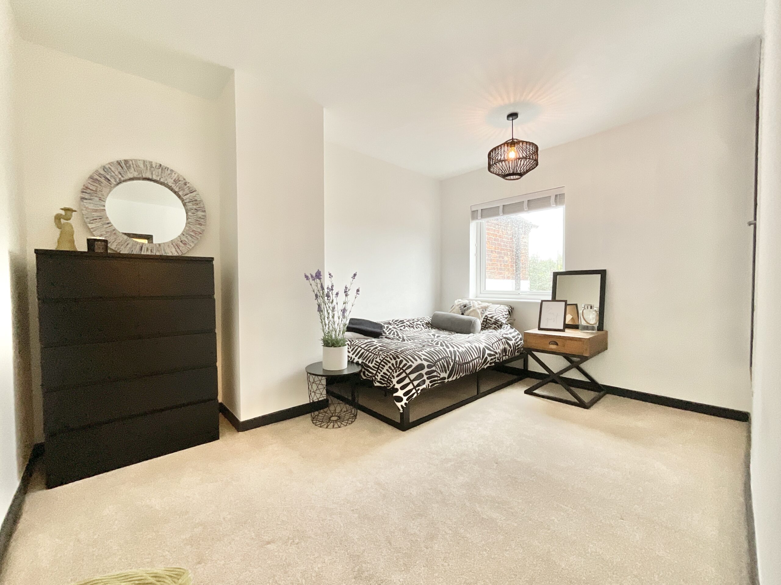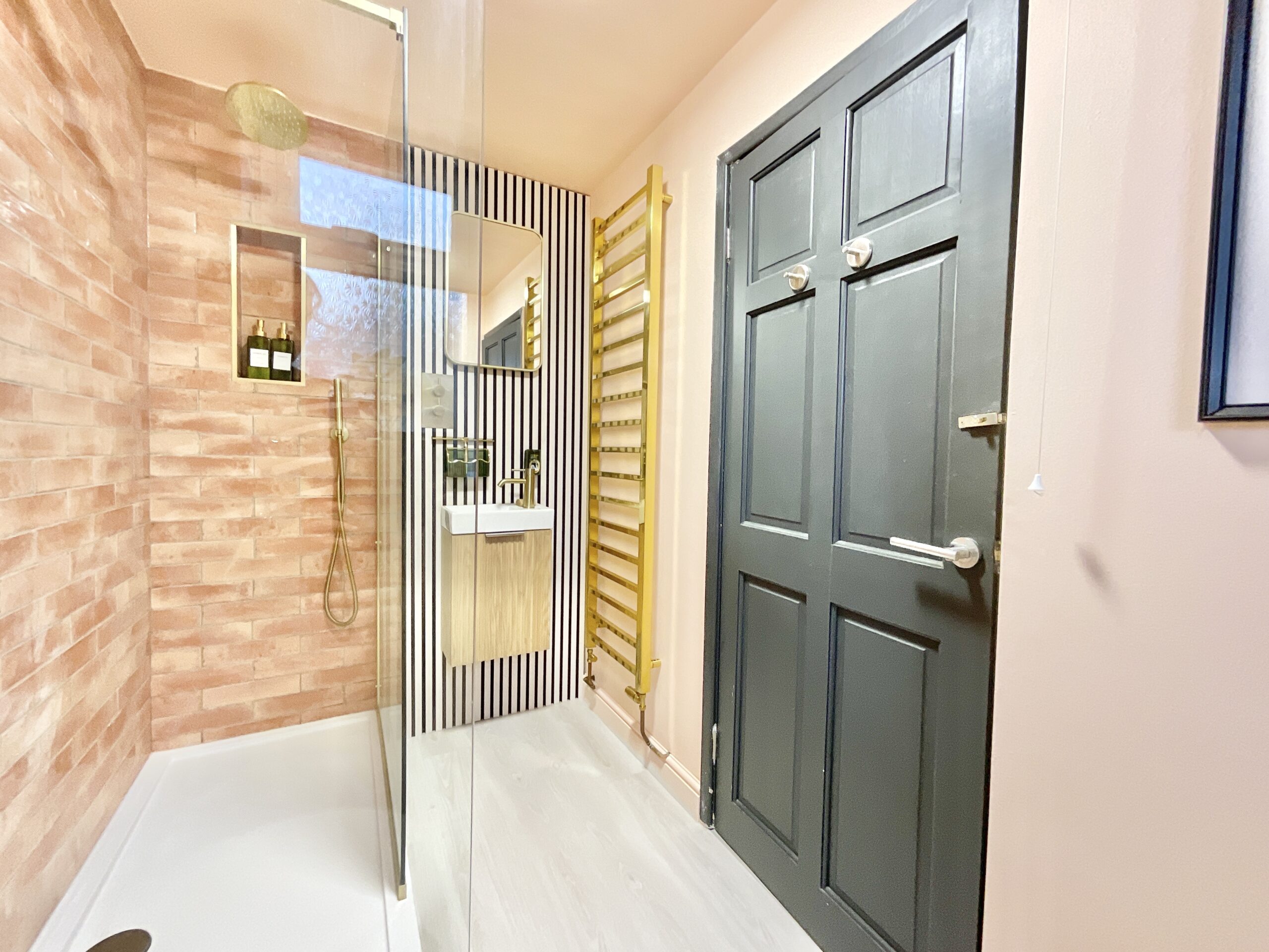 Through the front door, a welcoming living room flows seamlessly into a characterful dining area, both blossoming with elegant wood floors, stylish features and modern accents. Perfect for curling up with a book or entertaining guests, these versatile spaces are designed to make life flourish. The kitchen is a real show-stopper, with granite countertops, ample storage and a bright, functional layout to make any budding chef’s heart bloom. Just off this space, the ground-floor bathroom really makes a statement with a walk-in shower, chic tiling and a vertical botanical feature wall that adds a touch of tranquility. Upstairs, you’ll find two generously sized double bedrooms. Both are bathed in natural light thanks to large windows, with neutral décor and plush carpeting creating a petal-soft, restful retreat. The second bedroom even comes with built-in storage, the perfect little bonus!