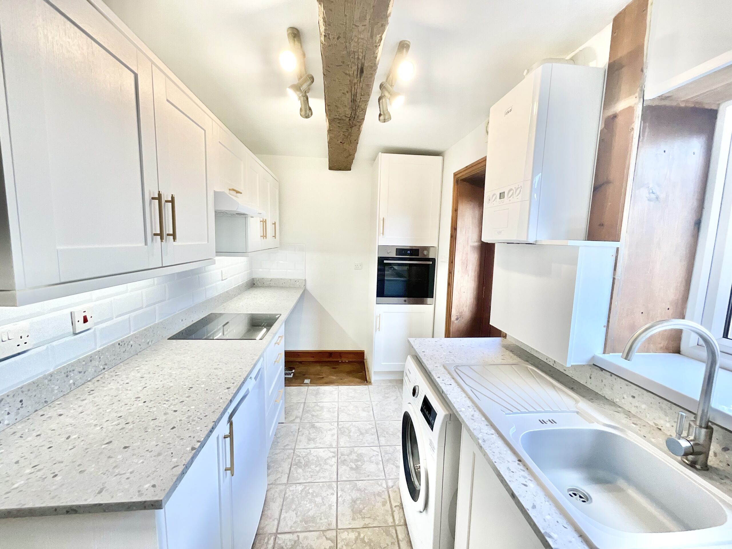 2. The kitchen boasts white shaker cabinets, with lots of storage topped with a grey stone effect worktop.