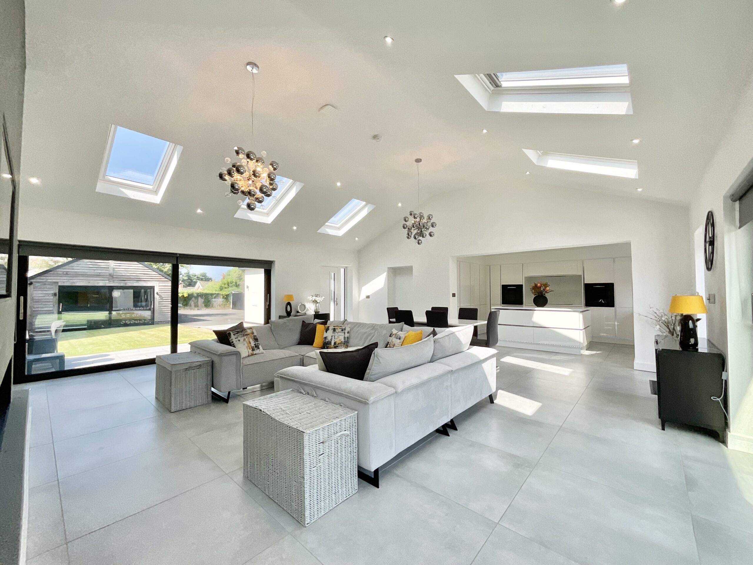 - Expansive and bright open-plan kitchen/living/dining boasting vaulted ceiling, skylights, aluminium sliding doors, and a fully fitted kitchen with integrated appliances.